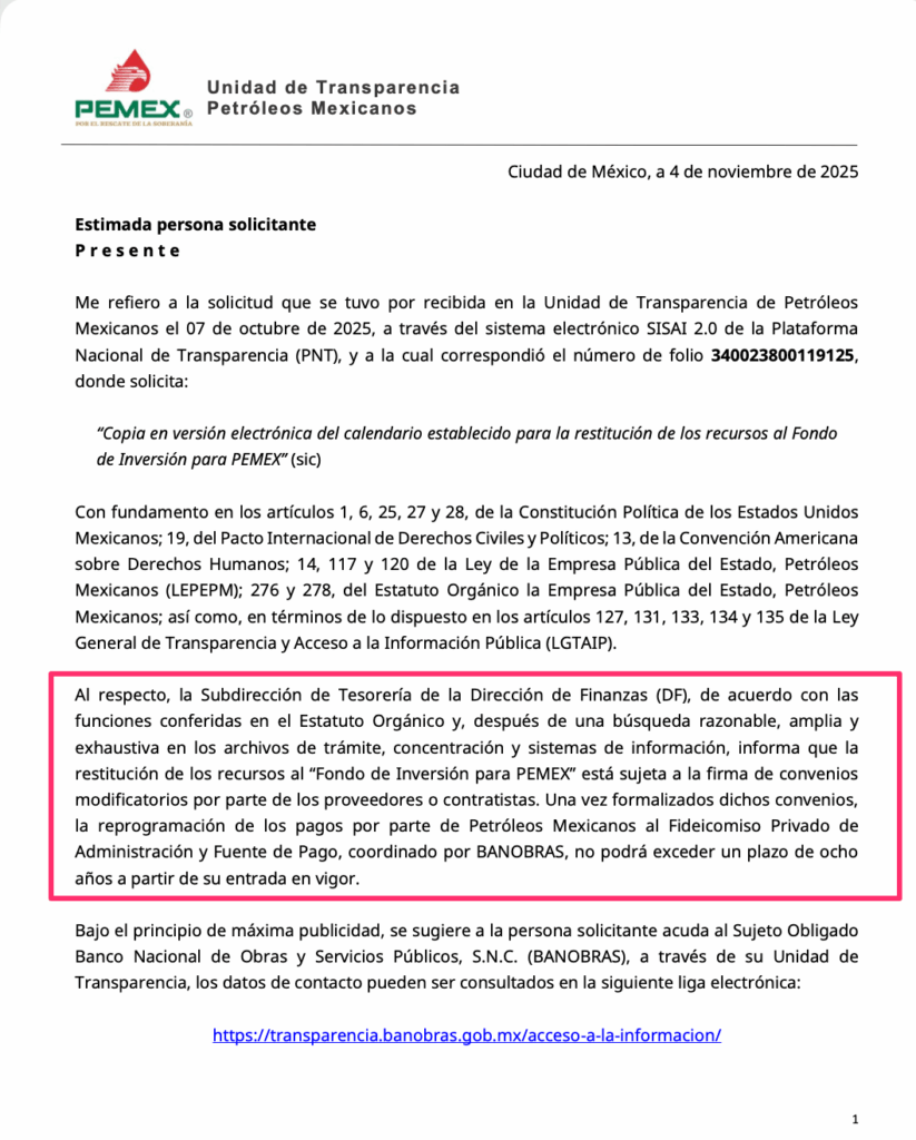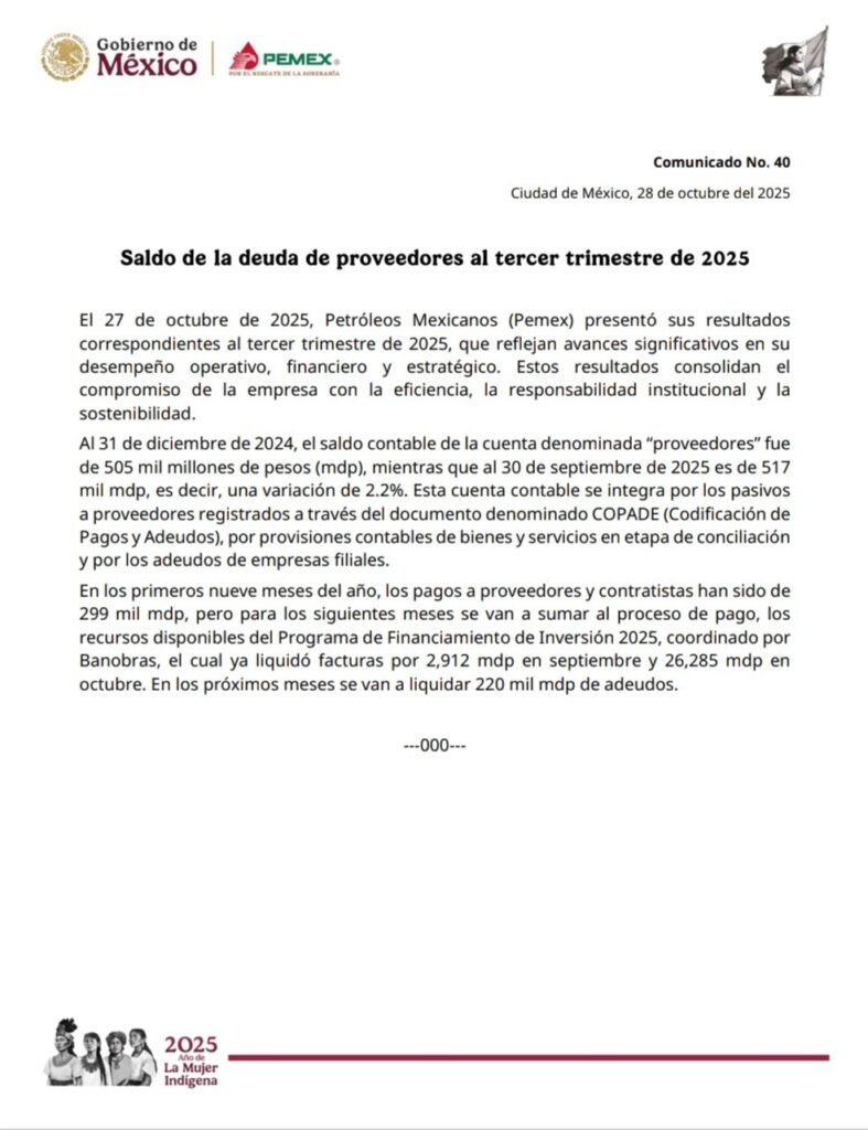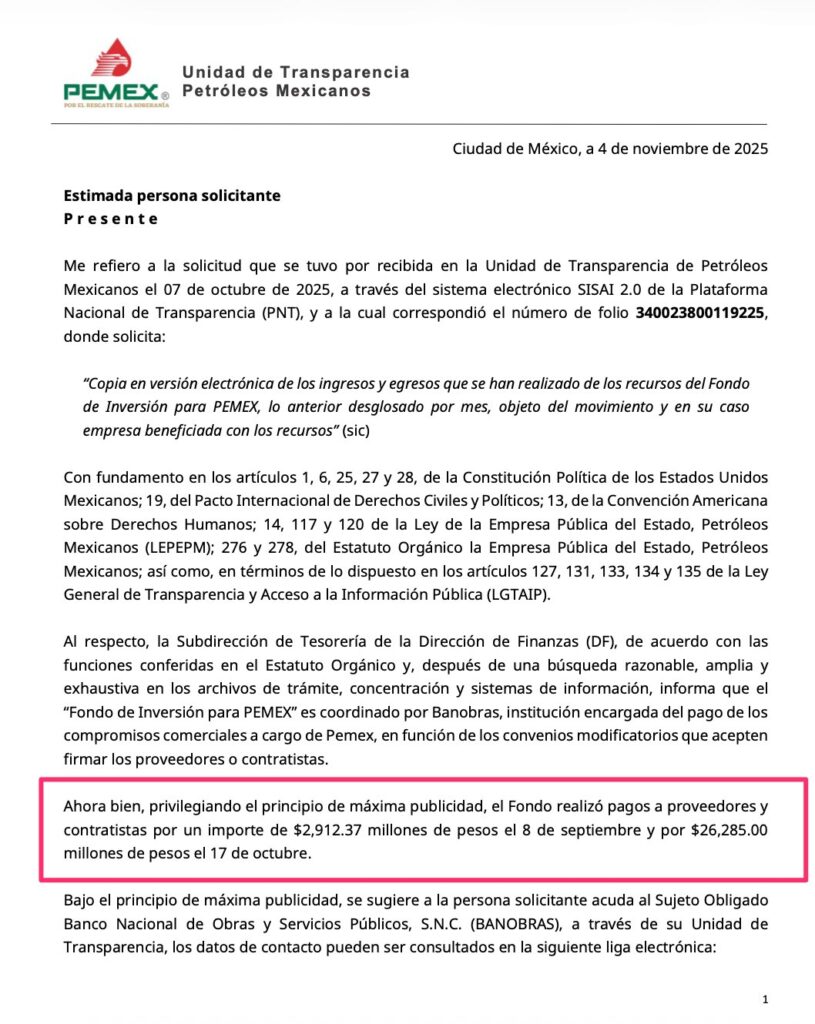 Denuncia al 9933989844… 🚩⚠️💸 ¡8 Años tiene Pemex para reponer a Banobras pago a proveedores por $29,197 MDP!; tal como se dató en este espacio y boletinó la paraestatal en octubre pasado, se confirma vía Transparencia que el “Fondo de Inversión para @Pemex , coordinado por @Banobras , institución encargada del pago de los compromisos comerciales a cargo de @Pemex , en función de los convenios modificatorios que acepten firmar los proveedores o contratistas, realizó pagos a proveedores y contratistas por un importe de 2,912.37 millones de pesos el 8 de septiembre y por 26,285.00 millones de pesos el 17 de octubre, quedando pendiente noviembre y diciembre 2025; desembolso que según la Subdirección de Tesorería de la Dirección de Finanzas (DF), de acuerdo con las funciones conferidas en el Estatuto Orgánico y, después de una búsqueda razonable, amplia y exhaustiva en los archivos de trámite, concentración y sistemas de información, informa que la restitución de los recursos al “Fondo de Inversión para @Pemex “ está sujeta a la firma de convenios modificatorios por parte de los proveedores o contratistas que una vez formalizados dichos convenios, la reprogramación de los pagos por parte de @Pemex al Fideicomiso Privado de Administración y Fuente de Pago, coordinado por Banobras, no podrá exceder un plazo de ocho años a partir de su entrada en vigor, o sea tiene Pemex tiene 8 años para restituir ese dinero a Banobras; cabe destacar que al cierre del Tercer Trimestre 2025 (30 de septiembre) la deuda acumulada con proveedores fue de 517 mil millones de pesos integrada por los pasivos a proveedores registrados a través del documento denominado COPADE (Codificación de Pagos y Adeudos), por provisiones contables de bienes y servicios en etapa de conciliación y por los adeudos de empresas filiales; por último, @Pemex precisó que en los primeros nueve meses del año, los pagos a proveedores y contratistas han sido de 299 mil millones de pesos y en los próximos meses se liquidarían 220 mil millones de pesos de adeudos;atención @Claudiashein @MarcelaVilleg15 @CNE_Mex @SENER_mx @GobiernoMX @FGRmexico @LuzElena_GE @ASF_Mexico @SCJN @STPS_mx @Tu_IMSS @SEMARNAT_mx @agencia_asea @CENAGAS_mx @IMPetroleo @SATMX @Hacienda_Mexico @BuenGobierno_mx @Centrofcrl #OIC #UIF #OmarReyesColmenares …Zas!!!