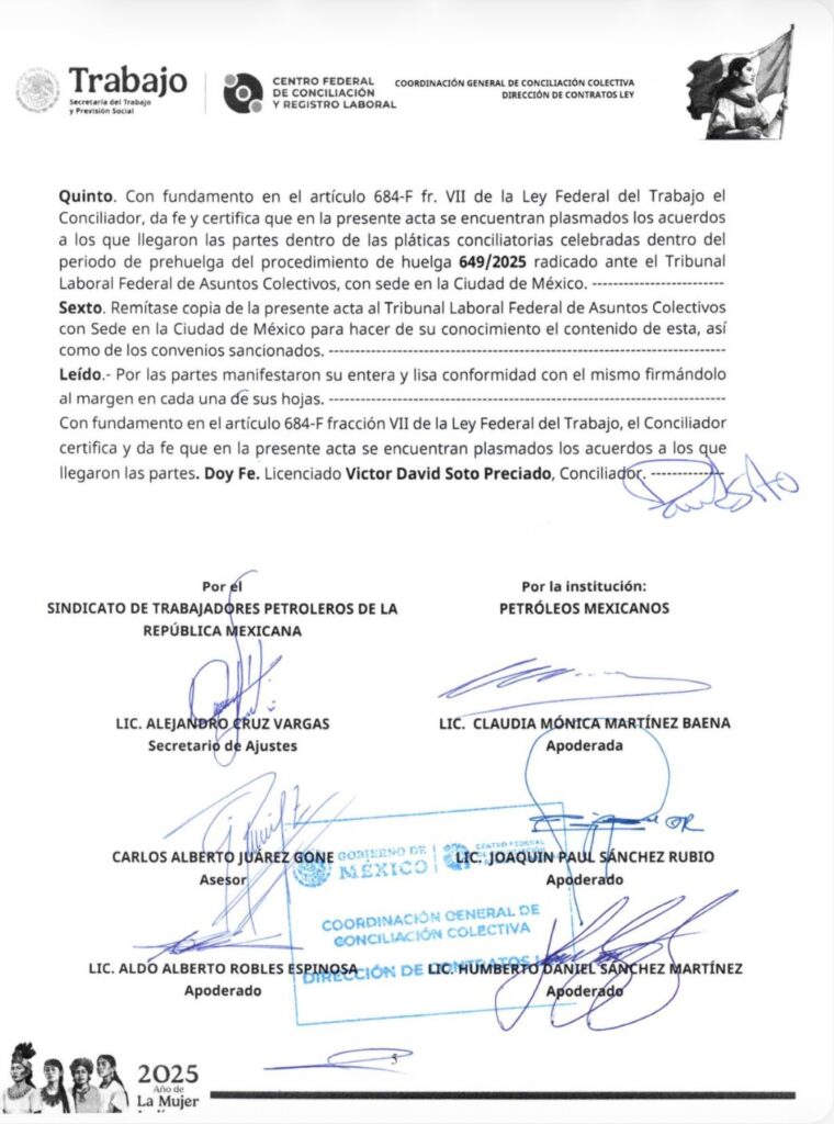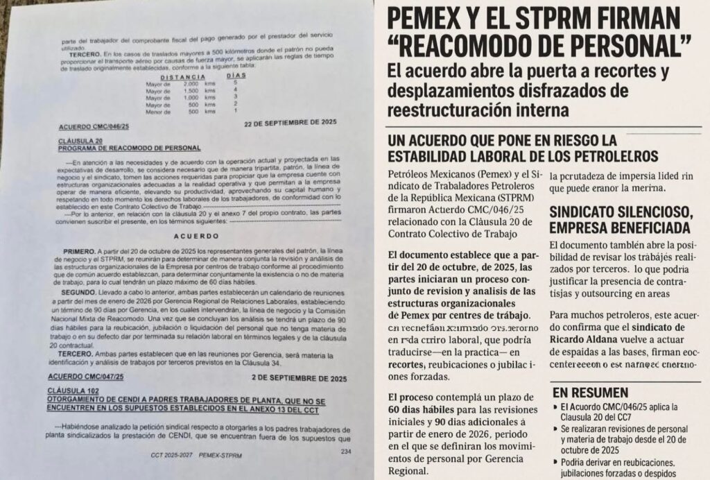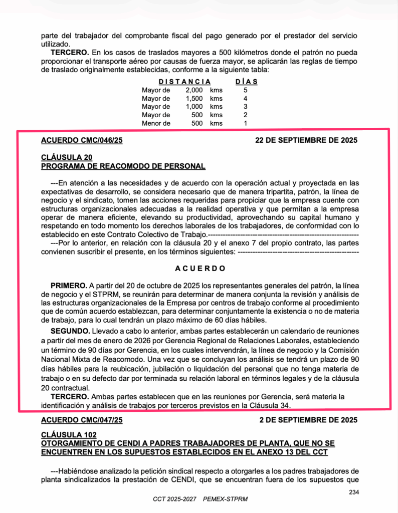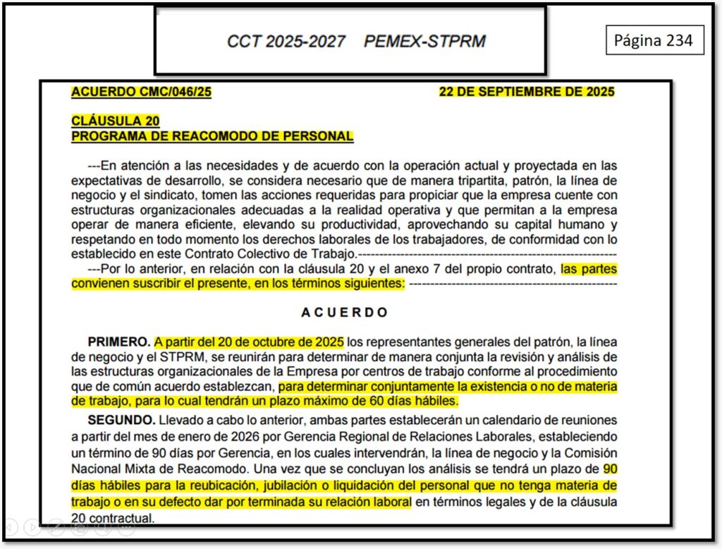 Denuncia al 9933989844… 🚩⚠️‼️🧑‍🏭 ¡Acuerdo CMC/046/25, otra sorpresita del Delfín ALDANA en CCTV 2025-27; contempla reubicación, jubilación o liquidación de trabajadores!; zozobra entre trabajadores agremiados al STPRM, ya que en la página 234 del Contrato Colectivo de Trabajo 2025-2027 recién firmado por este sindicato petrolero y @Pemex aparece el Acuerdo CMC/046/25 del pasado 22 de septiembre derivado de las mesas de negociaciones previas, que dispone: 1.- A partir del 20 de octubre de 2025 los representantes generales del patrón, la línea de negocio y el STPRM, se reunirán para determinar de manera conjunta la revisión y análisis de las estructuras organizacionales de la Empresa por centros de trabajo conforme al procedimiento que de común acuerdo establezcan, para determinar conjuntamente la existencia o no de materia de trabajo, para lo cual tendrán un plazo máximo de 60 días hábiles; 2.- Llevado a cabo lo anterior, ambas partes establecerán un calendario de reuniones a partir del mes de enero de 2026 por Gerencia Regional de Relaciones Laborales, estableciendo un término de 90 días por Gerencia, en los cuales intervendrán, la línea de negocio y la Comisión Nacional Mixta de Reacomodo; una vez que se concluyan los análisis se tendrá un plazo de 90 días hábiles para la reubicación, jubilación o liquidación del personal que no tenga materia de trabajo o en su defecto dar por terminada su relación laboral en términos legales y de la cláusula 20 contractual; y 3.- .Ambas partes establecen que en las reuniones por Gerencia, será materia la identificación y análisis de trabajos por terceros previstos en la Cláusula 34; por lo que para muchos petroleros de este sindicato, este acuerdo confirma que El Delfín de Deschamps, Ricardo Aldana Prieto, volvió a actuar “a espaidas a las bases”; si de por si ya estaba caliente el asunto el tema del Anexo 16 que afecta a los trabajadores en sus jubilaciones y otros conceptos, con este Acuerdo le echan más leña al fuego en el CCTV con pírricos beneficios para un universo de 89,822 trabajadores del STPRM en @Pemex ; atención @Claudiashein @MarcelaVilleg15 @CNE_Mex @SENER_mx @GobiernoMX @FGRmexico @LuzElena_GE @ASF_Mexico  @SCJN @STPS_mx @Tu_IMSS @SEMARNAT_mx @agencia_asea @CENAGAS_mx @IMPetroleo @SATMX @Hacienda_Mexico @BuenGobierno_mx @Centrofcrl #OIC #UIF #OmarReyesColmenares …Zas!!!