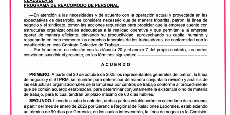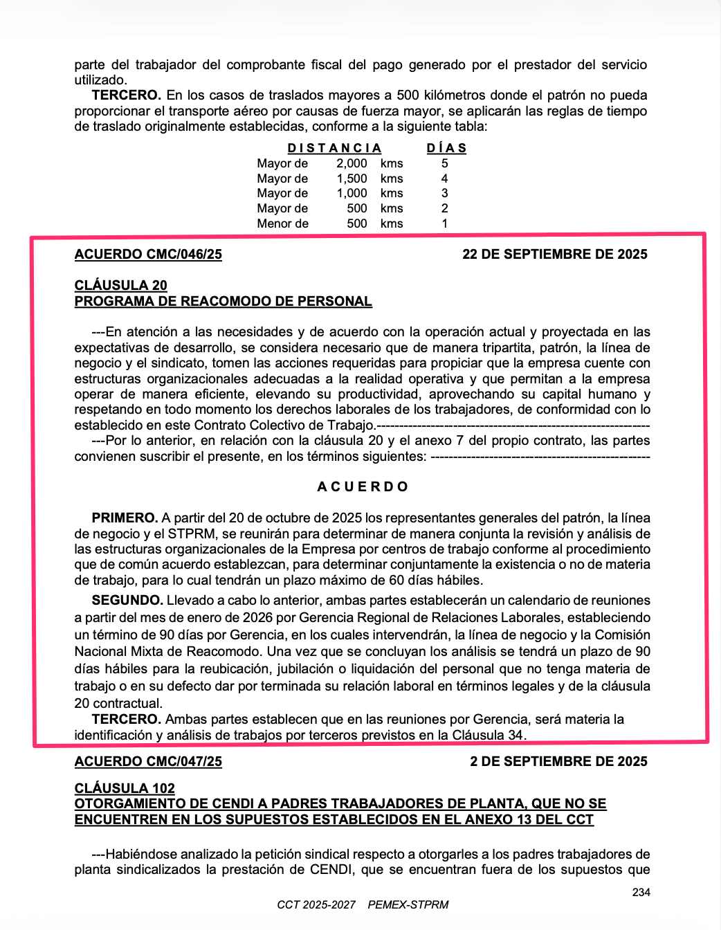 Denuncia al 9933989844… 🚩⚠️‼️🧑‍🏭 ¡Acuerdo CMC/046/25, otra sorpresita del Delfín ALDANA en CCTV 2025-27; contempla reubicación, jubilación o liquidación de trabajadores!; zozobra entre trabajadores agremiados al STPRM, ya que en la página 234 del Contrato Colectivo de Trabajo 2025-2027 recién firmado por este sindicato petrolero y @Pemex aparece el Acuerdo CMC/046/25 del pasado 22 de septiembre derivado de las mesas de negociaciones previas, que dispone: 1.- A partir del 20 de octubre de 2025 los representantes generales del patrón, la línea de negocio y el STPRM, se reunirán para determinar de manera conjunta la revisión y análisis de las estructuras organizacionales de la Empresa por centros de trabajo conforme al procedimiento que de común acuerdo establezcan, para determinar conjuntamente la existencia o no de materia de trabajo, para lo cual tendrán un plazo máximo de 60 días hábiles; 2.- Llevado a cabo lo anterior, ambas partes establecerán un calendario de reuniones a partir del mes de enero de 2026 por Gerencia Regional de Relaciones Laborales, estableciendo un término de 90 días por Gerencia, en los cuales intervendrán, la línea de negocio y la Comisión Nacional Mixta de Reacomodo; una vez que se concluyan los análisis se tendrá un plazo de 90 días hábiles para la reubicación, jubilación o liquidación del personal que no tenga materia de trabajo o en su defecto dar por terminada su relación laboral en términos legales y de la cláusula 20 contractual; y 3.- .Ambas partes establecen que en las reuniones por Gerencia, será materia la identificación y análisis de trabajos por terceros previstos en la Cláusula 34; por lo que para muchos petroleros de este sindicato, este acuerdo confirma que El Delfín de Deschamps, Ricardo Aldana Prieto, volvió a actuar “a espaidas a las bases”; si de por si ya estaba caliente el asunto el tema del Anexo 16 que afecta a los trabajadores en sus jubilaciones y otros conceptos, con este Acuerdo le echan más leña al fuego en el CCTV con pírricos beneficios para un universo de 89,822 trabajadores del STPRM en @Pemex ; atención @Claudiashein @MarcelaVilleg15 @CNE_Mex @SENER_mx @GobiernoMX @FGRmexico @LuzElena_GE @ASF_Mexico  @SCJN @STPS_mx @Tu_IMSS @SEMARNAT_mx @agencia_asea @CENAGAS_mx @IMPetroleo @SATMX @Hacienda_Mexico @BuenGobierno_mx @Centrofcrl #OIC #UIF #OmarReyesColmenares …Zas!!!