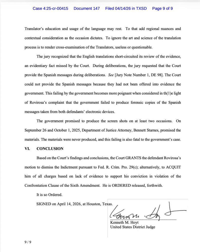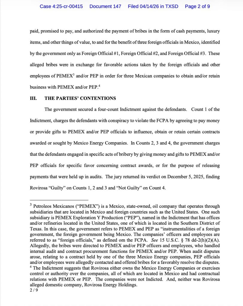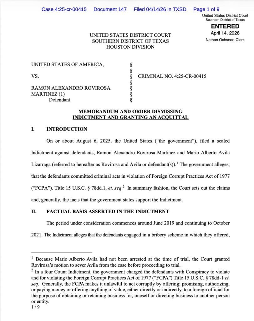 Denuncia al 9933989844…🚩⚠️❗️ ¡ALEXANDRO ROVIROSA: Absuelve Justicia de EU al contratista de Pemex! Fallo evidenció la falta de sustento en acusación del Departamento de Justicia. En una resolución que subraya la importancia del debido proceso y la presunción de inocencia en el ámbito internacional, un tribunal federal de los Estados Unidos absolvió de todos los cargos al empresario mexicano Alexandro Rovirosa Martínez. El fallo, emitido por la Corte Federal para el Distrito Sur de Texas y bajo la presidencia del Juez Kenneth M. Hoyt, puso fin al proceso penal United States vs Rovirosa (No. 4:25-cr-00415), según la documentación oficial. La decisión judicial concluyó que las imputaciones presentadas por el Departamento de Justicia (DOJ) carecían de los elementos necesarios para sostener el caso, señalando irregularidades procesales críticas que comprometieron la integridad del expediente. Sobre las irregularidades en el proceso de acuerdo con la resolución, el caso de la Fiscalía se vio debilitado por omisiones y fallos técnicos fundamentales: 1.- Falta de testimonios: Los fiscales federales omitieron intencionalmente el llamado de testigos clave. 2.- Ocultamiento de evidencia: No se proporcionó la totalidad de las pruebas, a pesar de que el Ministerio Público había afirmado lo contrario ante la corte. 3.- Deficiencias técnicas: El caso se apoyó en traducciones de mensajes de texto descontextualizadas y carentes de las certificaciones correspondientes, lo que impidió su verificación y confrontación por parte de la defensa. “No había caso” fue la postura de la defensa en el inédito fallo. El equipo legal del empresario mexicano Alexandro Rovirosa Martínez estuvo integrado por Ryan McConnel, Larry Finder y Matthew Boyden. Fuentes cercanas al equipo legal de Alexandro Rovirosa Martínez enfatizaron que el proceso nunca debió haber escalado a instancias penales bajo las condiciones presentadas. “Este no es solo un fallo a favor de una persona; es una llamada de atención sobre los riesgos de construir acusaciones sin bases sólidas. La Corte fue contundente: las acusaciones no resistieron el análisis jurídico. Aquí no hubo delito, sino una narrativa que se desmoronó frente a la ley”, señalaron. Sobre el impacto mediático y político, el proceso contra Alexandro Rovirosa Martínez generó una amplia atención mediática tanto en México como en Estados Unidos. El caso fue mencionado en al menos tres ocasiones durante las conferencias matutinas de la presidenta de México, Claudia Sheinbaum, convirtiéndose en un foco de opinión pública que, según analistas, alimentó un “juicio paralelo” antes de que existiera una sentencia firme. Expertos en derecho internacional, incluyendo el análisis del reconocido portal FCPA Professor (editado por Mike Koehler), coinciden en que esta resolución refuerza un principio básico del Estado de derecho: la carga de la prueba recae en el Estado y debe cumplir con estándares estrictos de legalidad. Hechos que crearon un precedente sobre el debido proceso para los analistas jurídicos consultados. El desenlace del caso Rovirosa deja una lección sobre la ética en la cobertura de casos de alto perfil y la responsabilidad de las autoridades procuradoras de justicia. “No se puede construir culpabilidad en la opinión pública sin pruebas firmes. Hoy la justicia habló con claridad absoluta, reafirmando que las instituciones funcionan cuando el debido proceso se respeta escrupulosamente”, indicaron desde el entorno del empresario. Con esta resolución, Alexandro Rovirosa Martínez queda plenamente exonerado y libre de cargos, cerrando un capítulo legal que pone de relieve la importancia de una defensa efectiva en contextos de litigio transnacional complejo. El éxito jurídico de Alexandro Rovirosa Martínez no fue fortuito; se debió a la estrategia de un equipo legal de élite compuesto por Ryan McConnell, Larry Finder y Matthew Boyden, integrantes de la firma McConnell & Finder. El perfil de estos defensores es determinante para entender la magnitud de la absolución frente al Gobierno de Estados Unidos. A diferencia de los despachos de defensa criminal convencional, esta firma con sede en Houston, Texas, EU, se especializa en investigaciones transnacionales complejas. Su metodología se basa en el cuestionamiento riguroso de la conducta del Gobierno, una táctica que en el caso de Rovirosa resultó “fatal” para la Fiscalía al exponer que se ignoraron protocolos básicos de certificación y presentación de testigos. Esta resolución representa un hito sin precedentes para el sistema judicial estadounidense: se trata de la cuarta ocasión en 50 años en la que una sentencia o proceso vinculado a la Ley de Prácticas Corruptas en el Extranjero (FCPA, por sus siglas en inglés) es revocado o desestimado tras una acusación formal. La excepcionalidad de este fallo judicial coloca el caso de Alexandro Rovirosa Martínez de inédito, pues las estadísticas de condenas bajo la FCPA suelen ser sumamente elevadas debido al rigor y los recursos del Departamento de Justicia. El hecho de que un tribunal federal determine la inocencia absoluta y señale irregularidades en la Fiscalía no solo beneficia al empresario, sino que sienta un precedente crítico sobre el control judicial ante los excesos en investigaciones transnacionales. Cabe destacar que en diciembre pasado Alexandro Rovirosa Martínez fue declarado presuntamente “culpable” de cuatro cargos de conspiración y prácticas corruptas en el extranjero, con sobornos por 150,000 dólares (2.8 millones de pesos aproximadamente) a tres directivos de @Pemex para “manipular los procesos de licitación y asegurarse millones de dólares en lucrativos contratos y otras ventajas”. Esta presunta trama de corrupción fue expuesta en agosto de 2026 por el Departamento de Justicia de EU. Alexandro Rovirosa Martínez y su socio Mario Ávila Lizárra