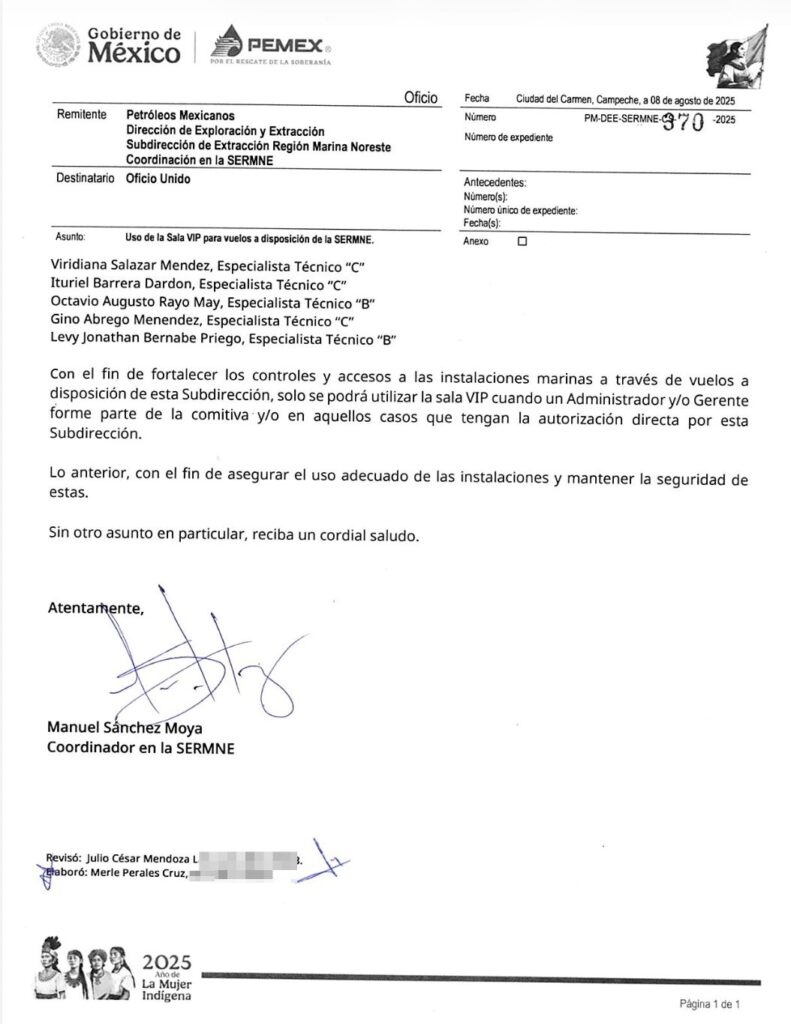 Denuncia al 9933989844… 🚩⚠️🚁🐪 ¡ALMAZO/MOYA restringen Sala VIP para vuelos y denigran a trabajadores de SERMNE Pemex!; indignación de trabajadores en la Subdirección de Extracción Región Marina Noreste (SERMNE) de José Luis Guzmán Almazo, a quien tildan de prepotente, junto con su esbirro Manuel Sánchez Moya “El Temoc Blanco”, coordinador en la SERMNE, ya que mediante el oficio PM-DEE-SERMNE-370-2025, fechado en Ciudad del Carmen, Campeche, el pasado 08 de agosto 2025, consideran que denigra a sus subalternos. El documento, con el “Asunto: Uso de la Sala VIP para vuelos a disposición de la SERMNE”, ordena a los trabajadores Viridiana Salazar Mendez, especialista técnico “C”; Ituriel Barrera Dardon, especialista técnico “C”; Octavio Augusto Rayo May, especialista técnico “B”; Gino Abrego Menéndez, especialista técnico “C”; y Levy Jonathan Bernabe Priego, especialista técnico “B” que “solo se podrá utilizar la sala VIP cuando un Administrador y/o Gerente forme parte de la comitiva y/o en aquellos casos que tengan la autorización directa por esta Subdirección”, según “con el fin de fortalecer los controles y accesos a las instalaciones marinas (vuelos en helicóptero que conectan al personal de las plataformas con la isla) a través de vuelos a disposición de esta Subdirección”; “lo anterior, con el fin de asegurar el uso adecuado de las instalaciones y mantener la seguridad de estas”. Con este oficio restringen el uso de la sala VIP lo que causó la molestia de los trabajadores afectados quienes señalan que tanto José Luis Guzmán Almazo y Manuel Sánchez Moya se dan vida de jeques árabes a costa del erario público y claro está que ya se marearon con subirse al ladrillo por lo que creen que tienen súbditos; atención @Claudiashein @MarcelaVilleg15 @CNE_Mex @SENER_mx @GobiernoMX @FGRmexico @LuzElena_GE @ASF_Mexico  @SCJN @STPS_mx @Tu_IMSS @SEMARNAT_mx @agencia_asea @CENAGAS_mx @IMPetroleo @SATMX @Hacienda_Mexico @BuenGobierno_mx @Centrofcrl #OIC #UIF #OmarReyesColmenares …Zas!!!