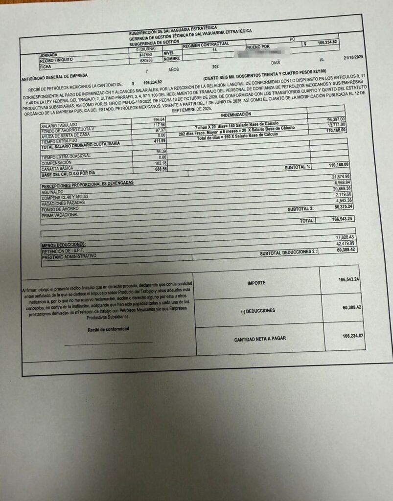 Denuncia al 9933989844… 🚩⚠️🪖 ¡Amagan con FGR en rescisiones de Salvaguarda Estratégica Pemex!; el pasado 22 de octubre de 2025 fueron rescindidos cuatro elementos del Departamento de Seguridad Física Zona Querétaro, adscritos al grupo de Especiales, bajo el argumento recurrente de la “pérdida de la confianza”; los trabajadores afectados fueron William Charles García Toledo, con ficha F-631524; Juan Carlos Cruz Martínez, F-631531; Gabriel Merino Gómez, F-630938; e Inocente Hernández Pioquinto, F-631523; aunque los hechos ocurrieron en octubre, el caso comenzó a hacerse público semanas después debido al temor y la presión que, según la denuncia, enfrentaron los elementos involucrados; de acuerdo con la información proporcionada, personal de la Unidad de Coordinación Técnica, encabezada por el maestro Montes Solís y subordinada al general brigadier de Estado Mayor retirado Gumaro Cabrera Osornio, actual gerente de Gestión Técnica de Salvaguardia Estratégica, habría ejercido presuntas amenazas verbales contra los elementos rescindidos, mismo que depende de la Dirección de Logística y Salvaguarda Estratégica (DLSE) de Israel Benítez López; estas advertencias incluyeron la posibilidad de ser “fichados” y de que la Fiscalía General de la República (FGR) iniciara carpetas de investigación no solo en su contra, sino también contra sus familiares; el personal señalado habría acudido a las instalaciones del departamento con documentos que pretendían ser firmados por los trabajadores, y ante la negativa, por considerar que carecían de sustento y pruebas, se habrían intensificado las amenazas; la denuncia también señala la presunta complicidad del jefe de Departamento, Edgar Máximo Vega Dimayuga, a quien se le atribuyen diversos señalamientos internos relacionados con su gestión; se expone que, desde su llegada al cargo, se habría incrementado la colocación de tomas clandestinas y el robo de hidrocarburos en el estado de Querétaro, además de deteriorarse las relaciones institucionales con autoridades municipales y estatales; según el relato, el funcionario habría responsabilizado a personal operativo por estos conflictos, pese a que se le atribuye una conducción ineficiente del área; dentro de este contexto, se menciona que Vega Dimayuga solicitó la remoción y cambio de personal con mayor antigüedad y experiencia, lo que derivó en la comisión forzada de los dos únicos jefes de grupo que operaban en el departamento; Ángel Braulio Figueroa Ruiz, con ficha F-630439, fue comisionado al Departamento Zona Dos Bocas, mientras que Roberto Oliva Durán, F-630406, fue enviado al Departamento Zona Ciudad del Carmen, a pesar de que previamente ya se encontraba comisionado en Morelia, Michoacán; estos movimientos son descritos como medidas punitivas sin causa justificada, orientadas a debilitar la estructura operativa del departamento; la información también apunta a que este tipo de decisiones han sido impulsadas desde hace años por personal de la Unidad de Coordinación Técnica, a la que se acusa de actuar como un mecanismo interno de rescisión y depuración dentro de la Subdirección de Salvaguardia Estratégica (SSE); según el señalamiento, esta unidad fue creada originalmente para brindar apoyo legal y asesoría jurídica al personal de campo, con el objetivo de prevenir irregularidades en su actuación; no obstante, se afirma que su función habría derivado en la elaboración de oficios de rescisión y en la búsqueda de pretextos administrativos para justificar despidos, una práctica calificada como éticamente cuestionable; el patrón descrito se habría repetido el 27 de noviembre de 2025, cuando otro elemento, Gilberto Martínez Olvera, con ficha F-630449, fue igualmente rescindido bajo el mismo argumento de “pérdida de la confianza”; de acuerdo con la denuncia, el procedimiento siguió la misma dinámica, con la intervención de los mismos actores y sin que se presentaran pruebas que sustentaran la decisión; en el documento se subraya que, de manera paralela a estas rescisiones, el Departamento de Seguridad Física Zona Querétaro cuenta actualmente con alrededor de 20 elementos comisionados provenientes de otras zonas; a pesar de ello, los indicadores de robo de hidrocarburos se encontrarían en niveles críticos, descritos como números rojos, alcanzando cifras que no se habían registrado anteriormente; se afirma que esta situación contrasta con la experiencia del personal removido, quienes conocían los puntos de mayor incidencia delictiva, habían enfrentado agresiones en el desempeño de sus funciones y habían demostrado lealtad y conocimiento operativo dentro de la empresa; como parte del proceso posterior a las rescisiones, uno de los denunciantes exhibió un documento que presuntamente corresponde a la indemnización ofrecida por la empresa; en dicho documento se establece un monto de 106 mil 234 pesos como compensación, cantidad que, según la queja, no guarda proporción con la trayectoria ni con las circunstancias en que se dieron las separaciones del cargo; también se pone en duda la decisión de incorporar elementos con menor experiencia en un contexto de creciente robo de hidrocarburos, y se advierte sobre un posible desmantelamiento de una estructura que, según los denunciantes, ya se encontraba consolidada; atención @Claudiashein @MarcelaVilleg15 @CNE_Mex @SENER_mx @GobiernoMX @FGRmexico @LuzElena_GE @ASF_Mexico  @SCJN @STPS_mx @Tu_IMSS @SEMARNAT_mx @agencia_asea @CENAGAS_mx @IMPetroleo @SATMX @Hacienda_Mexico @BuenGobierno_mx @Centrofcrl #OIC #UIF #OmarReyesColmenares …Zas!!!