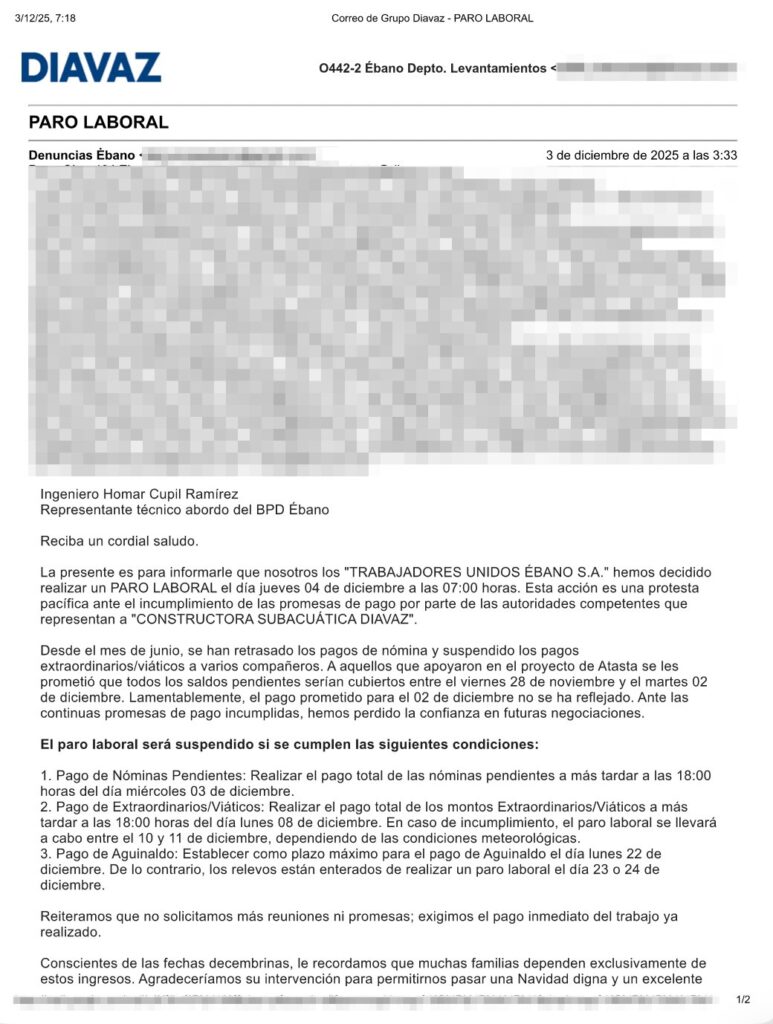 Denuncia al 9933989844… 🚩⚠️🚢 ¡Anuncian paro en barco ÉBANO/DIAVAZ por falta de pagos al personal!; en un oficio dirigido a Homar Cupil Ramírez, representante técnico abordo del BPD Ébano, unos 200 trabajadores, que incluyen esta embarcación de Diavaz de los hermanos Óscar y Luis Vázquez Senties, amagan con realizar un paro laboral mañana jueves 04 de diciembre a las 7 am, en lo que sería una protesta pacífica ante el incumplimiento de las promesas de pago por parte de las autoridades competentes que representan a Constructora Subacuática Diavaz; mismos que se han retrasado desde el mes de junio los pagos de nómina y suspendido los pagos extraordinarios/viáticos; asimismo, a los trabajadores que apoyaron en el proyecto de Atasta se les prometió que todos los saldos pendientes serían cubiertos entre el viernes 28 de noviembre y el martes 02 de diciembre, lo que no sucedió, por lo que exigen: 1.- Pago de Nóminas Pendientes: Realizar el pago total de las nóminas pendientes a más tardar a las 6 pm de hoy; y 2.- Pago de Aguinaldo: Establecer como plazo máximo para el pago de Aguinaldo el día lunes 22 de diciembre; de lo contrario, los relevos están enterados de realizar un paro laboral el día 23 o 24 de diciembre; agregando que muchas familias dependen exclusivamente de estos ingresos en esta Navidad; lo peor, es que no son los únicos a los que Diavaz debe, también a unos 100 trabajadores del patio 10.4 del Puerto Industrial en Ciudad del Carmen, Campeche, van 3 quincenas atrasadas y no dan fecha de pago; a los que se le suman otro tanto de las oficinas principales en el muelle y una oficina de Villahermosa, Tabasco, por no decir que es todo Diavaz; atención @Claudiashein @MarcelaVilleg15 @CNE_Mex @SENER_mx @GobiernoMX @FGRmexico @LuzElena_GE @ASF_Mexico @SCJN @STPS_mx @Tu_IMSS @SEMARNAT_mx @agencia_asea @CENAGAS_mx @IMPetroleo @SATMX @Hacienda_Mexico @BuenGobierno_mx @Centrofcrl #OIC #UIF #OmarReyesColmenares …Zas!!!