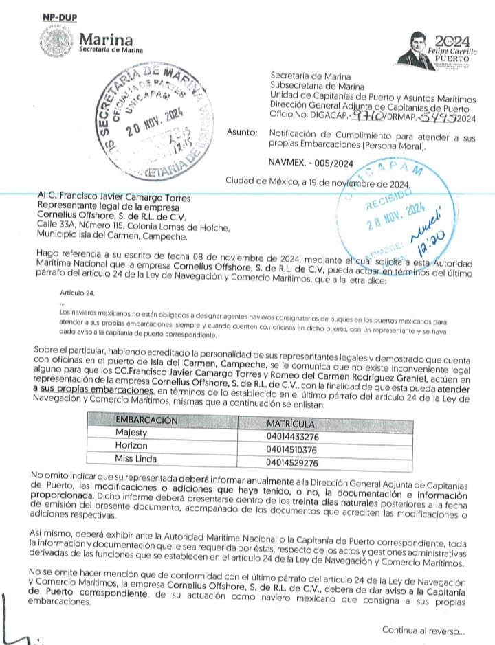 Denuncia al 9933989844…🚩⚠️💰‼️ ¡API engorda a los CAMARGO SALINAS: concesión del Muelle 13 por 10 años en Carmen; negocio redondo de 3,908 MMDP en Pemex/4T!; disfrazado de “fortalecimiento de operatividad y competitividad”, el Gobierno de @UCSCampeche de @LaydaSansores le otorgó a Francisco Javier Camargo Torres -hijo de Francisco Javier Camargo Salinas/EVYA/BMPI- la cesión parcial de derechos y obligaciones por 10 años para operar el área marítimo-terrestre del muelle 13 dentro del Puerto Isla del Carmen en Campeche mediante la empresa recién sacada del portafolio, Servicios Predictivos Costa Fuera; esta concesión, autorizada por Agapito Ceballos Fuentes, director de la Administración Portuaria Integral (API) @apicampeche , le vino como anillo al dedo a Camargo Torres hijo y a los 7 contratos vigentes que tiene el papá Camargo Salinas -involucrado en varios casos de corrupción e incumplimiento durante los sexenios de EPN y AMLO- amarrados con @Pemex mediante Bufete de Mantenimiento Predictivo e Ingeniería (BMPI) y que podrán, no sólo arrendarlo a terceros, sino para sus propios servicios logísticos; conforme a una publicación del API Campeche del jueves 18 de octubre, la asignación del Muelle 13 para Servicios Predictivos Costa Fuera (SPCF) fue resultado de una supuesta licitación pública no disponible a consulta, tampoco sin información de si hubo o no otros participantes; misma empresa que tampoco tiene sitio web y a simple vista parece una contratista recién sacada del portafolio de los Camargo Salinas; misma familia petrolera (Francisco Javier, Roberto, Rafael, Luis y María Eugenia) que a la par han empezado a exponer a Francisco Javier Camargo Torres como la cara joven colocándolo como presidente de la Delegación en Carmen de la Cámara Mexicana de la Industria de la Construcción ( @cmicnacional ), sin ningún antecedente de ser constructor y con fuertes nexos con @PartidoMorenaMx en Campeche; para colmo, a Francisco Javier Camargo Torres, su papá -Camargo Salinas- le hizo otra “empresita”: Cornelius Offshore con la que recibió de @Pemex el contrato 648223843 por 49,703,770.85 MDP en propuesta conjunta con Proyectos Chankán, representada en este convenio por Lourdes del Carmen López Cuevas, para servicio de transporte de personal, materiales y equipos ligeros en el Golfo de México con una lancha rápida denominada Majesty, que estuvo vigente del 11 de enero de 2024 al 31 de diciembre de 2024; además, el 27 de julio de 2023, cuando @adan_augusto visitó Ciudad del Carmen durante su precampaña por la candidatura presidencial de Morena, Camargo Salinas papá acudió al aeropuerto a recibirlo; luego AA se enfiló a un mitin que lo esperaba en el centro de la Isla acaparado por decenas de vehículos con acarreados de todos los rincones de Tabasco; ese día en el aeropuerto un miembro del equipo de campaña de AA le agradeció con un apretón de manos a Camargo Salinas por su “apoyo” para transportar a la militancia morenista hasta el evento; cabe recordar que luego de la caída del @PRI_Nacional en el sexenio de EPN, en el que los Camargo Salinas batearon con EVYA Construcciones y Reparaciones, se deshicieron de esta compañía fraudulentamente para consolidar BMPI en el 2019 en el primer piso de la 4T, aún cuando le rescindieron un contrato ese año por incumplimiento, con la que subieron como la espuma hasta 3,908,321,831.34 pesos en 39 contratos con @Pemex desde 2017 a la fecha: con EPN 1, ¡¡¡AMLO-Agrónomo 38!!! y Sheinbaum 0, aunque 7 siguen vigentes; 1.- Del 14 de noviembre de 2024 al 31 de diciembre de 2027 le dieron el contrato 646204831 para inspección radiográfica de ductos e instalaciones de la Subdirección de Producción Región Sur (SPRS ahora SETRS) de Marcos Torres Fuentes por un monto de 47,439,454 pesos; 2.- Recibió el contrato 648224834 para servicio de transporte de personal, materiales y equipos ligeros en el Golfo de México con lancha rápida denominada Don Adrián, vigente del 3 de septiembre de 2024 al 31 de diciembre de 2027 por 161,904,368.8 pesos; 3.- En @Pemex le dieron el contrato 648224832 por 161,904,368.8 pesos para servicio de transporte de personal, materiales y equipos ligeros en el Golfo de México con lancha rápida denominada Gayla Graham, vigente del 3 de septiembre de 2024 al 31 de diciembre de 2027; 4.- Contrato 648224838 vigente del 26 de septiembre de 2024 al 30 de junio de 2027 por 150,462,159.5 pesos para servicio de transporte de materiales y equipo ligero en el Golfo de México con abastecedor rápido denominado Don Fabián; 5.- Contrato 646204822 por 34,651,771 pesos para inspección radiográfica en ductos e instalaciones terrestres en los Activos de Producción de la Región Norte”, vigente desde el 16 de agosto de 2024 al 30 de junio de 2026; 6.- Del 23 de agosto de 2023 hasta el 29 de noviembre de 2025, BMPI ejecuta el contrato 5400035068 por 359,102,188.5 para pruebas no destructivas (ACREF-S013-2019) de la STLP; y 7.- Le asignaron también el contrato 643023811 para servicio de mantenimiento predictivo y evaluación de equipos de perforación y reparación de pozos administrados por la Subdirección de Perforación y Mantenimiento a Pozos (SPMP) de Federico Chow Sánchez, vigente desde el 6 de julio de 2023 al 30 de junio de 2025 por 69,040,075.05 pesos; atención @Claudiashein @MarcelaVilleg15 @CNE_Mex @SENER_mx @GobiernoMX @FGRmexico @LuzElena_GE @ASF_Mexico  @SCJN @STPS_mx @Tu_IMSS @SEMARNAT_mx @agencia_asea @CENAGAS_mx @IMPetroleo @SATMX @Hacienda_Mexico @BuenGobierno_mx @Centrofcrl #OIC #UIF #OmarReyesColmenares …Zas!!!