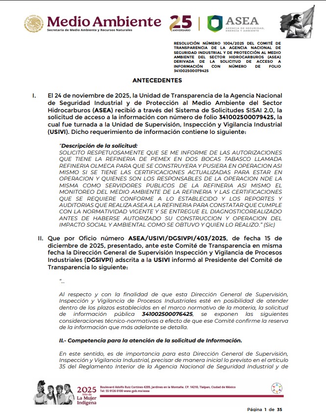 Denuncia al 9933989844… 🚩⚠️🔥‼️¡ASEA clasifica 5 años contaminación del quemador gigante de refinería Olmeca!; la Agencia de Seguridad, Energía y Ambiente (ASEA) que titula Armando Ocampo Zambrano ha determinado clasificar como reservada por un periodo de cinco años la información relacionada con el monitoreo ambiental de la Refinería Olmeca, Paraíso, Tabasco, del gerente Julio César Aguilar Benítez. Esta decisión administrativa surge tras la denuncia de la operación de un quemador principal que, según testimonios locales, opera ininterrumpidamente generando riesgos a la salud y al ecosistema; a pesar de que la solicitud de transparencia con folio 341002500079425 exigía conocer los niveles de contaminación y las certificaciones de operación vigentes, el Comité de Transparencia de la agencia optó por ocultar los datos argumentando que su divulgación obstaculizaría un proceso de supervisión en curso. La controversia se centra en la actividad de la torre de desfogue o quemador principal, una estructura que mide 182 metros de altura, pero que alcanza superar los 200 metros con la campana superior, y cuya flama es visible día y noche. De acuerdo con una denuncia formal interpuesta ante la ASEA, el complejo del Sistema Nacional de Refinación mantiene una quema de gas continua que excede los límites regulatorios, los cuales permiten esta actividad por un máximo de 72 horas salvo justificación técnica. La queja señala que la producción real de la refinería hacia finales de 2025 rondaba los 270 mil barriles diarios, cifra inferior a la capacidad proyectada de 340 mil barriles, lo que coincide con un aumento gradual en la intensidad del desfogue. Los habitantes de las comunidades aledañas, específicamente Villa Puerto Ceiba, Petrolera, Torno Largo, La Madrid, Puerto Ceiba Carrizal y Las Palmas, han reportado afectaciones directas derivadas de esta operación industrial. El documento de la denuncia, suscrito por un afectado especialista en derecho, detalla la presencia de humo, olores intensos, ruido constante y calor irradiado, advirtiendo sobre posibles daños a la salud que incluyen problemas respiratorios, alteraciones nerviosas y trastornos del sueño. Asimismo, se alerta sobre la caída de residuos corrosivos y posible lluvia ácida que ya habrían causado deterioro visible en techos de lámina y pintura de vehículos, sumado al temor latente de un accidente mayor por la proximidad de las viviendas, que en algunos casos no respetarían la distancia de seguridad de 500 metros exigida por la normativa. Frente a la exigencia ciudadana de acceder a los reportes de monitoreo ambiental, auditorías y certificaciones que avalen la operación segura de la planta, la Dirección General de Supervisión, Inspección y Vigilancia de Procesos Industriales (DGSIVPI) de la ASEA confirmó la existencia de información en sus archivos referente al periodo de noviembre de 2024 a noviembre de 2025. No obstante, la dependencia argumentó que dichos datos forman parte del expediente administrativo abierto ASEA/USIVI/DGSIVPI/PAS/AMB/009/2025, el cual se encuentra en etapa de análisis técnico-jurídico. Bajo esta premisa, la autoridad sostuvo que entregar la información vulneraría la estrategia de verificación, alertaría al regulado, en este caso @Pemex , y pondría en riesgo la efectividad de las medidas correctivas que pudieran dictarse. La Resolución número 1004/2025 del Comité de Transparencia, emitida el 17 de diciembre de 2025, validó la reserva de la información basándose en una prueba de daño. Los funcionarios Mauricio Pérez Lucero, Alfredo Zavaleta Cruz y Sabino Vázquez Araujo avalaron la postura de que el interés público de proteger el medio ambiente mediante una supervisión secreta y eficaz supera el interés de la ciudadanía de conocer en tiempo real los niveles de contaminación a los que está expuesta. La resolución califica la reserva como una medida proporcional y temporal, asegurando que la divulgación prematura impediría una verificación objetiva del cumplimiento de las obligaciones ambientales de la paraestatal. Por otro lado, la Dirección General de Gestión de Procesos Industriales (DGGPI), a cargo de Luis Ricardo Valencia Alvarado, declaró su incompetencia parcial para entregar los reportes de monitoreo y certificaciones actuales, limitándose a proporcionar un listado de cinco oficios de autorización emitidos entre 2017 y 2025 a favor de distintas filiales de @Pemex , así como un enlace electrónico a una Manifestación de Impacto Ambiental de 2019. Esta unidad administrativa también se declaró incapaz de informar sobre los servidores públicos responsables de la operación de la refinería, a pesar de que la denuncia ciudadana señala específicamente al gerente Julio César Aguilar Benítez como el responsable operativo dentro de la estructura de la petrolera. La situación operativa de la Refinería Olmeca contrasta negativamente con las prácticas internacionales en materia de refinación. Mientras que en instalaciones de países como Estados Unidos, India, Brasil y Arabia Saudita se han implementado Sistemas de Recuperación de Gas de Antorcha (FGRU) para reutilizar los residuos en la generación de energía o petroquímicos, la planta mexicana opta por la quema a cielo abierto; atención @Claudiashein @MarcelaVilleg15 @CNE_Mex @SENER_mx @GobiernoMX @FGRmexico @LuzElena_GE @ASF_Mexico  @SCJN @STPS_mx @Tu_IMSS @SEMARNAT_mx @agencia_asea @CENAGAS_mx @IMPetroleo @SATMX @Hacienda_Mexico @BuenGobierno_mx @Centrofcrl #OIC #UIF #OmarReyesColmenares …Zas!!!