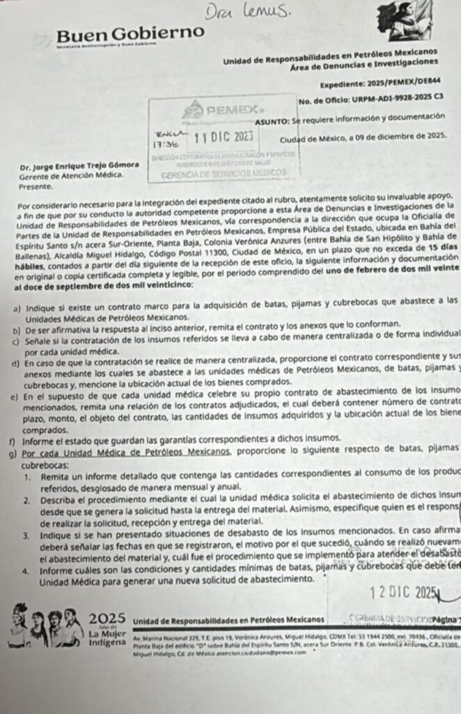 Denuncia al 9933989844… 🚩⚠️💊 ¡Auditoría central exhibe corrupción en Servicios de Salud Pemex!; más anomalías en los servicios de salud @Pemex que dirige el subdirector Ruy López Riadura, ya que debido a una denuncia que interpusieron en CDMX que cayó en manos de Jorge Enrique Trejo Gómora, gerente de Atención Médica, ahora lanzó el oficio número URPM-AD1-9928-2025-C3 expediente 2025/PEMEX/DE844 el pasado 12 de diciembre 2025 donde le está pidiendo a todos los hospitales @Pemex que justifiquen gastos ¡¡¡que ellos mismos desde México autorizaron y licitaron!!!. Según el documento, “por considerarlo necesario para la integración del expediente citado al rubro, atentamente solicito su invaluable apoyo, a fin de que por su conducto la autoridad competente proporcione a esta Área de Denuncias e Investigaciones de la Unidad de Responsabilidades de @Pemex , vía correspondencia a la dirección que ocupa la Oficialía de Partes de la Unidad de Responsabilidades en @Pemex del periodo 2020-2025 (5 años del inepto ex subdirector de Servicios de Salud, Rodolfo Lehmann Mendoza, y el primer año del presente sexenio con varios EDD hasta que asumió Ruy López Riadura): 1.- Indique si existe un contrato marco para la adquisición de batas, pijamas y cubrebocas que abastece a las Unidades Médicas de @Pemex ; 2.- De ser afirmativa la respuesta al inciso anterior, remita el contrato y los anexos que lo conforman; 3.- Señale si la contratación de los insumos referidos se lleva a cabo de manera centralizada o de forma individual por cada unidad médica; 4.- En caso de que la contratación se realice de manera centralizada, proporcione el contrato correspondiente y su anexos mediante los cuales se abastece a las unidades médicas de @Pemex , de batas, pijamas cubrebocas y, mencione la ubicación actual de los bienes comprados; 5.- En el supuesto de que cada unidad médica celebre su propio contrato de abastecimiento de los insumos mencionados, remita una relación de los contratos adjudicados, el cual deberá contener número de contrato, plazo, monto, el objeto del contrato, las cantidades de insumos adquiridos y la ubicación actual de los bienes comprados; 6.- Informe el estado que guardan las garantías correspondientes a dichos insumos; 7.- Por cada Unidad Médica de @Pemex , proporcione lo siguiente respecto de batas, pijamas cubrebocas: 1a.- Remita un informe detallado que contenga las cantidades correspondientes al consumo de los productos referidos, desglosado de manera mensual y anual; 2a.- Describa el procedimiento mediante el cual la unidad médica solicita el abastecimiento de dichos insumos desde que se genera la solicitud hasta la entrega del material. Asimismo, especifique quien es el responsable de realizar la solicitud, recepción y entrega del material; 3a.- Indique si se han presentado situaciones de desabasto de los insumos mencionados. En caso afirma deberá señalar las fechas en que se registraron, el motivo por el que sucedió, cuándo se realizó nuevamente el abastecimiento del material y, cuál fue el procedimiento que se implementó para atender el desabasto; 4a.- Informe cuáles son las condiciones y cantidades mínimas de batas, pijamas y cubrebocas que debe tener la Unidad Médica para generar una nueva solicitud de abastecimiento”. Todo esto deja en claro la enorme corrupción y desorganización que precedió en el sexenio pasado y el arranque del presente en los servicios de salud @Pemex y que hoy intentan taponar, así como el desabasto de estos y otros insumos, medicinas y servicios médicos que tienen en crisis a toda la red hospitalaria de la petrolera, quedando también asentado la grave deuda con proveedores de este sector que suspendieron sus servicios y la parálisis de la subrogación; cabe destacar que la red hospitalaria @Pemex cuenta con 2 hospitales de alta especialidad: Hospital Central Norte y Hospital Central Sur de Alta Especialidad, ambos en CDMX; se suman 6 hospitales regionales: Cd. Madero, Tamps; Poza Rica, Ver; Reynosa, Tamps; Salamanca, Gto; Minatitlan, Ver; y Villahermosa, Tab; además de 9 hospitales generales: Agua Dulce, Ver; Cd. del Carmen, Camp; Ciudad Pemex, Tab; Comalcalco, Tab; Paraíso, Tab; Cadereyta, NL; Ébano, SLP; El Plan, Ver; y Salina Cruz, Oax; asimismo clínicas-hospitales, clínicas, consultorios y unidades de servicios preventivos de medicina del trabajo en varios activos; atención @Claudiashein @MarcelaVilleg15 @CNE_Mex @SENER_mx @GobiernoMX @FGRmexico @LuzElena_GE @ASF_Mexico  @SCJN @STPS_mx @Tu_IMSS @SEMARNAT_mx @agencia_asea @CENAGAS_mx @IMPetroleo @SATMX @Hacienda_Mexico @BuenGobierno_mx @Centrofcrl #OIC #UIF #OmarReyesColmenares …Zas!!!