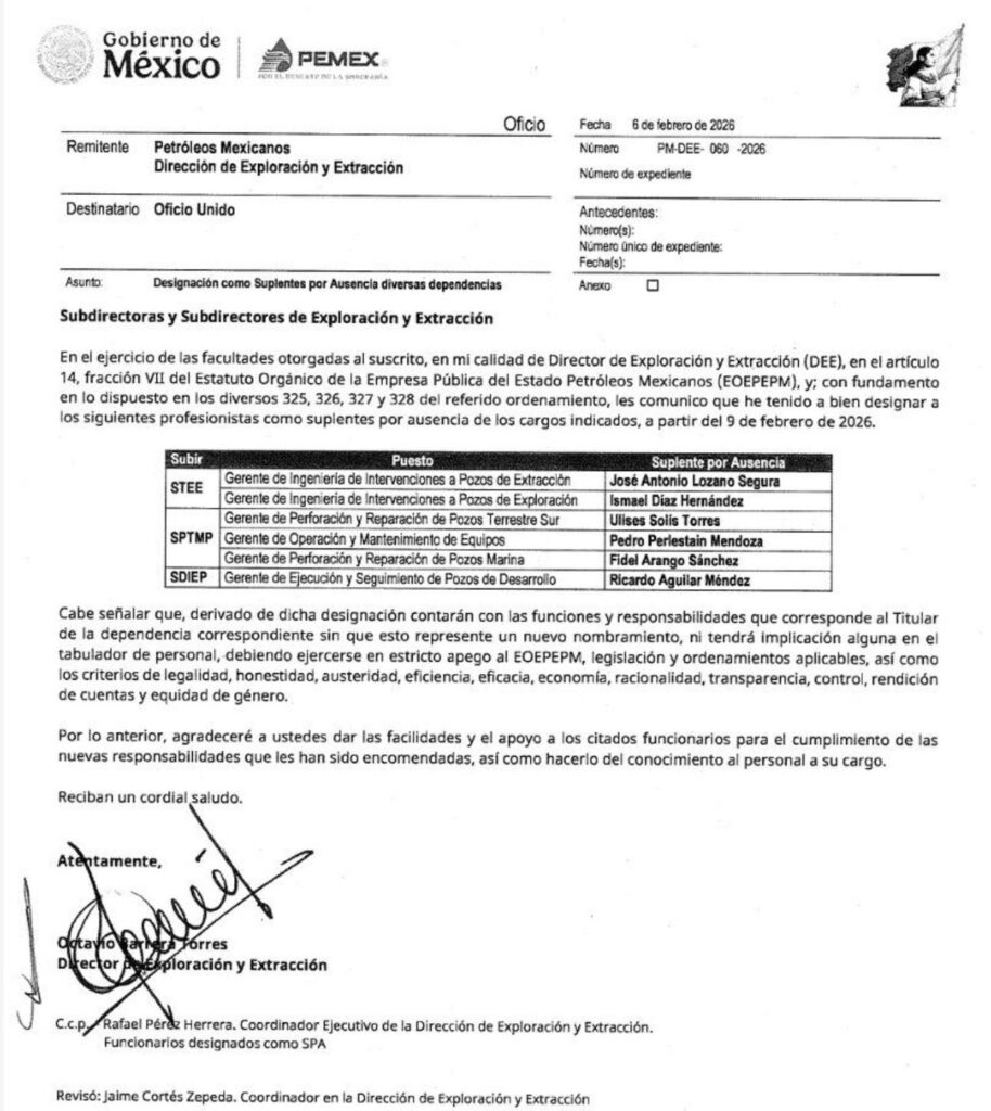 Denuncia al 9933989844… 🚩⚠️‼️ ¡BARRERA/DEE confirma Guillotinazo de Gerentes Pemex!; fue corroborado oficialmente lo publicado en este espacio hoy: el guillotinazo de gerentes de la Dirección de Exploración y Extracción (DEE antes PEP) del recién nombrado Octavio Barrera Torres, pero para sorpresa de muchos no solo ocurrió en la Subdirección de Perforación, Terminación y Mantenimiento de Pozos (SPTMP) de Federico Chow Sánchez, sino que los movimientos también albergaron la Subdirección Técnica de Exploración y Extracción (STEE) de María de Jesús Correa López y la Subdirección de Diseño, Ingeniería y Ejecución de Proyectos (SDIEP) de Tomás Cervantes Baza. Mediante el oficio unido PM-DEE-060-2026 del 6 de febrero de 2026 firmado por Octavio Barrera Torres, liquidó a parte de la mafia en las operación de perforación y servicio a pozos heredada por Carlos Rangel Hernández, ex subdirector de Perforación y Mantenimiento a Pozos (SPMP hoy SPTMP) y Ángel Cid Munguía, ex director de Exploración y Extracción (DEE antes PEP), que operó a sus anchas en el sexenio pasado. Con el asunto: Designación como Suplentes por Ausencia diversas dependencias y dirigido a los subdirectores se designó como SPA a partir de hoy 9 de febrero de 2026 a: 1.- José Antonio Lozano Segura como SPA de la Gerencia de Ingeniería de intervenciones a Pozos de Extracción (GIIPE) de la STEE. 2.- Ismael Díaz Hernández como SPA de la Gerencia de Ingeniería de Intervenciones a Pozos de Exploración (GIIPE) de la STEE. 3.- Ulises Solís Torres como SPA de la Gerencia de Perforación y Reparación de Pozos Terrestre Sur (GPRPTS) de la SPTMP. 4.- Pedro Perlestain Mendoza como SPA de la Gerencia de Operación y Mantenimiento de Equipos (GOME) de la SPTMP. 5.- Fidel Arango Sánchez como SPA de la Gerencia de Perforación y Reparación de Pozos Marina (GPRPM) de la SPTMP. 6.- Ricardo Aguilar Méndez como SPA de la Gerencia de Ejecución y Seguimiento de Pozos de Desarrolio (GESPD). Según el documento, señala que derivado de dicha designación contarán con las funciones y responsabilidades que corresponde al titular de la dependencia correspondiente sin que esto represente un nuevo nombramiento, ni tendrá implicación alguna en el tabulador de personal, debiendo ejercerse en estricto apego al Estatuto Orgánico de la Empresa Pública del Estado Petróleos Mexicanos (EOEPEPM). Cabe señalar que entre los SPA designados se encuentra quien suplió al gerente guillotinado laboralmente aquí datado: 1.- Renato Gamiño Ramos de la Gerencia de Operación y Mantenimiento de Equipos (GOME) y -que como trascendió- también quienes habrían SPA a otros cuatro: 2.- Héctor Osorio Herrera de la Gerencia de Seguimiento y Mejora Continua de Costos (GSMCC), 3.- Mario Noguez Lugo de la Gerencia de Ingeniería de Intervenciones a Pozos de Exploración (GIIPE), 4.- Sergio Luna Blé de la Gerencia de Perforación y Reparación de Pozos Terrestre Sur (GPRPTS) y 5.- Antonio Enrique Zamarrón Galván de la Gerencia de Ingeniería de Intervenciones a Pozos de Extracción (GIIPE). Por último, cabe destacar que se esperan más liquidaciones y movimientos derivados de estos cambios y producto de otros dentro de @Pemex . atención @Claudiashein @MarcelaVilleg15 @CNE_Mex @SENER_mx @GobiernoMX @FGRmexico @LuzElena_GE @ASF_Mexico @SCJN @STPS_mx @Tu_IMSS @SEMARNAT_mx @agencia_asea @CENAGAS_mx @IMPetroleo @SATMX @Hacienda_Mexico @BuenGobierno_mx @Centrofcrl #OIC #UIF #OmarReyesColmenares …Zas!!!