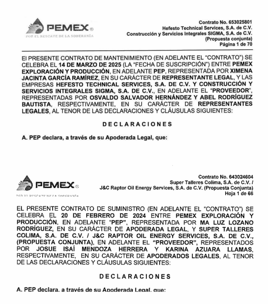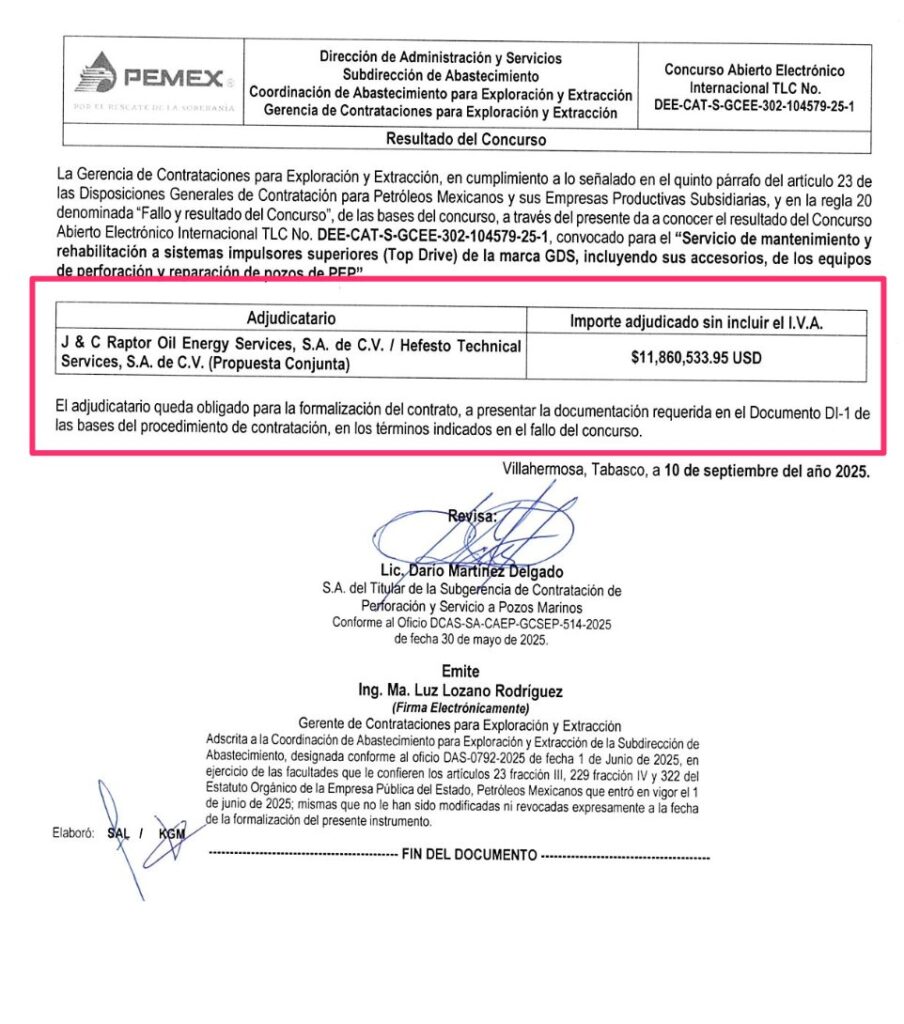Denuncia al 9933989844… 🚩⚠️‼️¡Batazo a OLMECA DRILLING en Top Drive; ganan J&C RAPTOR/HEFESTO por $219 MDP!; en propuesta conjunta, las empresas J&C Raptor Oil Energy Services/Hefesto Technical Services, representados en diversos contratos por Karina Azuara Llamas y Osvaldo Salvador Hernández, respectivamente, recibieron el fallo de la licitación DEE-CAT-S-GCEE (Lucy Lozano Rodríguez) 302-104579-25-1 para realizar el servicio de mantenimiento y rehabilitación a sistemas impulsores superiores (Top Drive) de la marca GDS, incluyendo sus accesorios, de los equipos de perforación y reparación de pozos de @Pemex Exploración y Producción (PEP ahora DEE) de Ángel Cid Munguía por un monto de 219,319,283.29 pesos; tras este fallo, opaco desde la apertura de propuestas donde @Pemex ocultó los montos con lo que evadió el principio de máxima transparencia señalado en los Artículos 46 y 51 de de la Disposiciones Generales de Contratación, los Artículos 134, 70 y 122 de la Ley General de Transparencia y Acceso a la Información Pública, Olmeca Drilling Solutions and Engineering de Moisés Mendoza fue descartada tras ser reincidente en fraudes, documentados aquí, por haber falsificado una carta de un fabricante estadounidense con complicidad interna, además de la complicidad de las autoridades de @Pemex que habría permitido que esta empresa estuviese gozando de contratos con total impunidad; este hecho fue denunciado, incluso aunque el documento “de respaldo del fabricante” fue desmentido dos veces por el propio fabricante norteamericano; con esa carta, la empresa buscaba demostrar respaldo internacional y así avanzar en esta licitación; Olmeca Drilling ya había sido señalada anteriormente por irregularidades en procesos similares por ejemplo, manipular el año de fabricación de equipos Top Drive en otra licitación en la misma Subdirección de Perforación y Mantenimiento a Pozos (SPMP) a cargo de Federico Chow Sánchez, caso exhibe un patrón posible de corrupción sistemática; por su parte, J&C Raptor habría participado en un pool empresarial encabezado desde 2020 por Carlos Eugenio Lugo Ramírez, hijo del ex petrolero Carlos Lugo Gil, que en ese año ganó contratos con empresas que operó a través de Jorge Mote Reyes, Jorge Alberto Rojo Meza, Adriana Serrano Díaz, Félix Gabriel Girola, Gilberto Flores Hernández o Edgar González Olguín y con las que ganó más de 1,500 millones de pesos; su socio Hefesto Technical Services signó el contrato 653025801 con @Pemex en propuesta conjunta con Construcción y Servicios Integrales SIGMA de Abel Rodríguez Bautista, para ejecutar el servicio de mantenimiento preventivo y correctivo a los componentes, sistemas principales y auxiliares de los equipos terrestres de la marca National Oilwell Varco con capacidad de 1500 HP vigente actualmente del 14 de marzo de 2025 al 31 de diciembre de 2027 por un monto gigantesco de 1,142,105,541.22 pesos; atención @Claudiashein @MarcelaVilleg15 @CNE_Mex @SENER_mx @GobiernoMX @FGRmexico @LuzElena_GE @ASF_Mexico  @SCJN @STPS_mx @Tu_IMSS @SEMARNAT_mx @agencia_asea @CENAGAS_mx @IMPetroleo @SATMX @Hacienda_Mexico @BuenGobierno_mx @Centrofcrl #OIC #UIF #OmarReyesColmenares …Zas!!!