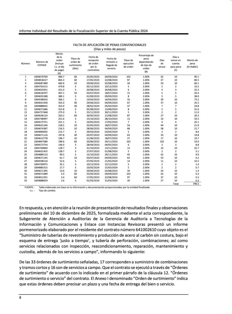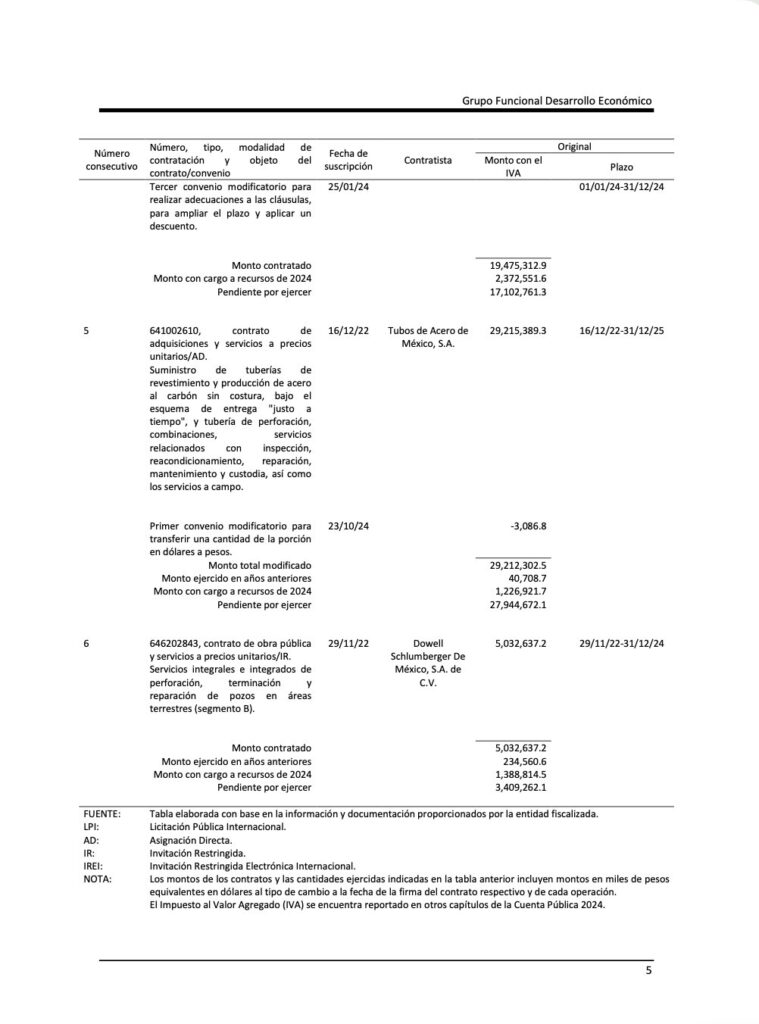 Denuncia al 9933989844… 🚩⚠️💸‼️¡CAMPO IXACHI: Indebidas ampliaciones a GSM-CALZADA-SLB-TAMSA de 5,549 a 13,906 MDP (+ 150%) y solo ejercieron el 39.9%, detectó ASF 2024! En la ronda de 31 auditorías a la cuenta pública de @Pemex en el ejercicio del año 2024, la Auditoría Superior de la Federación (ASF), que ahora dirige Aureliano Hernández Palacios Cardel, revisó el manejo de recursos federales en el proyecto Campo Ixachi, operado por @Pemex Exploración y Producción (PEP ahora DEE), y detectó observaciones relacionadas con deficiencias en la aplicación de sanciones, ampliaciones contractuales reiteradas y montos relevantes en ejecución y por ejercer, en contratos que en conjunto sumaron una muestra auditada de 5 mil 549 millones 220 mil pesos, equivalente al 39.9% del total ejercido en 2024, que ascendió a 13 mil 906 millones 718 mil pesos. La revisión se concentró en seis contratos de obra pública, servicios, adquisiciones y esquemas mixtos, todos a precios unitarios, en los que participaron empresas CALZADA Construcciones (CALCO), GSM-Bronco, CANAMEX Energy Holdings, TUBOS DE ACERO de México (TAMSA) y DOWELL SCHLUMBERGER de México. Estos contratos abarcan desde la construcción y mantenimiento de caminos, hasta la perforación, terminación de pozos y suministro de tubería especializada. Uno de los principales hallazgos de la auditoría se centró en el contrato 641002610 de TUBOS DE ACERO de México, correspondiente al suministro de tuberías y servicios asociados, donde la ASF detectó que @Pemex omitió inicialmente la aplicación de penas convencionales por un monto de 799.5 miles de pesos, derivado de retrasos que oscilaron entre dos y 102 días naturales en al menos 33 órdenes de surtimiento y servicios durante 2024. Estas penalizaciones debieron calcularse con base en cláusulas contractuales que establecían sanciones del 1.0% y 2.0% por día de atraso, dependiendo del tipo de orden. Sin embargo, tras la intervención de la entidad fiscalizada y la presentación de documentación adicional, la observación fue solventada. @Pemex argumentó que, en el caso del suministro de ciertos materiales, los plazos correspondían al tiempo de adquisición de insumos y no a entregas críticas; además, justificó que los servicios a campo no tenían tiempos estrictos de ejecución debido a su naturaleza operativa variable, por lo que no procedía la aplicación de penalizaciones. La ASF validó esta explicación y dio por atendida la observación. En materia contractual, la auditoría evidenció una constante en la modificación de montos y plazos relevantes. El contrato 640853820 de CALZADA Construcciones (CALCO) de Grupo HYCSA de Alejandro F Calzada Prats creció de 507.7 millones a 907.7 millones de pesos dejando de ejercer 738 millones de pesos. En el caso del contrato 641001805 de GSM Bronco de Grupo CARSO de Carlos Slim y CANAMEX Energy Holdings, destinado a la perforación y terminación de pozos, se reportó un monto contratado de 19 mil 475 millones de pesos, de los cuales 2 mil 372 millones 551 mil pesos se ejercieron en 2024, quedando más de 17 mil millones pendientes. Asimismo, el contrato 641002610 de TUBOS DE ACERO de México (Tenaris-TAMSA) de Grupo TECHINT de Paolo Rocca, pese a su ligera reducción por ajuste cambiario, mantiene un monto superior a los 29 mil millones de pesos, con más de 27 mil 944 millones aún por ejercer. Por su parte, el contrato 646202843, a cargo de DOWELL SCHLUMBERGER de México, reportó un monto de 5 mil 32 millones de pesos, con 1 mil 388 millones ejercidos en 2024 y un saldo pendiente de más de 3 mil 409 millones. Cabe destacar que los contratos anómalos son: 1.-Contrato 640853820 para construcción, ampliación, reacondicionamiento de caminos y/o plataformas terrestres para obras de perforación, intervenciones a pozos e infraestructura terrestre en los activos de producción de PEP (contrato 2) de CALZADA Construcciones. 2.- Contrato 641001805 para trabajos llave en mano para perforar y terminar pozos de desarrollo para campos terrestres de PEP-DEE de GSM Bronco/CANAMEX Energy Holdings. 3.- Contrato 641002610 para suministro de tuberías de revestimiento y producción de acero al carbón sin costura, bajo el esquema de entrega “justo a tiempo”, y tubería de perforación, combinaciones, servicios relacionados con inspección, reacondicionamiento, reparación, mantenimiento y custodia, así como los servicios a campo de TUBOS DE ACERO de México. 4.- Contrato 646202843 para servicios integrales e integrados de perforación, terminación y reparación de pozos en áreas terrestres (segmento B) de DOWELL SCHLUMBERGER de México. Atención @Claudiashein @MarcelaVilleg15 @CNE_Mex @SENER_mx @GobiernoMX @FGRmexico @LuzElena_GE @ASF_Mexico  @SCJN @STPS_mx @Tu_IMSS @SEMARNAT_mx @agencia_asea @CENAGAS_mx @IMPetroleo @SATMX @Hacienda_Mexico @BuenGobierno_mx @Centrofcrl #OIC #UIF #OmarReyesColmenares …Zas!!!