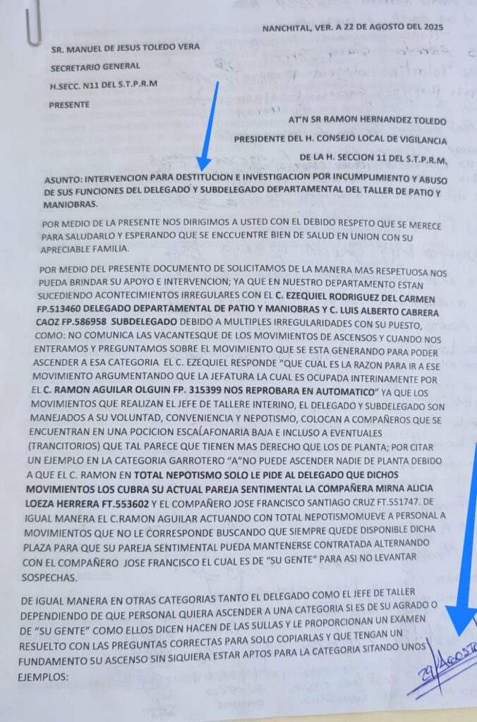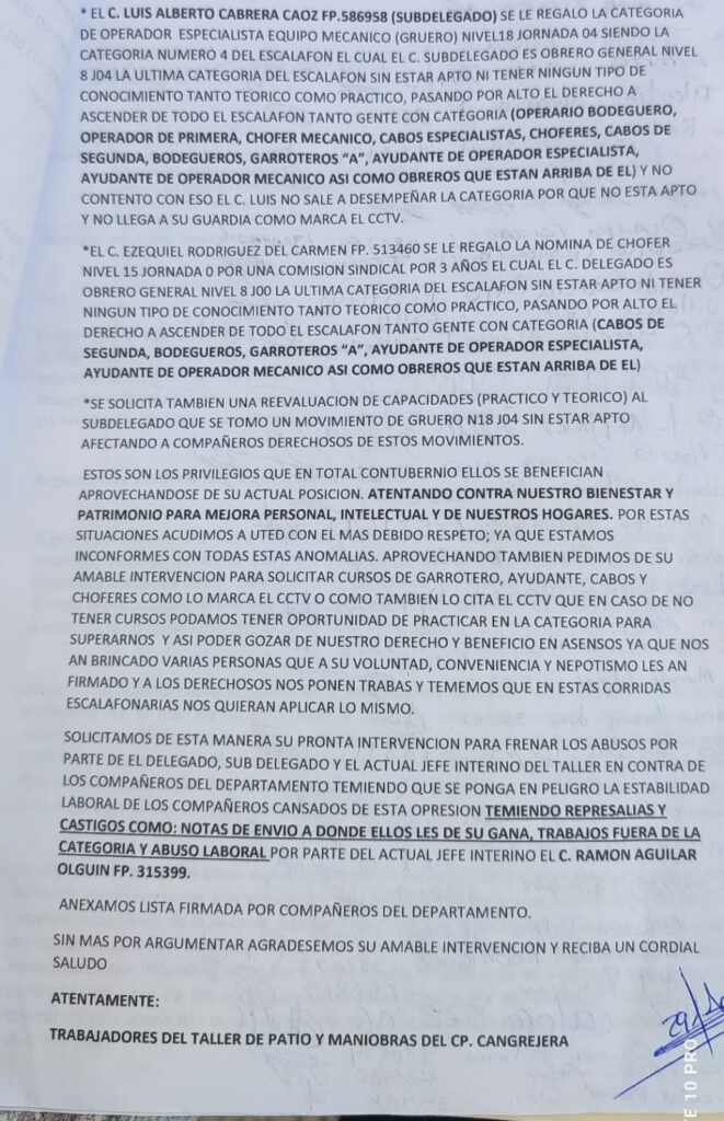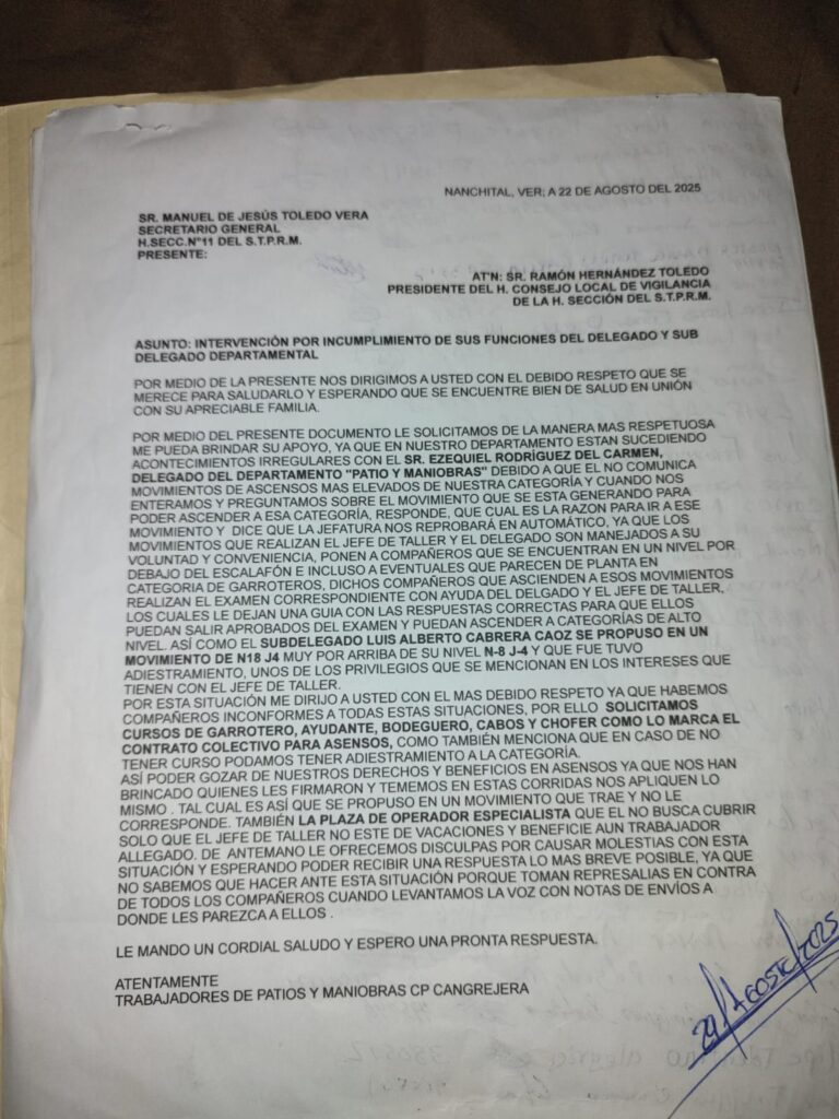 Denuncia al 9933989844… 🚩⚠️👨‍🏭 🏭 ¡CAOZ laboral de EZEQUIEL y OLGUÍN en CP Cangrejera!; trabajadores del Departamento Patio y Maniobras del Complejo Cangrejera del gerente Octaviano Tenorio Herrera han manifestado su profundo descontento y exigen la destitución del delegado Ezequiel Rodríguez del Carmen (F-513460) y del subdelegado Luis A. Cabrera Caoz (F-586958), acusando también al jefe del departamento, Ramón Aguilar Olguín (F-315399), de permitir irregularidades sistemáticas en la operación del área; según los denunciantes, estas tres personas han manipulado procesos internos a su conveniencia y han colocado a sus allegados en posiciones superiores, vulnerando el escalafón y los derechos de otros trabajadores; los empleados señalan que Rodríguez del Carmen y Cabrera Caoz se auto ascendieron a categorías que no dominan, ocupando horarios de trabajo extensos sin cumplir funciones, dedicando gran parte del tiempo en el comedor del complejo, mientras el jefe del departamento permite estas prácticas; la denuncia detalla que los ascensos y exámenes de aptitud se manipulan: los trabajadores considerados “de su gente” reciben trato preferencial, mientras que aquellos que no son del agrado de estos tres funcionarios son reprobados deliberadamente, afectando su desarrollo profesional y sus posibilidades de ascenso; el problema ha sido reportado desde marzo al cacique Manuel de Jesús Toledo Vera, secretario general de la Sección 11 STPRM, sin que hasta la fecha se hayan tomado medidas; los trabajadores denuncian que Toledo Vera ha ignorado las solicitudes de destitución a pesar de contar con evidencia documentada y fotos, lo que indica una posible complicidad del líder sindical con las irregularidades denunciadas que también hace énfasis en prácticas de nepotismo y favoritismo; se señala que el jefe de taller ha beneficiado a Mirna Alicia Loeza Herrera (F-553602) y el colaborador José Francisco Santiago Cruz (F-551747) han sido beneficiados con movimientos laborales y contratos que los posicionan en lugares privilegiados dentro del escalafón, incluso por encima de trabajadores con más antigüedad o experiencia; asimismo, el delegado y subdelegado han recibido ascensos en categorías que no poseen competencias para desempeñar, como el caso de Cabrera Caoz, promovido a operador especialista en equipo mecánico (gruero) N-18, Jornada 04, y Rodríguez del Carmen, asignado como chofer N-15, ambos sin contar con la preparación teórica o práctica necesaria; los trabajadores alertan sobre el riesgo de que estas prácticas pongan en peligro la estabilidad laboral y afecten el bienestar del personal; afirman que los funcionarios responsables recaban firmas de apoyo prometiendo beneficios a cambio de respaldo, mientras quienes se niegan a participar son amedrentados o ven obstaculizados sus derechos; además, se denuncia que las irregularidades están respaldadas por algunos ingenieros de taller, incluido un ingeniero de apellido Zárate, lo que amplifica el conflicto de intereses dentro del departamento; en un documento fechado el 22 de agosto de 2025, los trabajadores solicitaron formalmente la intervención de Toledo Vera y el eterno cacique Ramón Hernández Toledo, presidente del Consejo Local de Vigilancia de la Sección 11 STPRM en Nanchital, Ver, para que se investigue y se detenga el abuso de poder; atención @Claudiashein @MarcelaVilleg15 @SENER_mx @FGRmexico @LuzElena_GE @ASF_Mexico @PabloGomez1968 @SCJN @STPS_mx @Tu_IMSS @SEMARNAT_mx @agencia_asea @CENAGAS_mx @IMPetroleo @SATMX @Hacienda_Mexico @BuenGobierno_mx #RaquelBuenrostro #OIC #UIF….Zas!!!