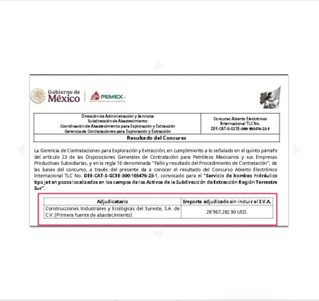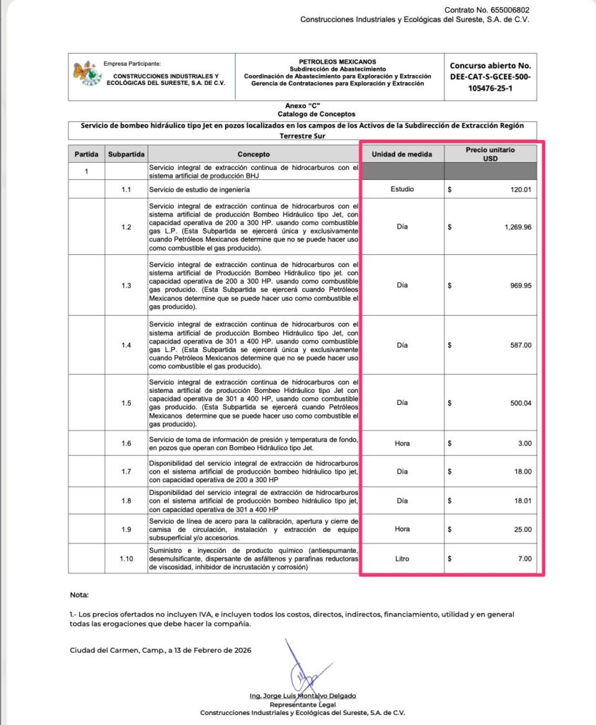 Denuncia al 9933989844… 🚩⚠️❗️¡CIESSA/ALARCÓN: Revienta contrato de bombeo hidráulico tipo Jet en Región Sur Pemex! Con equipos viejos, corrupción y diversas anomalías acumula 2,733,319,175.56 pesos en 7 contratos con el recién asignado. Construcciones Industriales y Ecológicas del Sureste (CIESSA), de los hermanos Luis Andrés y José Luis Arrocha Alarcón, señalada en múltiples denuncias públicas por actos de corrupción y favoritismo en licitaciones de @Pemex recibió un contrato de la licitación DEE-CAT-S-GCEE-500-105476-25-1 para servicio de bombeo hidráulico tipo Jet en pozos localizados en los campos de los Activos de la Subdirección de Extracción Región Terrestre Sur (SERTS) de Marcos Torres Fuentes “El Padrino de los Multimillonarios XV Años” que derivó en el contrato número 655006802. El monto para CIESSA fue por 28,967,282.90 dólares (unos 504,423,969.37 pesos) con vigencia hasta el 31 de diciembre de 2028 conforme al modelo de contrato en las bases de contratación. Los funcionarios que avalaron el fallo para CIESSA fueron Pablo Angeles Hernández, superintendente de Contratación, y Ángel Vázquez Sastré, subgerente de Contrataciones Sur. @Pemex ocultó los montos de las demás ofertas durante la apertura de propuestas, los participantes fueron: GEOLIS, PANAL Ingeniería, DOWELL SCHLUMBERGER de México y WEATHERFORD de México, entre otras. Las anomalías comenzaron desde la primer acta de preguntas y respuestas, donde @Pemex le flexibilizó aspectos de personal, experiencia y documentación alternativa a CIESSA, en sus preguntas 2 y 3 le aceptaron que metiera perfiles con ingeniería en electrónica para supervisores operativos e ingenieros de diseño, lo que hace evidente que CIESSA no tenía los perfiles necesarios para cumplir el contrato como fue diseñado originalmente. En total recibió 117 preguntas, de estas CIESSA planteó 7. Y @Pemex rectificó varias penas convencionales para hacer el contrato más atractivo. Sin embargo, el contrato de CIESSA está reventado desde el principio, ya que su propuesta tuvo -56% de descuento, lo que deriva si se contrasta el monto contratado con los montos del Anexo “C” Catálogo de Conceptos que presentó esta amañada contratista, donde resulta imposible cumplir con lo estipulado en el contrato sobre todo en sus primeros 4 puntos. Plantea por ejemplo: 1.- Servicio integral de extracción continua de hidrocarburos con el sistema artificial de producción Bombeo Hidráulico tipo Jet de 200 y 300 HP de gas LP por 1,269.96 dólares diarios. 2.- Servicio integral de extracción continua de hidrocarburos con el sistema artificial de producción Bombeo Hidráulico tipo Jet de 200 y 300 HP de gas producido por 969.95 dólares diarios. 3.- Servicio integral de extracción continua de hidrocarburos con el sistema artificial de producción Bombeo Hidráulico tipo Jet de 301 a 400 HP de gas LP por 587 dólares diarios. Y 4.- Servicio integral de extracción continua de hidrocarburos con el sistema artificial de producción Bombeo Hidráulico tipo Jet de 301 a 400 HP de gas producido por 500.04 dólares diarios. Precios que solo cuadran con corrupción en la supervisión en campo, donde por cierto ya comenzaron a incumplir porque no se han instalado. CIESSA acumula 2,733,319,175.56 pesos en 7 contratos: 1 (655006802) con Sheinbaum/Padilla, 4 (643021801, 643021800, 5200009968 y 5200009158) con AMLO/Agrónomo y 2 (645016802 y 423114803) con EPN/Treviño. Estos son 1.- Contrato 645016802 para servicio de bombeo hidráulico tipo Jet en pozos localizados en los campos de los activos de la Región Sur, vigente del 27/08/2016 al 31/12/2023, por 1,774,100,847 pesos. 2.- Contrato 643021801 para servicio de mantenimiento estructural y arquitectónico a los equipos y/o instalaciones a cargo de @Pemex Exploración y Producción, Partida II (Región Sur), vigente del 20/10/2021 al 31/12/2022, por 104,890,414.40 pesos. 3.- Contrato 643021800 para servicio de mantenimiento estructural y arquitectónico a los equipos y/o instalaciones a cargo de @Pemex Exploración y Producción, Partida I (Región Marina), vigente del 20/10/2021 al 31/12/2022, por 25,513,884.59 pesos. 4.- Contrato 5200009968 para rehabilitación de la torre fraccionadora V-10001, torre de vacío V-10006, desaladora XV-10007 A/B y VX-10008 A/B (incluye limpieza química, suministro e instalación de empaques estructurados) en la planta combinada Maya U-10000 del Sector No. 5 de la refinería Minatitlán, Veracruz, vigente del 21/12/2020 al 14/12/2021, por 145,220,929.40 pesos. 5.- Contrato 5200009158 para rehabilitación de la planta de tratamiento de agua residual (PTAR) del Sector No. 7 de la refinería Minatitlán, vigente del 16/12/2019 al 30/03/2020, mediante Adjudicación Directa por 53,369,300.00 pesos. 6.- Contrato 423114803 para trabajos de mantenimiento estructural y arquitectónico a los equipos y/o instalaciones a cargo de la Unidad de Negocio de Perforación, vigente del 03/04/2014 al 31/12/2016, por 125,799,830.80 pesos. 7.- Contrato 655006802, el reciente. Atención @Claudiashein @MarcelaVilleg15 @CNE_Mex @SENER_mx @GobiernoMX @FGRmexico @LuzElena_GE @ASF_Mexico  @SCJN @STPS_mx @Tu_IMSS @SEMARNAT_mx @agencia_asea @CENAGAS_mx @IMPetroleo @SATMX @Hacienda_Mexico @BuenGobierno_mx @Centrofcrl #OIC #UIF #OmarReyesColmenares …Zas!!!
