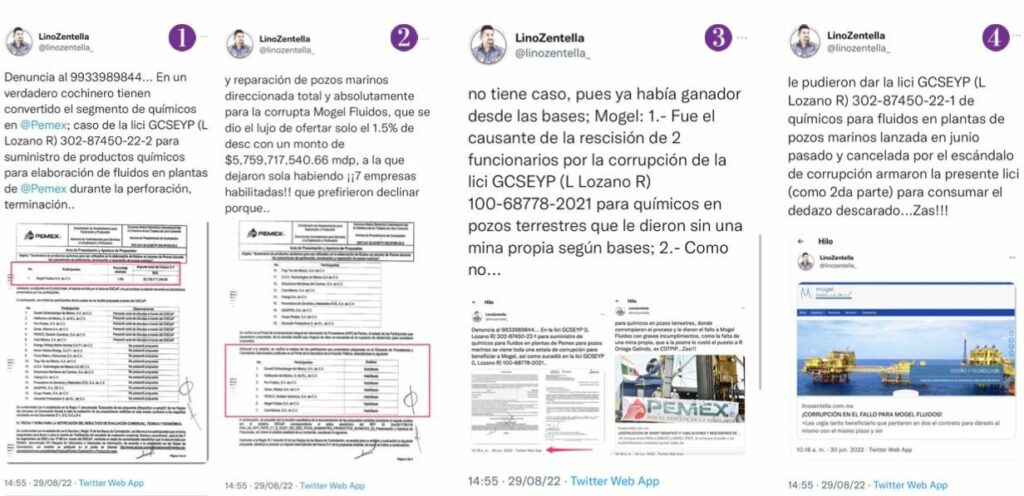 Denuncia al 9933989844… En un verdadero cochinero tienen convertido el segmento de químicos en @Pemex; caso de la lici GCSEYP (L Lozano R) 302-87450-22-2 para suministro de productos químicos para elaboración de fluidos en plantas de @Pemex durante la perforación, terminación y reparación de pozos marinos direccionada total y absolutamente para la corrupta Mogel Fluidos, que se dio el lujo de ofertar solo el 1.5% de desc con un monto de $5,759,717,540.66 mdp, a la que dejaron sola habiendo ¡¡7 empresas habilitadas!! que prefirieron declinar porque no tiene caso, pues ya había ganador desde las bases; Mogel: 1.- Fue el causante de la rescisión de 2 funcionarios por la corrupción de la lici GCSEYP (L Lozano R) 100-68778-2021 para químicos en pozos terrestres que le dieron sin una mina propia según bases; 2.- Como no le pudieron dar la lici GCSEYP (L Lozano R) 302-87450-22-1 de químicos para fluidos en plantas de pozos marinos lanzada en junio pasado y cancelada por el escándalo de corrupción armaron la presente lici (como 2da parte) para consumar el dedazo descarado…Zas!!!