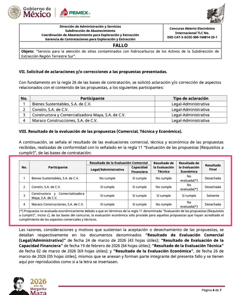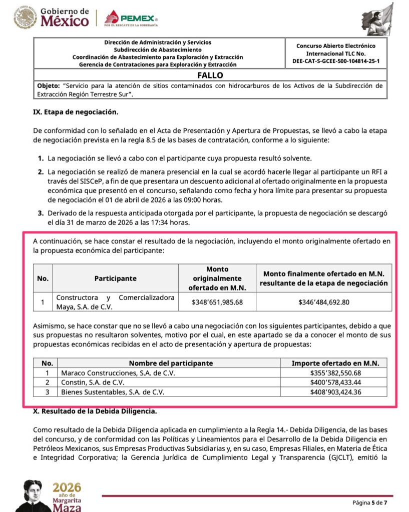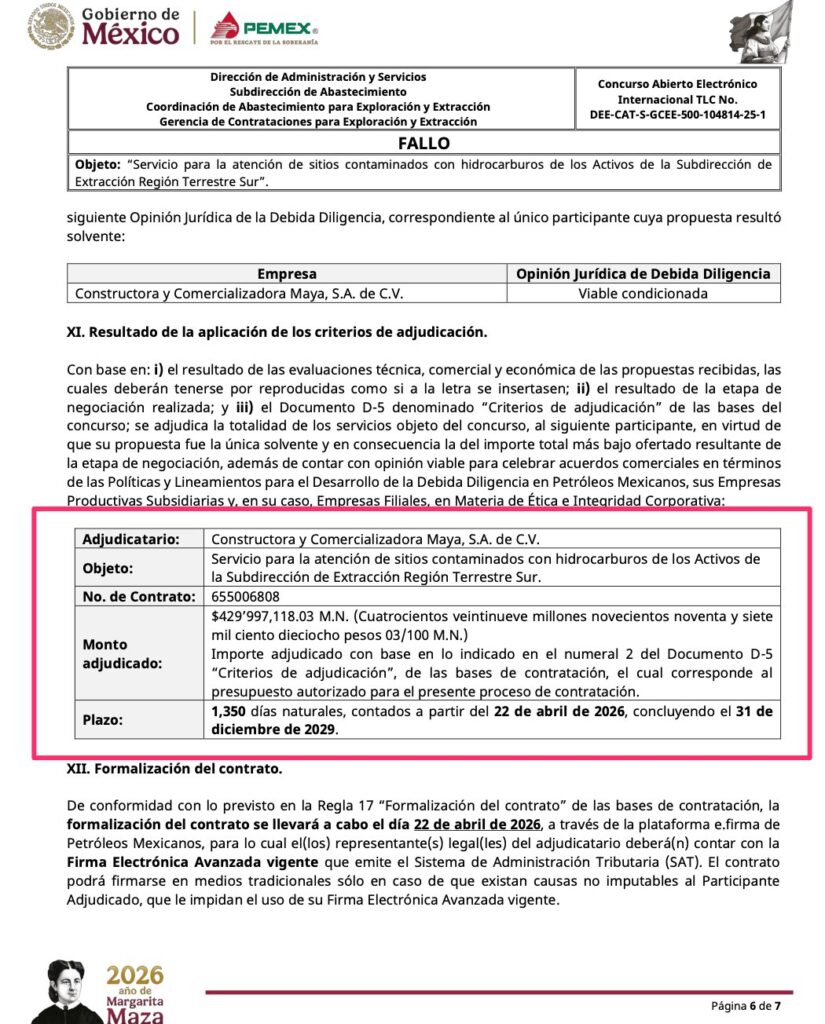 Denuncia al 9933989844… 🚩⚠️💸‼️¡COMERCIALIZADORA MAYA: Consuman corrupción con fallo por 429.9 MDP en remediación Región Sur Pemex! “Consummatum Est” al viciado proceso concursal de la licitación DEE-CAT-S-GCEE-500-104814-25-1 para la atención de sitios contaminados con hidrocarburos de los Activos de la Subdirección de Extracción Región Terrestre Sur (SERTS) de Marcos Torres Fuentes (el padrino de los multimillonarios XV Años) con el fallo a favor de Constructora y Comercializadora MAYA de Amaranto Silva Jiménez y Carmina Mena Jacinto finalmente por 429 997,118.03 pesos que derivó en el contrato número 655006808 contados a partir del 22 de abril de 2026, concluyendo el 31 de diciembre de 2029. Monto mucho mayor al ofertado por esta empresa resultante de la etapa de negociación por 346,484,692.80 pesos (una diferencia de 80 millones de pesos contra el fallo) que inicialmente fue de 348,651,985.68 pesos y solo le aplicó un pírrico descuento. Así mediante corrupción Constructora y Comercializadora MAYA pasó del lugar 4 al lugar 1 con los montos económicos ocultos durante el proceso para corregirle la plana, dejando en el camino a MARACO Construcciones (que en realidad fue el lugar 1 en la primera propuesta económica) por 355,382,550.68 pesos, CONSTIN por 400,578,433.44 pesos y BIENES Sustentables por 408,903,424.36 pesos, descalificándolos en la parte técnica gracias a la magia de Mireya Juanita Miranda, gerente de Mantenimiento, Confiabilidad y Construcción, para que dejarán libre a Constructora y Comercializadora MAYA y fuera la única habilitada para entrar en la etapa de negociación, con lo que se consuma por 5 vez el dedazo a favor en este tipo de trabajos. Se confirman todas las anomalías aquí expuestas desde las bases ex profeso para Constructora y Comercializadora MAYA. Atención @Claudiashein @MarcelaVilleg15 @CNE_Mex @SENER_mx @GobiernoMX @FGRmexico @LuzElena_GE @ASF_Mexico  @SCJN @STPS_mx @Tu_IMSS @SEMARNAT_mx @agencia_asea @CENAGAS_mx @IMPetroleo @SATMX @Hacienda_Mexico @BuenGobierno_mx @Centrofcrl #OIC #UIF #OmarReyesColmenares …Zas!!!