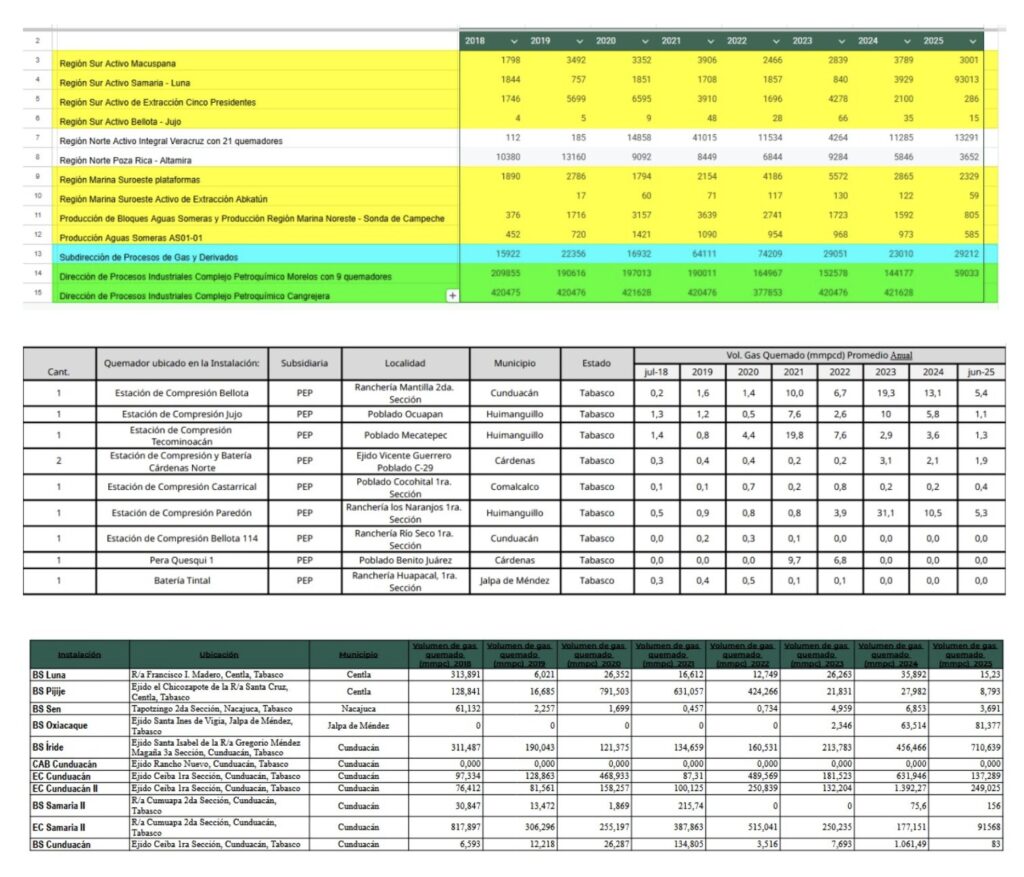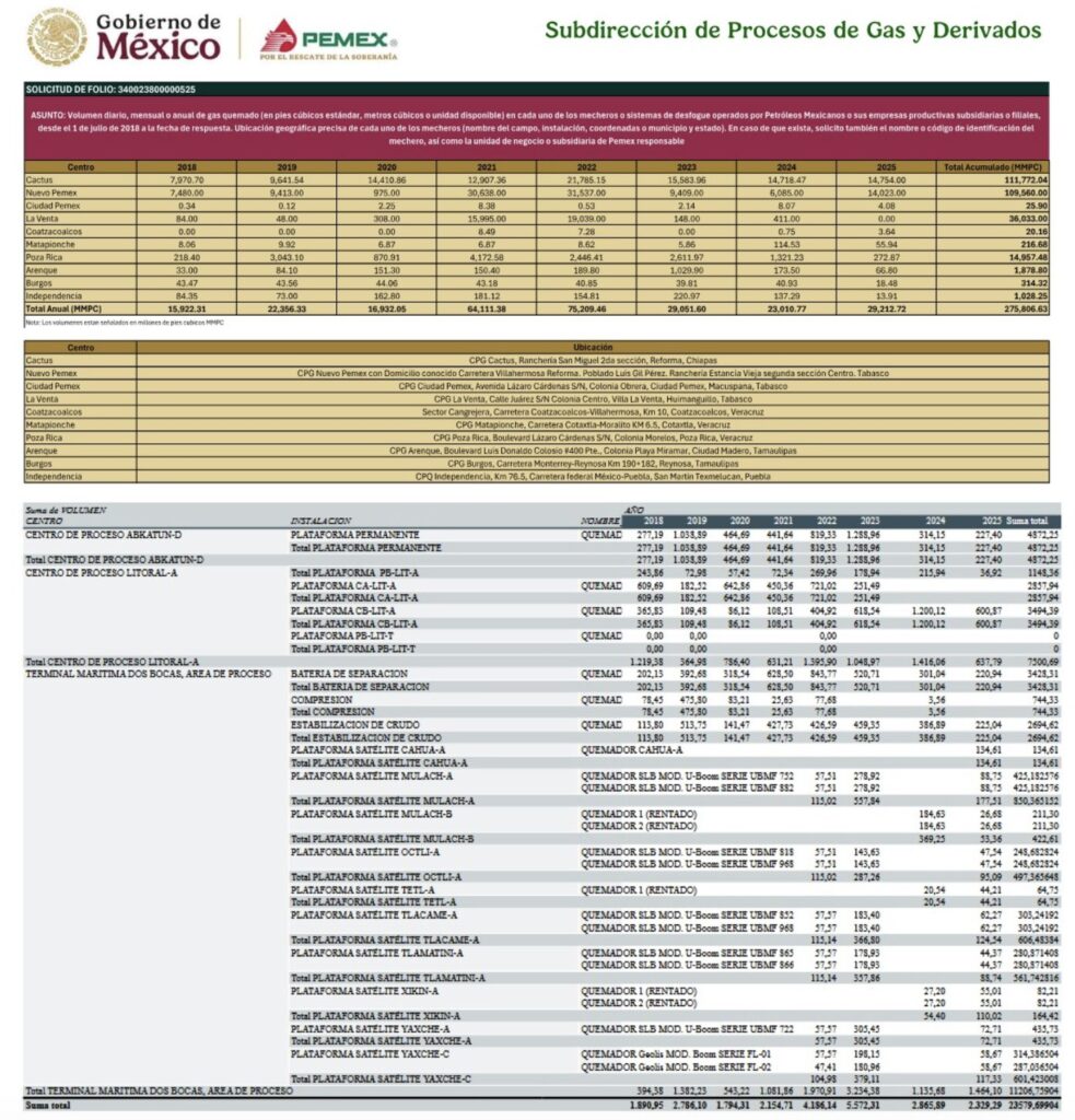 Denuncia al 9933989844… 🚩⚠️🔥 ¡Contamina @Pemex con 644,000 mpc de gas quemado anual el Sur-Sureste; reservó info de refinerías!; entre 2018 y 2024, @Pemex ha quemado en promedio por año 644,000 millones de pies cúbicos (mpc) de gas de los que el 98.5% corresponden a todas sus instalaciones del Sur-Sureste de México, principalmente de los estados de Tabasco, Veracruz y en el área de plataformas en la Sonda Campeche, donde el 2021 fue el año con mayor quema de gas con un pico máximo que superó los 740,000 mpc; esta Información entregada vía Transparencia (folio 340023800000525) sólo reveló los datos anuales de las cantidades de gas quemado por @Pemex en los mecheros de los Activos de Producción Macuspana, Samaria-Luna, Cinco Presidentes, Bellota-Jujo, de plataformas de la Región Marina Suroeste, del Activo de Extracción Abkatún (con 44 mecheros), de la Producción de Bloques Aguas Someras y Producción Región Marina Noreste-Sonda de Campeche, del área de Producción Aguas Someras AS01-01, de la Subdirección de Procesos de Gas y Derivados, y de las Direcciones Industriales de Procesos Industriales en los Complejos Petroquímicos Morelos y Cangrejera; en el documento, @Pemex se negó a transparentar los datos de gas quemados por sus refinerías bajo el argumento que es “información reservada” principalmente del quemador gigantesco de la nueva refinería Olmeca, Paraíso, Tabasco; el total anual de gas quemado por @Pemex de pozos marinos y terrestres, ductos, estaciones de compresión, complejos procesadores de gas y plantas petroquímicas entre los años 2018 y 2024 fue: 1.- En 2018 quemó 621,351 mpc; 2.- En 2019 quemó 632,069 mpc; 3.- En 2020 quemó 649,452 mpc; 4.- En 2021 quemó 740,588 mpc; 5.- En 2022 quemó 677,762 mpc; 6.- En 2023 quemó 661,985 mpc; y 7.- En 2024 quemó 664,854 mpc; sin embargo, en la información que @Pemex entregó sobre los mecheros en sus instalaciones, la Dirección de Procesos Industriales Complejo Petroquímico Cangrejera no reportó cuánto gas ha quemado de enero a julio de 2025 a pesar que está planta está ubicada al sur de Veracruz, por lo que sin estos datos para 2025 la cifra total de gas quemado por Pemex no rebasa los 205,281 mpc; el Activo de Producción Samaria-Luna en Tabasco dio un salto de 3,929 mpc en 2024 hasta 93,013 mpc en 2025; el Activo Integral Veracruz pasó de quemar 14,858 mpc en 2020 a 41,015 mpc en 2021; y en el Activo Macuspana-Muspac en Tabasco reporta que en 2025 quemó 3,001 mpc de gas, menos que en 2024 de 3,789 mpc, sí tuvo incrementos dentro de los mecheros del campo Agave en los 12 mecheros correspondientes a la Batería de Separación del Campo Agave a pocos kilómetros de comunidades como Huasteca 2da donde pasaron de quemar un promedio anual de 37.2 mpc entre 2018 y 2023, hasta 1,696 mpc en 2024 y 2,268 mpc de enero a junio de 2025, mecheros cercanos a comunidades ya causaron molestias en la población donde hay denuncias colectivas de altos niveles de contaminación que ya cobraron 2 vidas humanas y la de varios animales de granja a unos 11 kilómetros de Villahermosa, Tabasco; atención @Claudiashein @MarcelaVilleg15 @CNE_Mex @SENER_mx @GobiernoMX @FGRmexico @LuzElena_GE @ASF_Mexico  @SCJN @STPS_mx @Tu_IMSS @SEMARNAT_mx @agencia_asea @CENAGAS_mx @IMPetroleo @SATMX @Hacienda_Mexico @BuenGobierno_mx @Centrofcrl #OIC #UIF #OmarReyesColmenares …Zas!!!