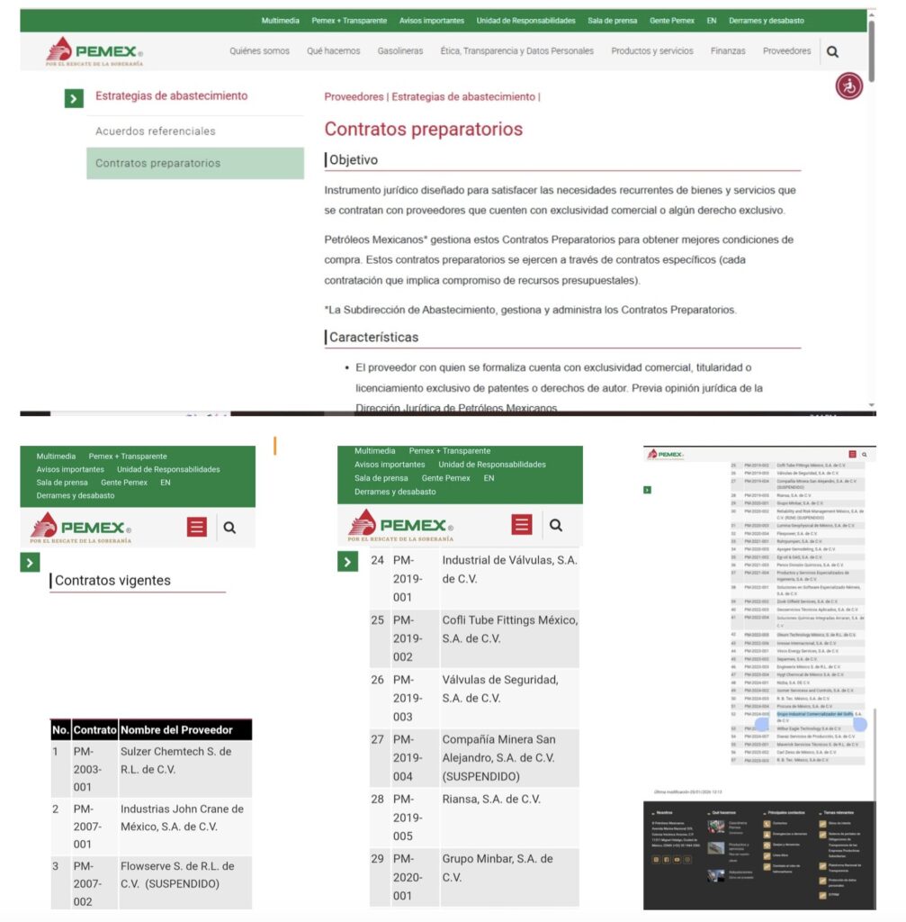 Denuncia al 9933989844…🚩⚠️‼️ ¡Contratos Preparatorios, pretexto para millonarias asignaciones Pemex bajo el agua; MINBAR en el ajo!; en una lista de 51 “contratos preparatorios” vigentes de 55 en total, donde 4 aparecen como “suspendidos”, @Pemex direcciona contratos reales -por debajo de la mesa- a empresas amigas tan grandes como Schlumberger, Honeywell o Diavaz en México; para muestra Grupo Minbar aparece con 2 contratos con @Pemex que superan los 440 millones de pesos derivados de uno contrato preparatorio; @Pemex usa este concepto de “contrato preparatorio” como promesa de pago, de manera operativa realiza acuerdos preliminares donde supuestamente un proveedor es evaluado técnica y económicamente, luego la petrolera nacional establece condiciones para un eventual contrato futuro, sin que aún haya obligación de adquirir bienes o servicios, en la práctica no generan pago ni ejecución aún, pero ya están en la “lista especial” de beneficiarios; en su website, @Pemex explica textualmente que esta forma de contratar es: “un instrumento jurídico diseñado para satisfacer las necesidades recurrentes de bienes y servicios que se contratan con proveedores que cuenten con exclusividad comercial o algún derecho exclusivo, por lo mismo, @Pemex gestiona estos contratos preparatorios para obtener -según- mejores condiciones de compra; contratos preparatorios que se ejercen a través de contratos específicos (cada contratación que implica compromiso de recursos presupuestales)”; es decir, sí hay dinero para pagar estos contratos; @Pemex , en su sitio oficial, enumera a las 57 empresas con las que ha firmado contratos preparatorios, donde los contratos de Perkin-Elmer de México; Flowserve; Compañía Minera San Alejandro de los fraudulentos hermanos San Martín; Reliability and Risk Management México 57; y Hygt Chemical de México aparecen como suspendidos: 1.- Contrato PM-2003-001 con Sulzer Chemtech 2.- Contrato PM-2007-001 para Industrias John Crane de México; 3.- Contrato PM-2007-002 para Flowserve (Suspendido); 4.- Contrato PM-2010-003 para Sulzer Pumps México; 5.- Contrato PM-2011-003 para Sistemas de Información Geográfica; 6.- Contrato PM-2012-001 para Eagleburgmann México; 7.- Contrato PM-2012-006 para Dispositivos Tanseal; 8.- Contrato PM-2013-001 para Talleres Portátiles; 9.- Contrato PM-2013-003 para AAF; 10.- Contrato PM-2013-004 para Perkin-Elmer de México (Suspendido); 11.- Contrato PM-2013-005 para Turbo Control; 12.- Contrato PM-2013-007 para Schlumberger Offshore Services (México); 13.- Contrato PM-2014-004 para Aesseal México; 14.- Contrato PM-2014-006 para Expansión Mecánica; 15.- Contrato PM-2014-009 para Hoerbiger de México; 16.- Contrato PM-2017-001 para Shemensal Holding; 17.- Contrato PM-2017-002 para AMI International; 18.- Contrato PM-2017-003 para Servicios Proyectos y Construcciones del Sureste; 19.- Contrato PM-2017-004 para Procesos Automatizados; 20.- Contrato PM-2017-005 para Honeywell; 21.- Contrato PM-2018-001 para la fraudulenta Mogel Fluidos; 22.- Contrato PM-2018-002 para Innovaciones Petroleras Omega; 23.- Contrato PM-2018-007 para Ramtol Mexicana; 24.- Contrato PM-2019-001 para Industrial de Válvulas; 25.- Contrato PM-2019-002 para la fraudulenta Cofli Tube Fittings México; 26.- Contrato PM-2019-003 para Válvulas de Seguridad; 27.- PM-2019-004 para Compañía Minera San Alejandro de los fraudulentos San Martín que se dan el lujo de tener dos asignaciones a pesar de todas sus tropelías (Suspendido); 28.- Contrato PM-2019-005 para Riansa; 29.- Contrato PM-2020-001 para Grupo Minbar; 30.- Contrato PM-2020-002 para Reliability and Risk Management México (R2M) (Suspendido); 31.- Contrato PM-2020-003 para Lumina Geophysical de México; 32.- Contrato PM-2020-004 para Flexpower; 33.- Contrato PM-2021-001 para Ruhrpumpen; 34.- Contrato PM-2021-002 para Egi Oil & Gas; 35.- Contrato PM-2021-003 para Penco División Químicos; 36.- Contrato PM-2021-004 para Productos y Servicios Especializados de Ingeniería; 37.- Contrato PM-2022-001 para Soluciones en Software Especializado Nemsis; 38.- Contrato PM-2022-002 para Zook Oilfield Services; 39.- Contrato PM-2022-003 para Geoservicios Técnicos Aplicados; 40.- Contrato PM-2022-004 para Soluciones Químicas Integradas Arcaran de los fraudulentos hermanos Soto Piantta; 41.- Contrato PM-2022-005 para Oleum Technology México; 42.- Contrato PM-2022-006 para Ivresse Internacional; 43.- Contrato PM-2023-001 para Vinco Energy Services; 44.- Contrato PM-2023-002 para Separmex; 45.- Contrato PM-2023-003 para Engineerix México; 46.- Contrato PM-2023-004 para Hygt Chemical de México (Suspendido); 47.- Contrato PM-2024-001 para Nizba; 48.- Contrato PM-2024-002 para Isomer Services and Controls; 49.- Contrato PM-2024-003 para RBTec de México; 50.- Contrato PM-2024-004 para Procura de México; 51.- Contrato PM-2024-006 para Wilbur Eagle Technology; 52.- Contrato PM-2024-007 para Diavaz Servicios de Producción de los Vázquez Senties; 53.- Contrato PM-2025-001 para Maverick Servicios Técnicos; 54.- Contrato PM-2025-002 para Carl Zeiss de México; y 55.- Contrato PM-2025-003 para RBTec de México (que se da el lujo de tener dos preparatorios); el caso de Grupo Minbar de J Pilar Pineda Alvear, Luis Guillermo Pineda Pedroza y Jesús Carlos Carrales García, con sede en Reynosa, Tamaulipas, es revelador porque descubre el modus operandis de esta mafia ya que el contrato preparatorio PM-2020-001, es la muestra de que son la fachada para asignar por debajo de la mesa otros contratos reales y millonarios sin licitación a empresas privilegiadas; existen 2 contratos específicos públicos firmados en el sexenio de AMLO/Agrónomo, uno entre Minbar y @Pemex en 2022, y otro en periodo de Sheinbaum/Padilla en 2025, ambos por un monto de 441,780,230 pesos; en cada contrato se hace referencia por escrito el número del contrato preparatorio del que derivan estos convenios de Minbar