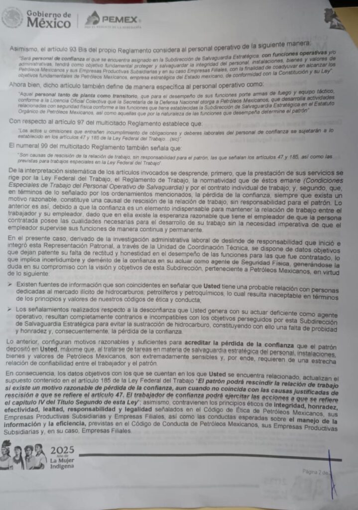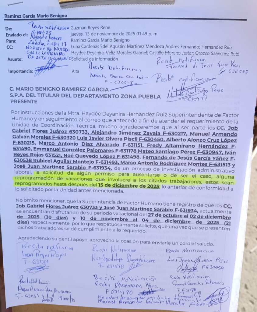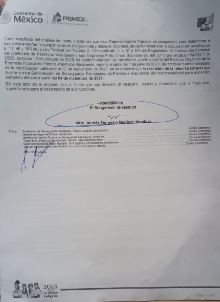 Denuncia al 9933989844… 🚩⚠️🧑🏭 ¡Corren a 23 Agentes Especiales en Puebla, acusan cargos inventados DLSE-SSESFI Pemex!; la Dirección de Logística y Salvaguardia Estratégica (DLSE) @Pemex , de Israel Benítez López, y la Subdirección de Salvaguardia Estratégica, Seguridad Física e Industrial (SSESFI), de Genaro Robles Casillas, enfrentan cuestionamientos internos por la forma en que ejecutó la investigación administrativa y posterior rescisión laboral de 23 agentes operativos entre el 13 de noviembre y el 4 de diciembre de 2025; los trabajadores afectados aseguran que fueron separados sin explicación previa, sin ser llamados al procedimiento de investigación y sin recibir el finiquito correspondiente, mientras que la documentación oficial muestra un proceso acelerado, con restricciones laborales y acusaciones graves sustentadas en información que no fue expuesta a los involucrados; de acuerdo con los testimonios, el procedimiento se activó el 13 de noviembre de 2025, fecha en que personal de la Unidad de Coordinación Técnica (UCT) entregó a los agentes de Seguridad Física (“especiales”) un oficio que los colocaba bajo investigación administrativa-laboral; el documento provenía de instrucciones de Haydée Deyanira Hernández Ruiz, superintendente de Factor Humano, y fue dirigido a Mario Benigno Ramírez García, SPA del Departamento Zona Puebla; el oficio enlista a 15 trabajadores por nombre y número de folio: Job Gabriel Flores Juárez (630733), Alejandro Jiménez Zavala (F-630217), Manuel Armando Galván Morales (F-630320), Luis Javier Olvera Piscil (F-630450), Alberto Alonzo Cruz López (F-630215), Marco Antonio Díaz Alvarado (F-631151), Fredy Altamirano Hernández (F-631490), Emmanuel González Palomares (F-631178), Mateo Santiago Pérez (F-630947), Iván Reyes Rojas (631521), Noé Quevedo López (F-631498), Fernando de Jesús García Yáñez (F-630538), Rubicel Aguilar Montejo (F-631493), Marco Antonio Rodríguez Montes (F-631513) y José Juan Martínez Sarabio (F-631934); el documento instruía reprogramar permisos y vacaciones hasta después del 15 de diciembre de 2025, y advertía que dos de ellos (Flores Juárez y Martínez Sarabio) se encontraban de vacaciones, por lo que debían ser notificados al reincorporarse; pese a que la carta afirmaba que existía una investigación en curso, los agentes aseguran que nunca se les comunicó el motivo, ni se les convocó a declarar ni a participar en diligencias; la UCT tampoco habría proporcionado detalles cuando los trabajadores buscaron conocer el origen del proceso; el 4 de diciembre de 2025, antes del plazo señalado en el oficio inicial, la UCT regresó a los centros de trabajo para entregar las cartas de rescisión laboral a los 23 agentes. Los testimonios señalan que el procedimiento se realizó sin reunión previa, sin audiencia y con instrucciones directas de firmar la baja inmediata y entregar la credencial de @Pemex , bajo el argumento de “pérdida de confianza”; esta actuación generó denuncias de humillación y discrecionalidad, pues los agentes sostienen que nadie del personal de la UCT pudo explicar las razones concretas del despido, afirmando únicamente que habían sido “mandados” para ejecutar la rescisión; los trabajadores agregan que tampoco se les entregó el finiquito correspondiente; la carta de rescisión, fechada el mismo 4 de diciembre, se sustenta principalmente en los artículos 185 de la Ley Federal del Trabajo, así como en diversos preceptos del Reglamento de Trabajo del Personal de Confianza @Pemex , incluidos los artículos 4, 93, 93 Bis, 97, 99 y 100; el documento expone que el personal operativo de Salvaguardia Estratégica requiere un nivel de confianza total, pues su labor implica portar armamento, operar bajo la Licencia Oficial Colectiva, proteger instalaciones estratégicas y actuar sin supervisión continua; la DLSE-SSESFI argumenta que, durante la investigación administrativa, obtuvo “datos objetivos” que apuntan a dos presuntas conductas graves: 1.- Indicios de probable relación con personas involucradas en actividades ilícitas relacionadas con hidrocarburos y 2.- Actuación deficiente que habría generado desconfianza e incompatibilidad con los objetivos de la DLSE-SSESFI en materia de combate al robo de combustible; la dependencia concluye que estas circunstancias configuraron pérdida de confianza y justificaron la rescisión inmediata sin responsabilidad para el patrón; asimismo, solicita la devolución de armamento, uniformes y equipo táctico, carta está firmada por el Subgerente de Gestión, con copia para Andrés Fernando Martínez Mendoza; los 23 agentes aseguran que la DLSE-SSESFI y la UCT incurrieron en múltiples irregularidades procedimentales durante la supuesta investigación administrativa; de acuerdo con su testimonio, nunca recibieron información sobre el contenido, naturaleza o pruebas del proceso que se dijo iniciado en su contra, ni fueron convocados a las oficinas centrales en la Ciudad de México, como ocurre regularmente en los procedimientos formales de deslinde de responsabilidades; también señalan que la rescisión de su contrato se ejecutó antes del 15 de diciembre, fecha en la que teóricamente concluirían las restricciones impuestas por la investigación, lo que contradice el propio aviso que les fue entregado semanas antes; afirman que jamás tuvieron acceso a evidencias, indicios o documentos que acreditaran las acusaciones mencionadas en las cartas de despido, y que la notificación se realizó frente a otros trabajadores, generando estigmatización y un daño público inmediato; a ello se suma que no recibieron el finiquito correspondiente, pese a tratarse de una rescisión imputada al patrón; los afectados consideran que el procedimiento fue completamente unilateral, sin oportunidad de defensa y sin participación alguna en la investigación, contraviniendo los principios de debido proceso labora
