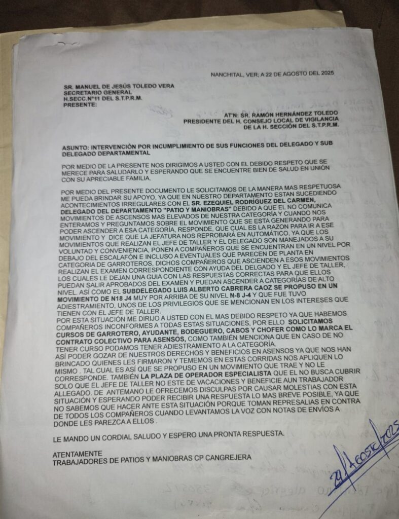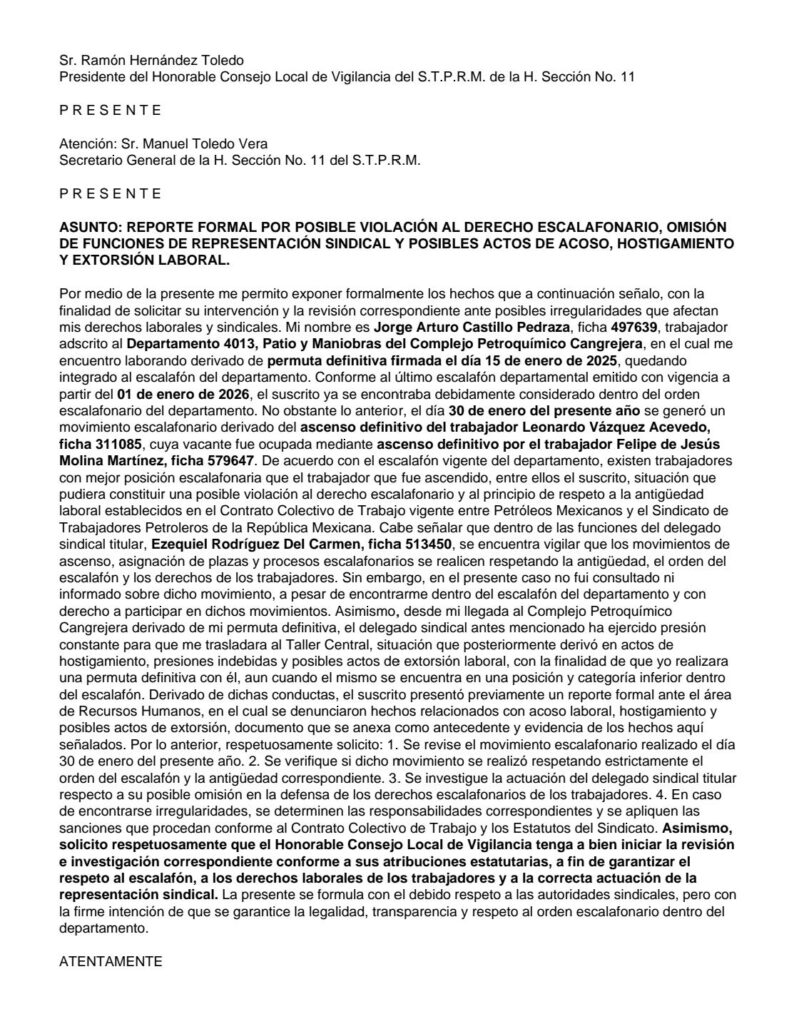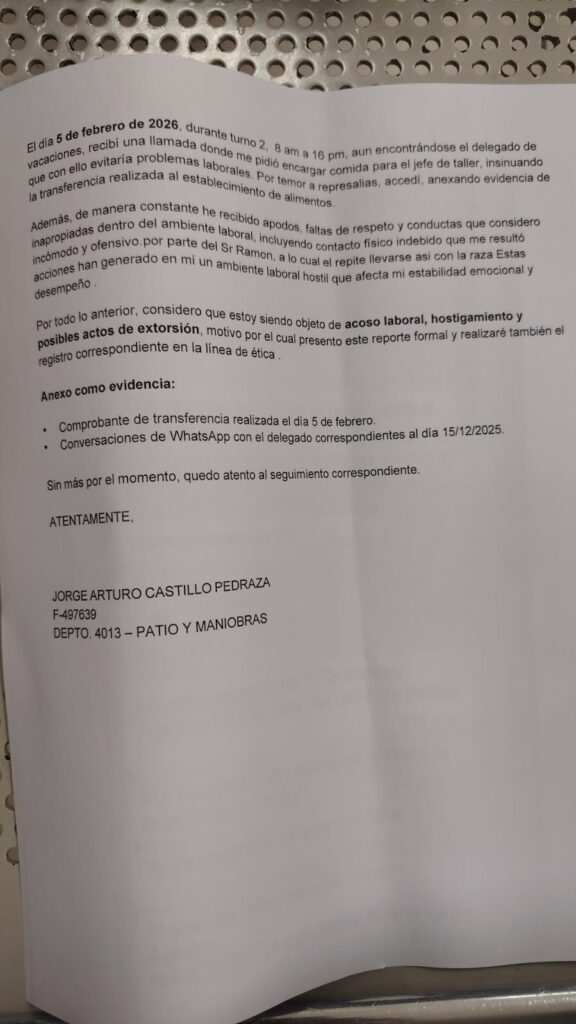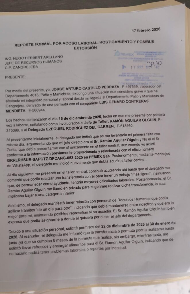 Denuncia al 9933989844… 🚩⚠️ ¡CP CANGREJERA: Exponen otras marrullerías de OLGUÍN/EZEQUIEL/ CAOZ/HERBERT/TOLEDO-STPRM! Trabajadores del Complejo Petroquímico (CP) Cangrejera del gerente Octaviano Tenorio Herrera en Coatzacoalcos, Veracruz, señalan que siguen haciendo de las suyas los jefes del Departamento Patio y Maniobras, peor aún es que acumulan acumulan acusaciones en su contra sin que Recursos Humanos @Pemex haga algo al respecto, lo que los coloca en un estado de indefensión. En este nuevo hecho, le hicieron la vida imposible al trabajador Jorge Arturo Castillo Pedraza (F-497639) quien llegó de permuta de Ciudad Madero al CP Cangrejera. Según el oficio de queja por acoso laboral, hostigamiento y posible extorsión dirigido a Hugo Herbert Arellano, jefe de Recursos Humanos, Castillo Pedraza, trabajador del Departamento 4013, Patio y Maniobras, derivado de una permuta con Luis Genaro Contreras Mendieta (F-560944), el pasado 15 de diciembre de 2025, se presentó a laborar, señalando como involucrados al jefe de Taller, Ramón Aguilar Olguín (F-315399) y al delegado Ezequiel Rodríguez del Carmen (F-513460). Cuenta que el delegado le indicó que le levantaría su primera falta ese mismo día, argumentando que su jefe directo era Ramón Aguilar Olguín y no el “señor Zurita”, por lo que debía presentarme en el taller central, aun cuando Castillo Pedraza acudió conforme a la información previamente proporcionada y relacionada con el oficio número GRRLRHSUR-SAPCTZ-DPCANG-053-2025 en @Pemex Gas. Posteriormente, mediante mensajes de WhatsApp, el delegado le indicó nuevamente que debía acudir al taller central. Al día siguiente se presentó en el taller central; continuó acudiendo hasta que el delegado le comentó que podía realizar una transferencia con el para tener un trabajo “más ligero”, insinuando que, de permanecer como ayudante, el tendría mayores dificultades laborales. Posteriormente, Ramón Aguilar Olguín le llamó en privado para sugerirle realizar dicha transferencia, lo cual implicaba bajarlo a una categoría inferior. Asimismo, el delegado manifestó tener relación con personal de Recursos Humanos que podía agilizar trámites “de un día para otro”, indicando que debía mantenerse entre ellos y que era lo mejor para el, insinuando posibles represalias si no accedía. Ramón Aguilar Olguín también expresó que podía asignarlo a donde él quisiera por el ser el jefe del departamento. Debido a una situación personal, solicité permisos del 22 de diciembre de 2025 al 30 de enero de 2026. Al reanudar, el delegado me informó que la transferencia o permuta podría realizarse hasta junio ya que se cumplan 6 meses de la permuta que realizó; sin embargo, mientras tanto, le solicitó llevar refrescos y encargar alimentos para Ramón Aguilar Olguín, indicando que de no hacerlo podría tener problemas laborales o reportes por ineptitud. El 5 de febrero de 2026, durante el turno 2 de 8 am a 16 pm, aún encontrándose el delegado de vacaciones, recibió una llamada donde le pidió encargar comida para el jefe de taller, insinuando que con ello evitaría problemas laborales. Por temor a represalias, accedí, anexando evidencia de la transferencia realizada al establecimiento de alimentos. Inapropiadas dentro del ambiente laboral, incluyendo contacto físico indebido que de manera constante recibió apodos, faltas de respeto y conductas que considera incómodas y ofensivas por parte de Ramón Aguilar Olguín, “porque así se lleva con la raza”. Señalamientos que también denunció en la línea de ética @Pemex anexando pruebas de sus dichos como las transferencias. Asimismo, en otros casos los trabajadores han denunciado a los mismos funcionarios y hechos de abuso -datados y anexados aquí- ante la Sección 11 STPRM del eterno cacique Ramón Hernández Toledo y su títere Manuel de Jesús Toledo Vera donde tampoco transitan las demandas, por lo que señalan podrían ser también parte de esta mafia laboral, a la que se agrega el subdelegado Luis Alberto Cabrera Caoz. Atención @Claudiashein @MarcelaVilleg15 @CNE_Mex @SENER_mx @GobiernoMX @FGRmexico @LuzElena_GE @ASF_Mexico  @SCJN @STPS_mx @Tu_IMSS @SEMARNAT_mx @agencia_asea @CENAGAS_mx @IMPetroleo @SATMX @Hacienda_Mexico @BuenGobierno_mx @Centrofcrl #OIC #UIF #OmarReyesColmenares …Zas!!!