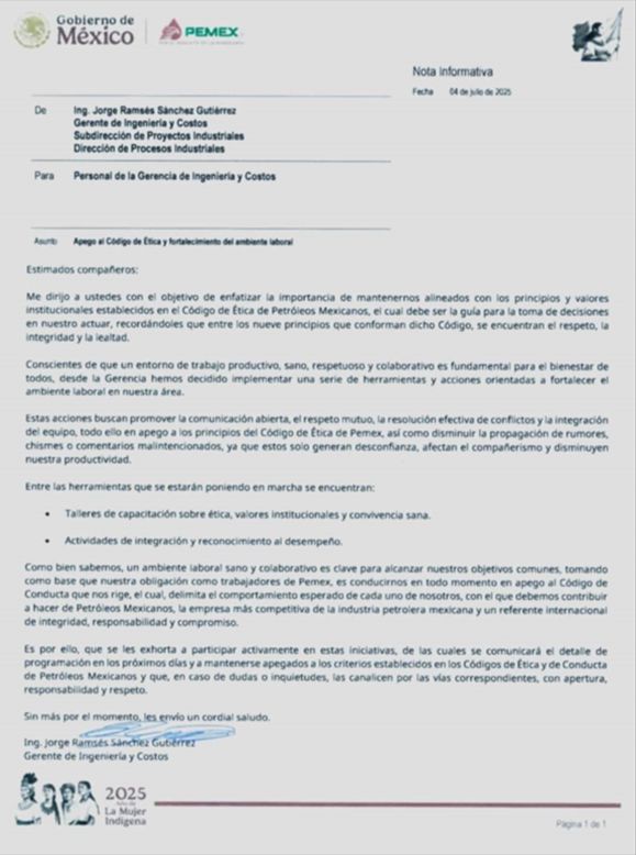 Denuncia al 9933989844… 🚩⚠️🧑🏭🏭‼️¡Cumpleaños de GABRIEL GALLEGOS arriesga operación de refinería Salina Cruz; hubo dron y video!; en un hecho que ha levantado severos cuestionamientos sobre la ética y el uso de recursos públicos en @Pemex , personal del Proyecto de Aprovechamiento de Residuales en la Refinería Antonio Dovalí Jaime de Salina Cruz, Oaxaca, del gerente Arturo Recio Espinoza, ha denunciado la interrupción de actividades críticas para la realización de un evento privado; según la información recabada, directivos del proyecto obligaron a más de un centenar de ingenieros a detener sus labores durante aproximadamente tres horas para grabar un video de felicitación con motivo del cumpleaños número 46 de Gabriel Gallegos Velázquez, actual Subdirector de Proyectos Industriales (SPI) de la Dirección de Procesos Industriales (DPI) de Carlos Armando Lechuga Aguiñaga; los hechos tuvieron lugar durante la mañana, coincidiendo con la reunión de inicio de jornada programada habitualmente a las 7:00 am; por instrucciones directas de Francisco Jesús Violante Butcher, quien se desempeña como sub gerente de la Disciplina Mecánica de la Gerencia de Ingeniería y Costos, así como director del Proyecto de Aprovechamiento de Residuales, se ordenó a los asistentes trasladarse a un área abierta contigua a la fosa de coque de la Planta de Coquización Retardada (PCR); en el sitio se congregaron más de 132 ingenieros de la paraestatal, con niveles jerárquicos que oscilan entre el 35, 37 y 41, quienes fueron sustraídos de sus responsabilidades técnicas y de supervisión; la logística del evento estuvo a cargo de Nadia María Jiménez Delgado, coordinadora del Departamento de Seguridad Industrial de la Gerencia de Ingeniería y Costos y coordinadora de Plantas Nuevas y Revamps del mismo proyecto; Nadia María Jiménez Delgado indicó al personal que la suspensión de actividades era obligatoria para participar en la grabación de un material audiovisual destinado a agradecer las supuestas ventajas y consideraciones otorgadas por la máxima autoridad del proyecto; la instrucción incluía realizar ovaciones y demostraciones de gratitud hacia el festejado, bajo un ambiente que fue descrito por los presentes como hostil, marcado por ensayos repetidos, llamadas de atención, burlas y tratos vejatorios por parte de los organizadores hasta lograr la toma deseada; para la realización del video se utilizó un dron propiedad de un particular, el cual operó sobre las instalaciones estratégicas federales, presuntamente sin los permisos ni el conocimiento del personal de seguridad de la refinería; los ingenieros fueron obligados a posicionarse en tierra formando el número 46, en alusión a la edad de Gabriel Gallegos Velázquez; esta actividad implicó el cese total de labores fundamentales, tales como el inicio de trabajos en frentes de obra, reuniones de seguimiento, supervisión de campo y atención a proveedores, generando un retraso operativo significativo en un proyecto prioritario para la nación; al concluir la grabación, Francisco Jesús Violante Butcher dirigió un mensaje a los subordinados, enfatizando que dicho gesto sería altamente valorado por su superior, el Gabriel Gallegos Velázquez, y que la participación en el evento generaría beneficios laborales al demostrar una alineación incondicional con la autoridad del proyecto; el producto final, un videoclip de poco más de un minuto, muestra a Francisco Jesús Violante Butcher como único orador, extendiendo bendiciones y agradecimientos en nombre del equipo, mientras las tomas aéreas revelan no sólo la formación humana, sino también las instalaciones de la Planta de Coquización Retardada en construcción, exponiendo infraestructura crítica mediante un barrido de cámara; este incidente ha sido señalado como una presunta violación a la normativa interna y federal; se acusa a los organizadores, Francisco Jesús Violante Butcher y Nadia María Jiménez Delgado, de contravenir el Reglamento de Trabajo del Personal de Confianza y el Código de Ética de @Pemex , al utilizar recursos humanos e instalaciones para fines ajenos a los objetivos de la empresa, poniendo en riesgo la seguridad operativa y faltando al respeto a la dignidad de los trabajadores; asimismo, se señala un incumplimiento del Código de Conducta al divulgar información visual de instalaciones restringidas y ejercer abuso de poder para coaccionar a los empleados; desde una perspectiva legal más amplia, las acciones descritas podrían constituir violaciones a la Ley General de Responsabilidades Administrativas; los funcionarios son señalados por presunto desvío de recursos públicos, abuso de funciones, cohecho y tráfico de influencias, al utilizar su posición jerárquica para obtener beneficios personales o favores políticos futuros, contraviniendo los principios de legalidad, honradez y eficiencia que deben regir el servicio público; adicionalmente, el uso del dron en una zona restringida sin la debida certificación infringe la Norma Oficial Mexicana NOM-107-SCT3-2019 de la Agencia Federal de Aviación Civil, lo que representa un riesgo latente para la seguridad de la refinería; una transgresión directa a la Ley Federal de Austeridad Republicana, que prohíbe el uso de recursos institucionales para fines distintos a los asignados, y desatiende las instrucciones explícitas emitidas en julio de 2025 por Jorge Ramsés Sánchez Gutiérrez, gerente de Ingeniería y Costos, quien había instado al fortalecimiento del ambiente laboral y el apego estricto al código de ética; la situación expone un presunto esquema de corrupción y abuso de autoridad donde los intereses personales se antepusieron al desarrollo de infraestructura energética clave para el país; atención @Claudiashein @MarcelaVilleg15 @CNE_Mex @SENER_mx @GobiernoMX @FGRmexico @LuzElena_GE @ASF_Mexico @SCJN @STPS_mx @Tu_IMSS @SEMARNAT_mx @agenc