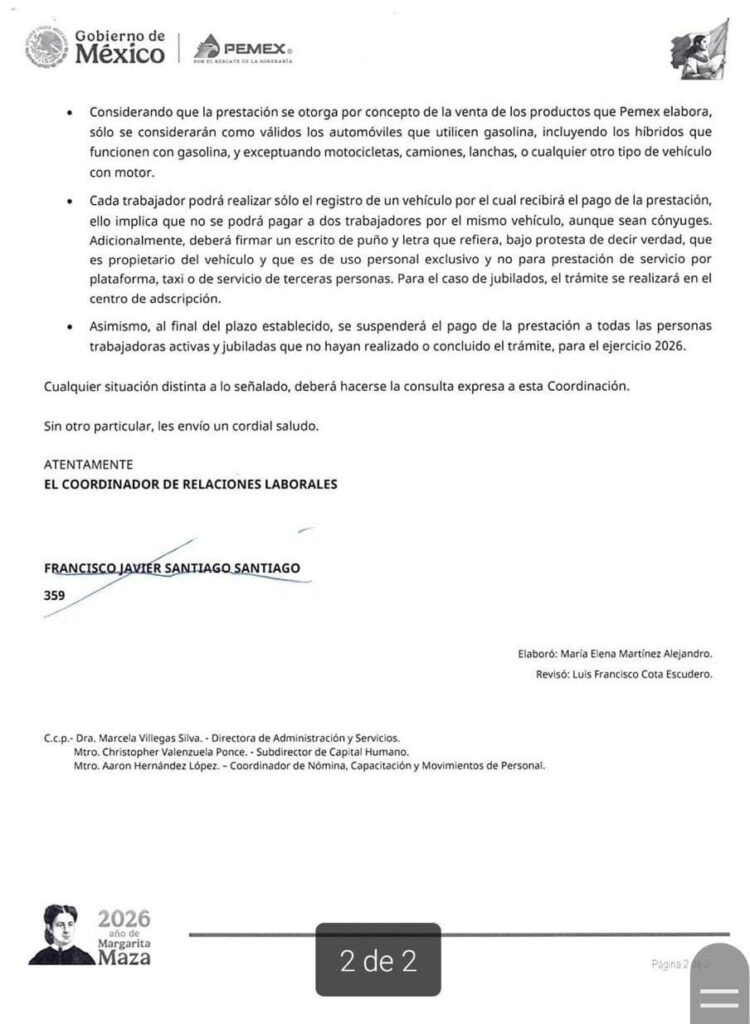 Denuncia al 9933989844… 🚩⚠️⛽️❗️¡DAS Pemex caza huachicoleros en prestación de gasolina a activos y jubilados!; la Dirección de Administración y Servicios (DAS) @Pemex de Marcela Villegas Silva puso en marcha para 2026 un proceso de verificación estricta de la propiedad vehicular como requisito indispensable para justificar el pago de la prestación de gasolina, una medida que ha generado preocupación e inconformidad entre trabajadores activos y jubilados, particularmente en refinerías, donde ya se reportan casos de trámites rechazados y advertencias de suspensión del beneficio. Así como otros activos donde hay fuertes recobros retroactivos por violaciones en la documentación procesada en años anteriores. El procedimiento fue formalizado mediante un oficio fechado el 4 de febrero de 2026, emitido en la Ciudad de México por la Subdirección de Capital Humano (SCH) de Christopher Valenzuela Ponce, a través de la Coordinación de Relaciones Laborales de Francisco Javier Santiago Santiago, con fundamento en el Estatuto Orgánico de la Empresa Productiva del Estado (EOEPE) y en las Cláusulas 135, Inciso C), y 182 del Contrato Colectivo de Trabajo Vigente (CCTV). El documento establece que la verificación se realizará del 9 de febrero al 8 de junio de 2026 y será obligatoria tanto para personal activo como para jubilados, sin posibilidad de prórroga. De acuerdo con los nuevos criterios, cada gerente regional de Relaciones Laborales —Alberto Contreras Huerta en la Región Norte, Cristóbal Gilberto Lara Campos en la Región Sur, Juan Francisco Lechuga Arana en el Altiplano y Leonel Alejandro Cruz Labastida en el Sureste— deberá definir sedes, calendarios y etapas del proceso, además de comunicar la programación a las secciones sindicales correspondientes. El objetivo oficial es fortalecer los mecanismos de control interno y verificar con mayor rigor el cumplimiento de los requisitos para el otorgamiento de la prestación. La principal novedad radica en la exigencia de documentación actualizada y vigente. Los trabajadores deberán acreditar la propiedad del vehículo mediante factura o carta factura, así como tarjeta de circulación en regla, a nombre del trabajador o de su cónyuge, en cuyo caso será obligatorio presentar un acta reciente de matrimonio. La autoridad laboral interna verificará la autenticidad de los documentos en plataformas oficiales y, en caso de detectar irregularidades o documentos apócrifos, dará aviso inmediato para iniciar una investigación laboral. En los hechos, esta disposición ha derivado en un endurecimiento de los filtros administrativos. Trabajadores señalan que, a diferencia de años anteriores, ya no se aceptan documentos antiguos ni trámites incompletos y que incluso vehículos con placas y tarjetas de circulación de ejercicios previos han sido motivo de rechazo. La consigna es clara: quien no actualice placas, tarjetas y comprobantes conforme a los nuevos lineamientos no podrá ingresar documentación y perderá el acceso a la prestación. El impacto también alcanza a los jubilados, quienes durante años asumieron que su condición vitalicia los eximía de este tipo de revisiones. Sin embargo, el oficio establece explícitamente que el trámite también es obligatorio para ellos y que deberá realizarse en su centro de adscripción. La consecuencia de no cumplir es la suspensión automática del pago de gasolina para todo el ejercicio 2026, sin distinción entre personal en activo o retirado. El alcance de la prestación se limita, además, al tipo de vehículo. Sólo serán válidos los automóviles que utilicen gasolina, incluidos los híbridos que funcionen con este combustible. Quedan excluidos de manera expresa motocicletas, camiones, lanchas y cualquier otro tipo de vehículo con motor. Cada trabajador podrá registrar únicamente un vehículo, y se prohíbe que un mismo automóvil genere el pago de la prestación a dos personas, incluso si son cónyuges. Como parte del trámite, los trabajadores deberán firmar un escrito de puño y letra en el que declaren, bajo protesta de decir verdad, que son propietarios del vehículo y que éste es de uso personal exclusivo, descartando su utilización para plataformas digitales, taxis o servicios a terceros. Esta declaración añade un componente de responsabilidad directa que, en caso de falsedad, podría derivar en sanciones laborales. El oficio concluye señalando que cualquier situación no prevista deberá consultarse de manera expresa con la Coordinación de Relaciones Laborales, encabezada por Francisco Javier Santiago Santiago, quien suscribe el documento. Mientras tanto, en los centros de trabajo ya se percibe un clima de presión, ante la advertencia de que el plazo es limitado y que la consecuencia de no cumplir será inmediata. atención @Claudiashein @MarcelaVilleg15 @CNE_Mex @SENER_mx @GobiernoMX @FGRmexico @LuzElena_GE @ASF_Mexico @SCJN @STPS_mx @Tu_IMSS @SEMARNAT_mx @agencia_asea @CENAGAS_mx @IMPetroleo @SATMX @Hacienda_Mexico @BuenGobierno_mx @Centrofcrl #OIC #UIF #OmarReyesColmenares …Zas!!!
