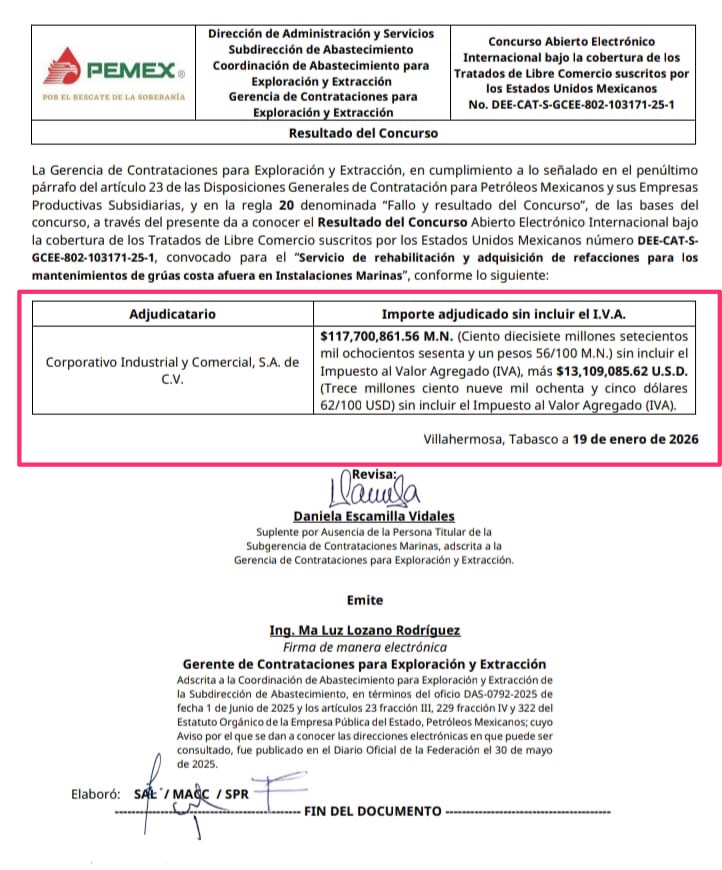 Denuncia al 9933989844… 🚩⚠️‼️¡Dedazo de 343 MDP a CICSA/ANDRÉS GARCÍA; influyentismo de 5,561 MDP en Pemex!; hace de “todo” en la petrolera nacional, tanto renta barcos chatarra como vende medicinas y textiles por miles de millones de pesos. Este 19 de enero pasado en una simulación concursal @Pemex le asignó el fallo de la licitación DEE-CAT-S-GCEE (Lucy Lozano Rodríguez, que estaría con un pie afuera) 802-103171-25-1 a Corporativo Industrial y Comercial (CICSA), propiedad de Andrés García Castillo “El Actor” con todo y que @Pemex ocultó el monto propuesto en la apertura de propuestas, para cumplir con el servicio de rehabilitación y adquisición de refacciones para los mantenimientos de grúas costa afuera en instalaciones marinas, contrato que fue asignado por 343,856,053.66 pesos y a un plazo hasta el 31 de diciembre de 2028. Aunque mostraron interés en participar la fraudulenta Corporación ITAIPU de Venis Padilla Chan y Luis Fernando González Gutiérrez “El Vampiro Morferatu”; además de Centro de Ingeniería Alexander y SYSMEF, al momento de ofertar se echaron para atrás y dejaron sospechosamente sola a CICSA. Los funcionarios de @Pemex que avalaron el fallo con sus firmas fueron: Daniela Escamilla Vidales, SPA del Titular de la Subgerencia de Contrataciones Marinas, adscrita a la Gerencia de Contrataciones para Exploración y Extracción; y Lucy Lozano Rodríguez, gerente de Contrataciones para Exploración y Extracción, adscrita a la Coordinación de Abastecimiento para Exploración y Extracción de la Subdirección de Abastecimiento. CICSA, con sede en Comalcalco, Tabasco, creció como la espuma en el sexenio pasado gracias a la relación que Andrés García Castillo mantuvo con El Agrónomo ex director de @Pemex , vía el actual gobernador @TabascoJavier , originario de Comalcalco, quien a su vez se dice “hermano” del Agrónomo. En total, Andrés García Castillo ha logrado amasar una fortuna de 5,531,341,170.23 pesos en 16 contratos con 6 empresas familiares (1.- CICSA, 2.- Arrow Marine Logistic Services, 3.- Operadora de Servicios Energéticos, 4.- Garci-SaCorp, 5.- EmeshCorp y 4.- Construcciones Garza) que mantiene con sus hermanos Tito Livio y Ángel Ernesto García Castillo, y su hija Karla Kristhel García Denis por 5,561,956,430 pesos. Solamente de CICSA los contratos son 9 contratos (1 con EPN/Treviño, 5 con AMLO/Agrónomo y 3 vigentes con Sheinbaum/Padilla): 1.- Contrato 658815805 para servicio de rehabilitación y mantenimiento a grúas Seatrax Marine Cranes, incluye certificación y refacciones, vigente del 27/03/2025 al 31/12/2027, por 84,437,236.34 pesos. 2.- Contrato 648224865 para servicios de transporte de carga y descarga de materiales en puerto e instalaciones terrestres y donde PEP ahora DEE lo indique, Partida 2”, vigente del 25/10/2024 al 31/12/2027, por un monto de 2,277,848,067 pesos. 3.- Contrato 648813852 para rehabilitación y servicios a grúas de pedestal en instalaciones marinas de PEP ahora DEE, incluye adquisición de refacciones, vigente del 23/10/2023 al 30/06/2025, por 861,401,636.10 pesos. 4.- Contrato 648813842 para servicio de rehabilitación y mantenimiento a grúas Seatrax Marine Cranes, incluye certificación y refacciones, vigente del 31/05/2023 al 31/12/2024, mediante Adjudicación Directa, por 45,636,941.90 pesos. 5.- Contrato 648812815 para servicio de transporte de carga y descarga de materiales en puerto e instalaciones terrestres y donde PEP-DEE lo indique, Partida 2, vigente del 30/09/2022 al 31/12/2024, por 968,600,496 pesos. 6.- Contrato 648223006 para adquisición de equipos para apoyo a las operaciones terrestres en los muelles de PEP-DEE, vigente del 22/11/2023 al 16/09/2024, por un monto de 35,699,474.38 pesos. 7.- Contrato 648228851 para servicios de transporte de carga y descarga de materiales en puerto Isla del Carmen, vigente del 09/10/2018 al 30/09/2022, por 330,640,649.30 pesos. 8.- Contrato 648029602 para adquisición de refacciones para la rehabilitación y mantenimiento de grúas Nautilus, incluye servicios y asistencia técnica, vigente del 29/08/2019 al 31/05/2022, por 145,042,311 pesos. Todos los de CICSA por 5,093,162,865.68 pesos. atención @Claudiashein @MarcelaVilleg15 @CNE_Mex @SENER_mx @GobiernoMX @FGRmexico @LuzElena_GE @ASF_Mexico @SCJN @STPS_mx @Tu_IMSS @SEMARNAT_mx @agencia_asea @CENAGAS_mx @IMPetroleo @SATMX @Hacienda_Mexico @BuenGobierno_mx @Centrofcrl #OIC #UIF #OmarReyesColmenares …Zas!!!