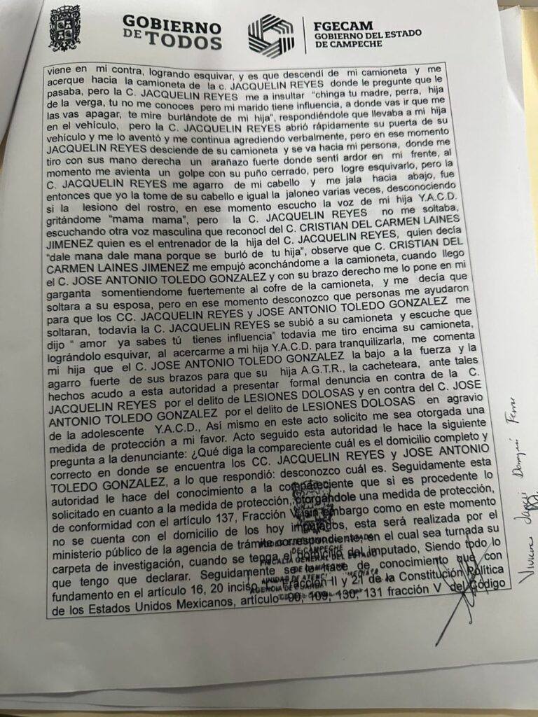 Denuncia al 9933989844… 🚩⚠️🚔‼️¡Demandan a TOLEDO/Secc 47 STPRM por lesiones dolosas!; una denuncia formal por el delito de lesiones dolosas fue presentada ante la Fiscalía General del Estado de Campeche @fgecam a partir de hechos ocurridos la noche del 11 de enero de 2026 en Ciudad del Carmen, en los que una mujer y su hija adolescente resultaron presuntamente agredidas por una pareja identificada como Jacquelin Reyes y José Antonio Toledo González, secretario general de la Sección 47 STPRM, títere del cacique Víctor Hernández Colunga, caso asentado en el acta de denuncia número AC-3-2026-131. La denunciante y presunta víctima es Viviana Janeli Domínguez Ferrer, de 48 años de edad, originaria de Campeche, quien relató ante el Ministerio Público una secuencia de hechos que se habrían desencadenado tras un conflicto vinculado con una justa deportiva. De acuerdo con su narración, el incidente comenzó cuando descendió de su camioneta y se aproximó al vehículo conducido por Jacquelin Reyes para preguntarle qué ocurría. En ese momento, la ahora señalada habría iniciado una serie de agresiones verbales con insultos directos y alusiones a supuestas influencias de su esposo, además de acusarla de haberse burlado de su hija. La situación escaló rápidamente cuando Jacquelin Reyes abrió de forma intempestiva la puerta de su vehículo y la lanzó contra la denunciante, continuando con agresiones verbales y físicas. Viviana Domínguez refirió haber recibido un arañazo en la frente que le provocó ardor, así como un intento de golpe con el puño cerrado que logró esquivar. Posteriormente, la agresora la habría sujetado del cabello y jalado con fuerza, lo que derivó en un forcejeo entre ambas, durante el cual la denunciante reconoce haber respondido de la misma manera sin poder precisar el origen de lesiones en el rostro de la otra persona. En medio del altercado, la víctima escuchó los gritos de su hija adolescente, identificada con las iniciales Y.A.C.D., quien pedía ayuda. También señaló la intervención verbal de un hombre identificado como Cristian del Carmen Laínez Jiménez, entrenador de la hija de Jacquelin Reyes, quien presuntamente incitaba a continuar la agresión. La agresión se habría intensificado con la llegada de José Antonio Toledo González, quien de acuerdo con la denuncia sujetó a Viviana Domínguez por el cuello con el brazo derecho y la presionó con fuerza contra el cofre del vehículo, exigiéndole que soltara a su esposa. La víctima afirmó que fue auxiliada por personas cuya identidad desconoce, quienes lograron que Jacquelin Reyes y José Antonio Toledo González se separaran de ella. No obstante, antes de retirarse, Jacquelin Reyes habría reiterado expresiones relacionadas con la supuesta influencia de su esposo y posteriormente intentó atropellarla con su camioneta, maniobra que la denunciante logró esquivar. Tras el enfrentamiento, Viviana Domínguez se acercó a su hija para tranquilizarla, momento en el cual la adolescente le relató que José Antonio Toledo González la habría bajado por la fuerza del vehículo y la sujetó con fuerza de los brazos, permitiendo que su propia hija, identificada con las iniciales A.G.T.R., le propinara una cachetada. Estos hechos motivaron que la denuncia no solo se presentara por las lesiones sufridas por la madre, sino también por las lesiones dolosas cometidas en agravio de la menor. En el acta levantada por la Fiscalía de Campeche, Viviana Janeli Domínguez Ferrer solicitó de manera expresa la imposición de una medida de protección a su favor, petición que fue considerada procedente por la autoridad ministerial con fundamento en el artículo 137, fracción V, del Código Nacional de Procedimientos Penales; sin embargo, se dejó constancia de que, al no contar con el domicilio de Jacquelin Reyes ni de José Antonio Toledo González, la ejecución de dicha medida quedará a cargo del Ministerio Público de la agencia de trámite a la que sea turnada la carpeta de investigación correspondiente. El caso adquirió relevancia pública luego de que se contextualizara a uno de los señalados: José Antonio Toledo González, como se dató aquí, los hechos habrían ocurrido tras una competencia deportiva en la que el equipo vinculado a su familia resultó perdedor, lo que habría detonado el conflicto; atención @Claudiashein @MarcelaVilleg15 @CNE_Mex @SENER_mx @GobiernoMX @FGRmexico @LuzElena_GE @ASF_Mexico @SCJN @STPS_mx @Tu_IMSS @SEMARNAT_mx @agencia_asea @CENAGAS_mx @IMPetroleo @SATMX @Hacienda_Mexico @BuenGobierno_mx @Centrofcrl #OIC #UIF #OmarReyesColmenares …Zas!!!