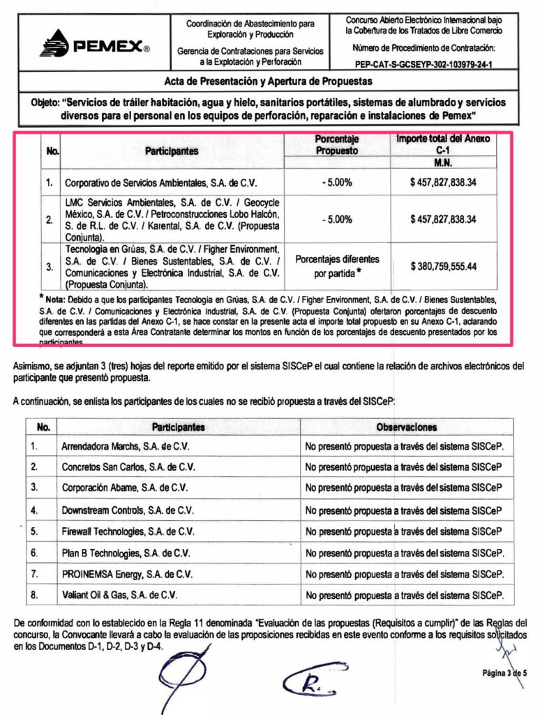 Denuncia al 9933989844… 🚩⚠️ ¡Descarado favoritismo para CORSA-LMC en servicios generales al personal de Perforación!; una de las mafias que tendría que ser investigada por la nueva administración de @Pemex y que inexplicablemente El Agrónomo no vio en 6 años -aquí datada- es la que conforman las empresas Corporativo de Servicios Ambientales (CORSA) de Alfredo Betancourt y África Zavala (mismo apellido de Eduardo Zavala Nácer, ex subdirector de SASIPA, ahora SSSTPA, en la era panista de @Pemex que resultó pariente de la ex primera dama Margarita Zavala en el sexenio de Felipe Calderón) y LMC Servicios Ambientales de Pedro Díaz Acosta, Raúl Ismael Morales Soto y Pedro Cassou Ruiz, empresas que desde el año 2006, hace unos 20 años cuando curiosamente FCH inició su mandato, tienen el monopolio de la recolección de residuos peligrosos en instalaciones terrestres y marinas de @Pemex , y en los contratos que actualmente se licitan para servicios de tráiler habitación, agua y hielo, sanitarios portátiles, sistemas de alumbrado y servicios diversos para el personal en los equipos de perforación y reparación e instalaciones de @Pemex ; dupla de empresas que a través del tiempo de la mano del área de contratos y del área usuaria han manipulado las bases para participar, imponiendo más candados para que ninguna empresa pueda competirles, lo que en esta ocasión no es la excepción, ya que de acuerdo con los antecedentes históricos en dichas licitaciones “solamente CORSA y LMC han cumplido técnicamente”; actualmente en relación con el Concurso Abierto Internacional conforme al TLC Número PEP-CAT-S-GCSEYP (Mario Valle Paz) 302-103979-24-1, en manos de la ex gerente y actual coordinadora de Abastecimiento para Exploración y Producción (CAEP) Lucy Lozano Rodríguez, para servicios de tráiler habitación, agua y hielo, sanitarios portátiles, sistemas de alumbrado y servicios diversos para el personal en los equipos de perforación y reparación e instalaciones de @Pemex de acuerdo al Acta de Apertura de Propuestas Económicas quedaron 3 propuestas finalistas: 1.- Corporativo de Servicios Ambientales (CORSA) por $457,827,838.34 pesos al -5% de descuento; 2.- LMC Servicios Ambientales/Geocycle México/Petroconstrucciones Lobo Halcón/Karental por $457,827,838.34 pesos al -5% de descuento; y 3.- Tecnología en Grúas/FIGHER Environment/Bienes Sustentables/Comunicaciones y Electrónica Industrial por $380,759,555.44 pesos al -21% en porcentajes diferentes por partida; el asunto es que mañosamente vuelven a presentar los resultados indebidamente para beneficiar a la mafia de CORSA-LMC, ya que las pusieron en primero y segundo lugar cuando resultan ser más caras que la tercera propuesta económica; para colmo las propuestas económicas de CORSA-LMC están empatadas con el mismo monto hasta en centavos revelando el contubernio con el área contratante en perjuicio del presupuesto público de la paraestatal y de la libre competencia; y lo peor es que al homologarse, CORSA-LMC ofrecen un porcentaje menor de descuento del -5% general contra el -21% de porcentaje por partidas de la tercera propuesta que resultó mucho más barata, con una diferencia de poco más de 77 millones de pesos menos, cifra que demuestra la inflado que están las dos primeras propuestas para repartir la cochinita una vez dado el fallo, ofertando el mínimo de descuento con la seguridad de ser favorecidos causando un daño económico a @Pemex y limitando la libre participación de las empresas que se niegan a participar cuando se trata de dicho contrato, ya que es bien sabido por muchos que estos contratos son para CORSA-LMC; lo increíble es que esta inflación en las propuestas de CORSA-LMC les ha permitido subcontratar a las empresas de la tercera propuesta (Tecnología en Grúas/FIGHER Environment/Bienes Sustentables/Comunicaciones y Electrónica Industrial) desde hace aproximadamente 10 años pagándoles hasta un 60% menos de los que CORSA-LMC cobran por partidas a @Pemex y esto quedó en evidencia después de que fue notificada la visita de verificación física con fechas de 27, 28 y 29 de noviembre 2024, cuando se lanzó la lici en donde se revisaron y dieron el visto bueno a los equipos e instalaciones cotejando con números de serie de la tercera propuesta, mismos que han sido utilizados en el pasado por CORSA-LMC, mientras que en las visitas a CORSA-LMC solo fueron revisados unos cuantos equipos y de manera superficial, no todos; atención @Claudiashein @MarcelaVilleg15 @SENER_mx @FGRmexico @LuzElena_GE @CNH_MX @ASF_Mexico @PabloGomez1968 @STPS_mx @Tu_IMSS @SEMARNAT_mx @agencia_asea @CENAGAS_mx @CRE_Mexico @IMPetroleo @SFP_mx @SATMX @Hacienda_Mexico #RaquelBuenrostro #OIC #UIF….Zas!!!
