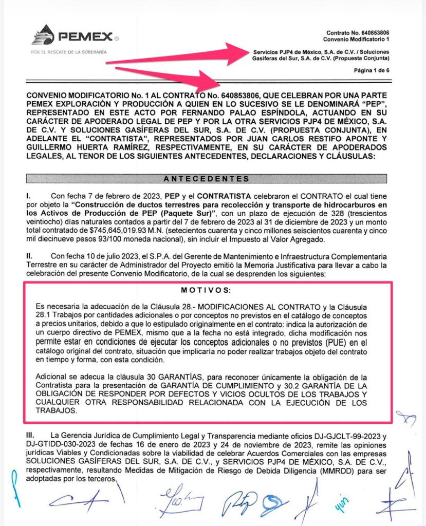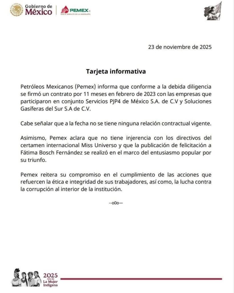 Denuncia al 9933989844… 🚩⚠️‼️¡Dio Pemex 2 contratos a RAÚL ROCHA CANTÚ por 1.9 MMDP; ninguno vigente en Miss Universo 2025!; @Pemex , a cargo de Víctor Rodríguez Padilla, informó vía boletín que conforme a la Debida Diligencia se firmó un contrato por 11 meses en febrero de 2023 con las empresas que participaron en conjunto Servicios PJP4 de México/Soluciones Gasíferas del Sur, señalando que a la fecha no se tiene ninguna relación contractual vigente; asimismo, “ @Pemex aclara que no tiene injerencia con los directivos del certamen internacional Miss Universo y que la publicación de felicitación a Fátima Bosch Fernández se realizó en el marco del entusiasmo popular por su triunfo”; sin embargo; la información-aclaración de @Pemex es imprecisa ya que en realidad la paraestatal no dio 1 sino 2 contratos a Soluciones Gasíferas del Sur del también mexicano Raúl Rocha Cantú, presidente de Miss Universo 2025, por un monto total de 1,941,391,724.90 pesos, ambos ejecutados en propuesta conjunta con Servicios PJP4 de México para construcción de ductos terrestres a principios de 2023 y entregados casi en simultáneo, y -además- un convenio modificatorio el 10 de julio de 2023 en el Contrato 640853806 para meterle -indebidamente- las manos a la Cláusula 28.- Modificaciones al Contrato y Cláusula 28.1.- Trabajos por cantidades adicionales o por conceptos no previstos en el catálogo de conceptos a precios unitarios; los contratos dados son: 1.- Contrato 640853806 derivado de la licitación PEP-CAT-O-GCSEYP (Lucy Lozano Rodríguez) 085-94390-22-2 para realizar la construcción de ductos terrestres para recolección y transporte de hidrocarburos en los Activos de Producción (Paquete Sur) de @Pemex Exploración y Producción (PEP) de Ángel Cid Munguía asignado a Soluciones Gasíferas del Sur/Servicios PJP4 de México por 745,645,019.9 pesos y estuvo vigente del 7 de febrero al 31 de diciembre de 2023; y 2.- Contrato 640853801 por un monto de 1,195,746,705 pesos para realizar también la construcción de ductos terrestres para recolección, transporte y manejo de hidrocarburos y agua congénita en los diferentes Activos de Producción de PEP de Ángel Cid Munguía a un plazo del 8 de febrero de 2023 al 31 de diciembre de 2024; cabe mencionar que ninguno de los 2 contratos estaba vigente cuando se realizó el Miss Universo 2025 este pasado viernes 21 de noviembre en Tailandia donde ganó la tabasqueña Fátima Bosch Fernández; asimismo, es de destacar que ambos contratos fueron dados y terminaron durante la desastrosa administración del Agrónomo en @Pemex en el sexenio de AMLO, cuando el papá de Fátima, Bernardo Bosch Hernández era asesor de la Dirección de PEP; asimismo, el contexto del nombramiento de Bernardo Bosch Hernández como subdirector de Seguridad, Salud, Gestión Ambiental, Energética y Confiabilidad (SSSGAEC) en @Pemex el 30 de octubre 2025 -22 días antes de que su hija Fátima ganará el Miss Universo 2025- se dio en el contexto de los cambios que realiza el también tabasqueño Hugo Vadillo Zurita, recién nombrado el pasado 3 de septiembre como director de Planeación, Coordinación, Desempeño y Sostenibilidad (DPCDS) que define el plan de negocios, las metas y acciones clave de la paraestatal, mismos que no son bien vistos por los trabajadores ya que despidió a los subdirectores en un guillotinazo de más de 100 personas que no se alinearon, indicando que seguía instrucciones del DG Víctor Rodríguez Padilla, ya en el presente sexenio de la presidenta Claudia Sheinbaum; por ende removió al subdirector en funciones en octubre, Eduardo Melo Flores, con más de 30 años en la petrolera, quien empezó en las refinerías, para colocar al tabasqueño Bernardo Bosch Hernández; plan similar que Hugo Vadillo Zurita ejecutó en la Unidad de Control Interno Institucional (UCII), puesto anterior, donde organizó despidos masivos de personal con experiencia técnica, para colocar a modo a su equipo sin experiencia; en este equipo al que pertenece Bernardo Bosch Hernández están Efrén Chávez, Fernanda García Villalobos, José Luis Ortiz, entre otros varios, que ya ocupan puestos estratégicos en la DPCDS; ahora sobre la empresa que acompañó a Soluciones Gasíferas del Sur de Raúl Rocha Cantú, presidente de Miss Universo 2025, en ambos contratos: Servicios PJP4 de México con sede en Reynosa, Tamaulipas, es de José Alberto Layrisse Ramírez y Tenedora PJP4 de México derivado de una fusión en donde fungieron como delegados especiales en la asamblea Luis Fernando Cantú (mismo apellido que Raúl Rocha Cantú) Hernández, Vladimir Igor Correa Muzziotti y Juan Carlos Restifo Aponte, estos dos últimos quienes admiten ser venezolanos y en el caso de Restifo ser gerente general; además de los 2 contratos con Soluciones Gasíferas del Sur, Servicios PJP4 de México tiene 2 contratos adicionales en @Pemex : 1.- Contrato 640854806 (vigente) para rehabilitación y/o sustitución de líneas de descarga y de inyección de agua congénita con tubería no metálica para los Activos de Producción en la Subdirección de Producción Región Norte (SPRN ahora SERN) de Faustino Fuentes Nucamendi por 530,513,930.4 pesos con plazo del 13 de febrero de 2024 al 6 mayo de 2026, y 2.- Contrato 644018824 para servicio integral para la recolección separación y tratamiento de gas amargo en las instalaciones del Activo Integral de Producción Bloques Norte 01 (SPRN ahora SERN) por 82,115,544 pesos con plazo del 18 de diciembre de 2018 al 26 de mayo de 2022, por lo que Servicios PJP4 de México suma con los 4 contratos (2 con Soluciones Gasíferas del Sur) un total de 2,554,021,199.30 pesos, siendo contratos sin Gasíferas: 612,629,474.4 pesos y contratos con Gasíferas: 1,941,391,724.90 pesos; misma empresa PJP4 que ha sido señalada por financiar, junto con Odebrecht, la campaña del ex presidente EPN en 2012 y que fue socia de la empresa Barcasa, que 