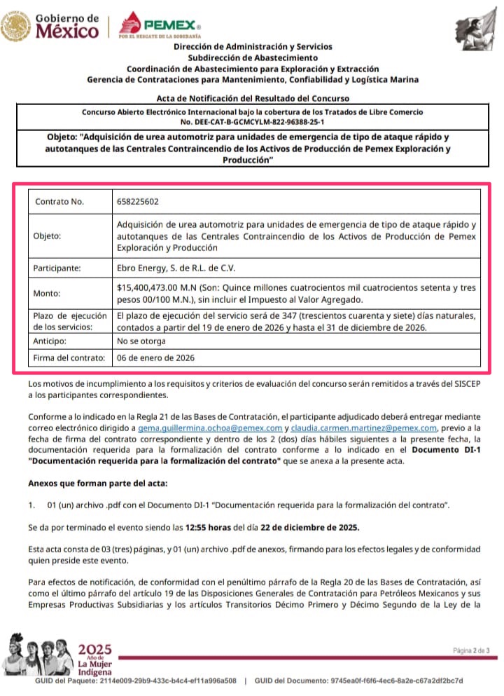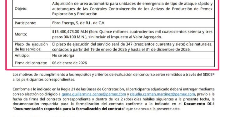 Denuncia al 9933989844… 🚩⚠️ ¡EBRO ENERGY, urea por 15.4 MDP para Centrales Contra Incendio Pemex!; tras recibir el fallo de la licitación DEE-CAT-B-GCMCYLM (María Isabel Segovia Magaña) 822-96388-25-1, Ebro Energy ejecutará para @Pemex el contrato 658225602 para la adquisición de urea automotriz para unidades de emergencia de tipo de ataque rápido y autotanques de las Centrales Contra Incendio de los Activos de Producción de @Pemex Exploración y Producción (PEP ahora DEE), vigente del 19 de enero de 2026 al 31 de diciembre de 2026, por un monto de 15,400,473 pesos. El acta de fallo estuvo avalada por los funcionarios de @Pemex , Gema Guillermina Ochoa Ramos, coordinador especialista “B” SALM, GCMCLM, CAEE, SA, DAS; y Claudia del Carmen Martínez Ramos, coordinador especialista “D”, SALM, GCMCLM, CAEE, SA, DAS. Sin embargo, aunque en el Acta de Apertura de Propuestas quedó el registro de que sí se recibieron las ofertas de las empresas participantes: 1.- Firewall Technologies/Ingeniería Belherr, 2.- High Performance Drilling Services, 3.- Mantenimientos y Suministros Integrales RODSUA, 4.- Mexicana de Lubricantes y 5.- Z Technologies Industrial Automation, @Pemex ocultó deliberadamente los montos económicos de cada una; atención @Claudiashein @MarcelaVilleg15 @CNE_Mex @SENER_mx @GobiernoMX @FGRmexico @LuzElena_GE @ASF_Mexico  @SCJN @STPS_mx @Tu_IMSS @SEMARNAT_mx @agencia_asea @CENAGAS_mx @IMPetroleo @SATMX @Hacienda_Mexico @BuenGobierno_mx @Centrofcrl #OIC #UIF #OmarReyesColmenares …Zas!!!
