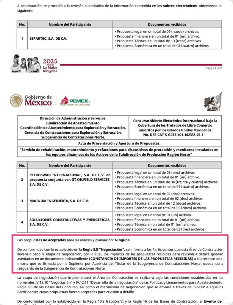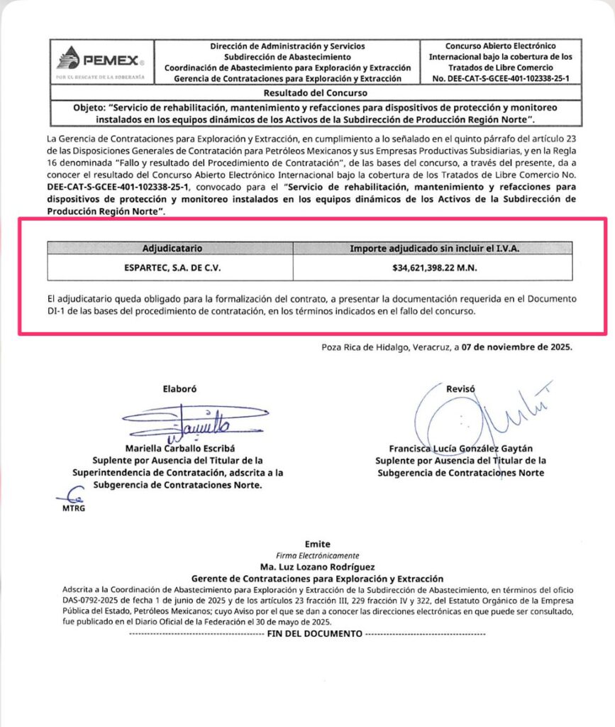Denuncia al 9933989844… 🚩⚠️ ¡ESPARTEC se ensancha con FAUSTINO/SERN por 34.6 MDP para mantto a equipos dinámicos!; de la licitación DEE-CAT-S-GCEE (Lucy Lozano Rodríguez) 401-102338-25-1 adjudican a Espartec -representada en varios contratos por Norberto de Jesús Torres García y Gabriel López Hernández- este 7 de noviembre por un monto de 34,621,328.22 pesos, esto luego que participó en un concurso amañado donde @Pemex ocultó información sobre las propuestas económicas, avalado por Mariella Carballo Escribá, SPA del Titular de la Superintendencia de Contratación, adscrita a la Subgerencia de Contrataciones Norte; Francisca Lucía González Gaytán, SPA del Titular de la Subgerencia de Contrataciones Norte; y Lucy Lozano Rodríguez, gerente de Contrataciones para Exploración y Extracción (GCEE); conforme a las bases de este concurso, Espartec, con sede en San Luis Potosí, deberá cumplir con el servicio de rehabilitación, mantenimiento y refacciones para dispositivos de protección y monitoreo instalados en los equipos dinámicos de los Activos de la Subdirección de Producción Región Norte (SPRN ahora SERN) de Faustino Fuentes Nucamendi hasta el 31 de diciembre de 2028; en este concurso, participaron Petroswab Internacional, de la mafia de Carlos Eugenio Lugo, Enrique Alberto Beltrán Montiel y su esposa Mariana Guadalupe Fonseca Basurto, en propuesta conjunta con GT Oilfield Services; también Magnum Ingeniería, y Soluciones Constructivas y Energéticas; sin embargo, @Pemex no mostró los montos económicos -como ha hecho desde septiembre 2025- bajo la excusa de la “Regla 8.5 Negociación” (que contraviene la Constitución y la Ley General de Transparencia) de los lineamientos de contratación de @Pemex : “esta Área de Contratación llevará a cabo la etapa de negociación, por lo cual, los importes de las propuestas recibidas para revisión a detalle quedan asentados en un documento independiente (llamado Constancia de Importes de las Propuestas Recibidas) a la presente acta”; este sería el primer contrato de Espartec firmado en el gobierno de Sheinbaum/Padilla con @Pemex , luego que firmó 3 con AMLO/Agrónomo y 3 con EPN/Treviño; ahora con su séptimo contrato con @Pemex , Espartec acumula más de 252,036,592.53 pesos desde 2014: 1.- Contrato 424404816 para rehabilitación a tableros de control, protecciones periféricas, sistemas de detección y supresión de fuego de los equipos de compresión y motobombas del Activo Integral Burgos, estuvo vigente este convenio del 14 de octubre de 2014 al 31 de diciembre de 2016 por un monto de 70,000,000 pesos; 2.- Contrato 644018805 el 8 de febrero de 2018 para servicio integral a actuadores neumáticos/hidráulicos SDV, para instalaciones terrestres y marinas del Activo Integral de Producción Bloque N02 por un monto de 14,122,005 pesos que estuvo vigente hasta el 31 de octubre de 2021; 3.- Contrato 644018603 el 11 de julio de 2018 para adquisición de accesorios y conexiones para tubería de diferentes diámetros, vigente hasta el 7 de octubre de 2022 por un monto de 36,561,917 pesos; 4.- Contrato 5100433172 para suministro de interruptor de vibración marca Murphy, para la planta primaria NO2 vigente del 28 de junio de 2019 al 27 de agosto de 2019 por apenas 160,008 pesos; 5.- Contrato 644013801, luego de hacer méritos para la nueva élite de poder en @Pemex en el pasado sexenio, para servicio de mantenimiento a equipo dinámico y sistemas auxiliares en instalaciones de la Subdirección de Producción Región Norte (SPRN ahora SERN) de Faustino Fuentes Nucamendi el 26 de enero de 2023 a un plazo hasta el 31 de diciembre de 2024 por 85,970,997.18 pesos; y 6.- Contrato 645013868 el 6 de octubre de 2023 para servicio de mantenimiento preventivo y correctivo al sistema de control marca Murphy de los motocompresores, motobombas y turbobombas instalados en los Activos de la Subdirección de Producción Región Sur (SPRS ahora SERS) de Marcos Torres Fuentes, vigente hasta el 31 de diciembre de 2024 por un monto de 10,600,337.13 pesos; atención @Claudiashein @MarcelaVilleg15 @CNE_Mex @SENER_mx @GobiernoMX @FGRmexico @LuzElena_GE @ASF_Mexico @SCJN @STPS_mx @Tu_IMSS @SEMARNAT_mx @agencia_asea @CENAGAS_mx @IMPetroleo @SATMX @Hacienda_Mexico @BuenGobierno_mx @Centrofcrl #OIC #UIF #OmarReyesColmenares …Zas!!!