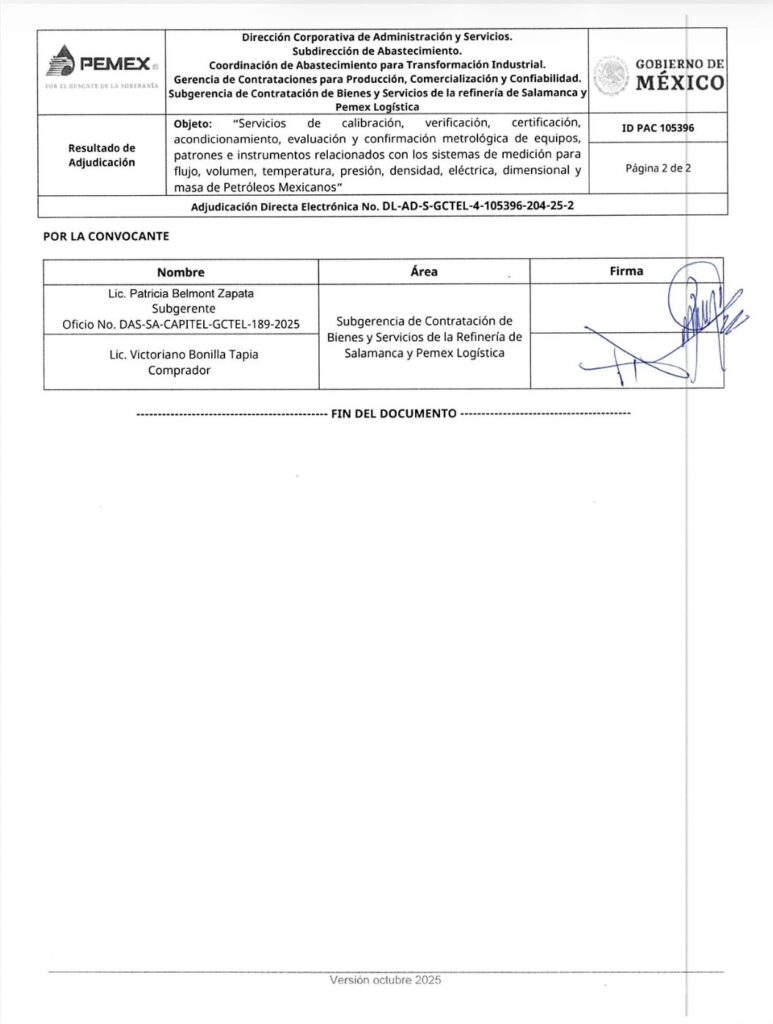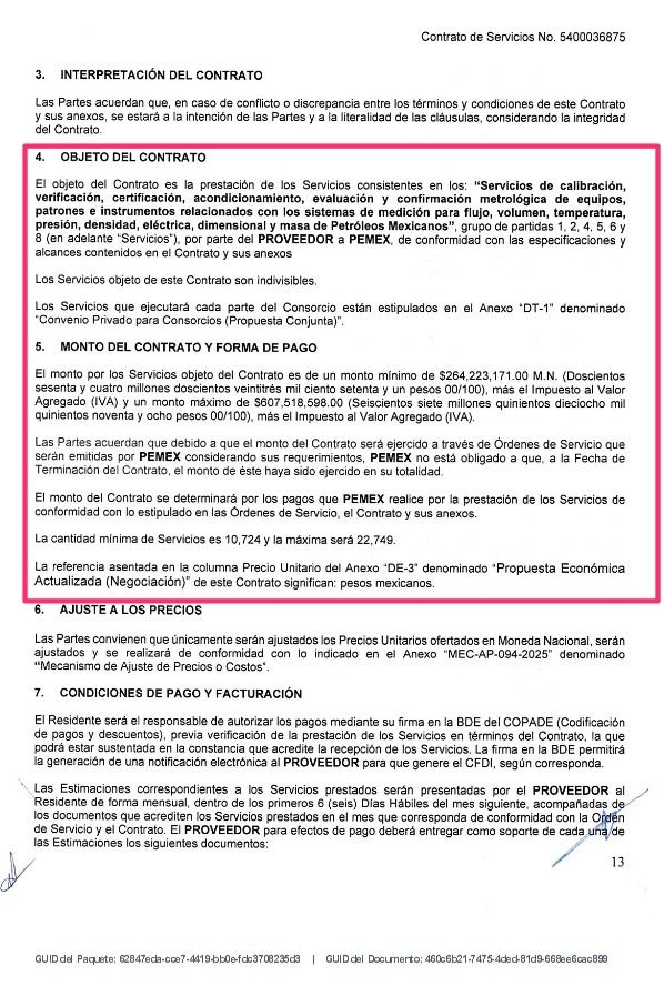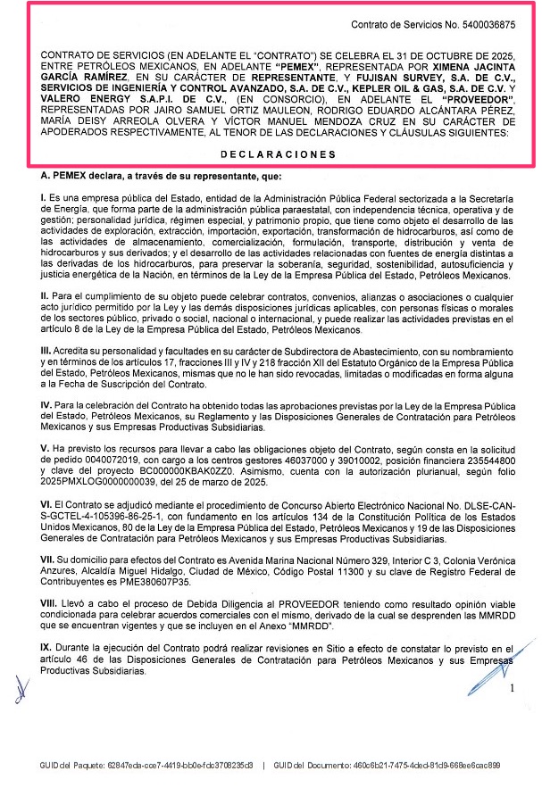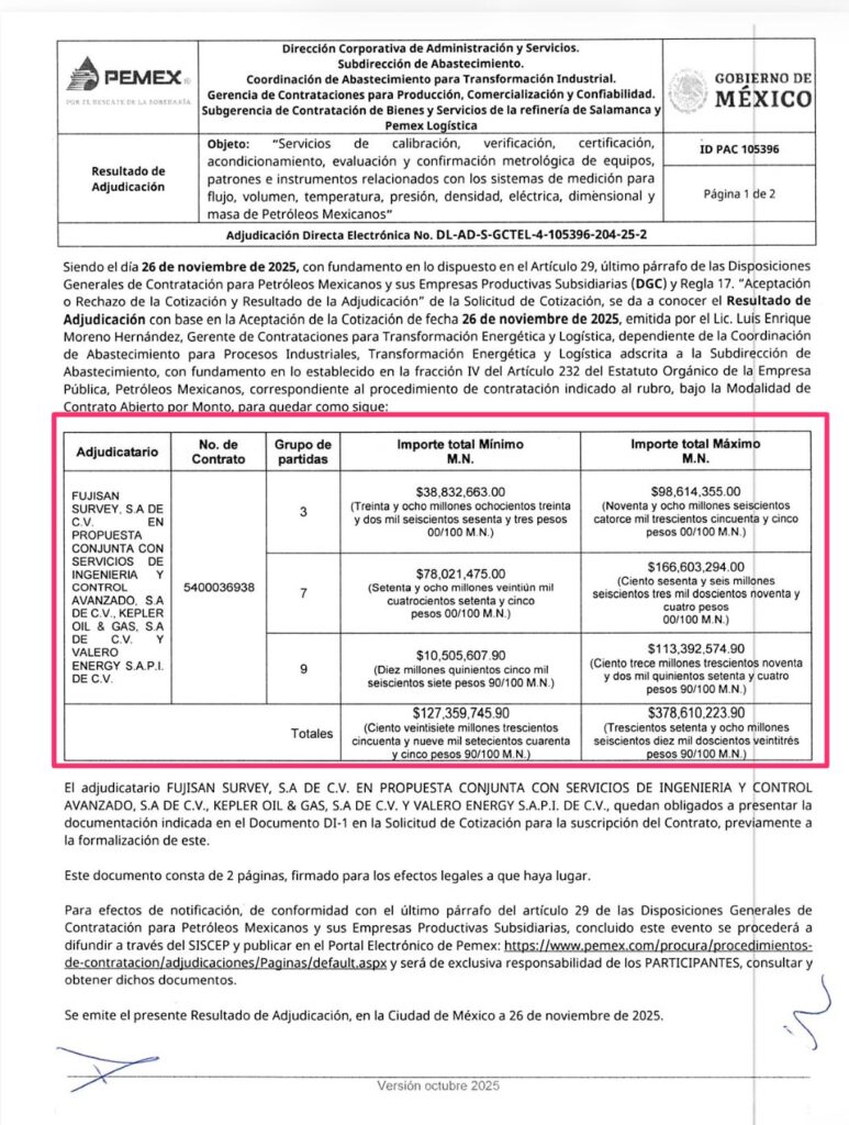 Denuncia al 9933989844… 🚩⚠️💸‼️¡FUJISAN SURVEY, clonan por dedazo 2 contratos por 986 MDP para confirmación metrológica en Pemex!; mediante la Asignación Directa número 5400036938, @Pemex entregó un contrato por 378,610,223.90 pesos a Fujisan Survey, una de las favoritas de la 4T constituida en Coatzacoalcos, Veracruz, por José Carmen Pérez Flores y Guadalupe del Carmen Puerto Betancourt; con este convenio la firma deberá realizar servicios de calibración, verificación, certificación, acondicionamiento, evaluación y confirmación metrológica de equipos, patrones e instrumentos relacionados con los sistemas de medición para flujo, volumen, temperatura, presión, densidad, eléctrica, dimensional y masa de Pemex; el dedazo para Fujisan Survey fue avalado por Patricia Belmont Zapata y Victoriano Bonilla Tapia, de la Subgerencia de Contratación de Bienes y Servicios de la Refinería de Salamanca y @Pemex Logística (PLOG ahora PLSE); conforme al acta de fallo la empresa de José Pérez y Guadalupe Puerto, fue escogida en propuesta conjunta con Servicios de Ingeniería y Control Avanzado, dirigida por Juan Carlos Luna Cervantes; Kepler Oil & Gas, de Luis Eduardo Chavarría Meza; y Valero Energy SAPI, a nombre de Santiago Subiria Vázquez Senties, al parecer emparentado con Luis y Óscar Vázquez Senties de Diavaz, contrato en donde es importante destacar que no se describe la duración o plazo del mismo; con este, Fujisan Survey suma 21 contratos firmados con @Pemex desde 2018 (19 con AMLO/Agrónomo y 2 Sheinbaum/Padilla) por un monto total de 3,477,154,207.35 pesos: lo absurdo es que la reciente Asignación Directa número 5400036938 es igual al 1.- Contrato número 5400036875 para servicios de calibración, verificación, certificación, acondicionamiento, evaluación y confirmación metrológica de equipos, patrones e instrumentos relacionados con los sistemas de medición para flujo, volumen, temperatura, presión, densidad, eléctrica, dimensional y masa de @Pemex , ¡¡¡vigente del 31 de octubre de 2025 al 30 de noviembre de 2029, dado por un monto -mayor- de 607,518,598 pesos!!!, por lo que se estarían duplicando -indebidamente- los servicios para la misma empresa solo variando el monto y plazo; además, le han dado a Fujisan Survey: 2.- Contrato 645014806 para servicio integral de medición y monitoreo de la producción de hidrocarburos en los Activos de Producción de la Subdirección de Producción Región Sur vigente desde el 25 de junio de 2024 al 31 de diciembre de 2025 por 512,304,232.3 pesos; 3.- Contrato 648814805 para rehabilitación, calibración y diagnóstico de los sistemas de medición de gas a quemador y gas de proceso, incluye suministro e instalación de refacciones y servicios especializados para la confiabilidad en la medición de los Centros de Proceso de la Subdirección de Producción Región Marina Noreste a un plazo del 6 de junio de 2024 al 30 de junio de 2025 por un monto de 552,568,265.7 pesos; 4.- Contrato 648813854 para servicio de muestreo para la caracterización del sm-900 a / b, por un laboratorio certificado para el Activo de Producción Litoral de Tabasco, de la Subdirección de Producción Región Marina Suroeste que estuvo vigente del 23 de noviembre de 2023 al 30 de junio de 2025 por 13,119,198.99 pesos; 5.- Contrato 648813841 para calibración, certificación y confirmaciones metrológicas a los sistemas de medición de gas y aceite crudo de los centros de proceso marinos e instalaciones terrestres, vigente desde el 2 de junio de 2023 al 30 de junio de 2025 por 569,813,092.3 pesos; 6.- Contrato 645012814 para calibración de los sistemas de medición de aceite, crudo y gas para los Activos de Producción Región Sur vigente desde el 21 de diciembre de 2022 al 31 de diciembre de 2024 por 59,278,200.93 pesos; 7.- Contrato 5400035353 para servicio de mantenimiento, verificación, calibración y certificación a los sistemas de medición por 15,117,434.54 pesos vigente desde el 3 de enero de 2024 al 1 de mayo de 2024; 8.- Contrato 648811802 para rehabilitación, calibración y diagnóstico de los sistemas de medición de gas a quemador y gas de proceso, incluye suministro e instalación de refacciones y servicios especializados para la confiabilidad en la medición de los Centros de Proceso, vigente desde el 10 de agosto de 2021 al 31 de diciembre de 2023 por un monto de 677,789,639 pesos; 9.- Contrato 5400035177 para re-cubicación de esferas, tanques verticales y certificación de calibración de los sistemas de telemedición de citados recipientes del CPG Burgos, vigente desde el 16 de octubre al 26 de diciembre de 2023 por 1,075,620 pesos; 10.- Contrato 5400035327 para servicio emergente de calibración y acreditación de equipos e instrumentos para los sistemas de medición ubicados en los Complejos Procesadores de Gas, vigente desde el 7 de diciembre de 2023 al 25 de octubre de 2024 por 22,736,799.54 pesos; 11.- Contrato 5400033301 para calibración de carro tanques vigente del 7 de abril al 30 de noviembre de 2022 por 16,463,325 pesos; 12.- Contrato 645019837 para calibración de los sistemas de medición de aceite, crudo y gas para los Activos Integrales de Producción de la Subdirección de Producción Bloque Sur, vigente desde el 12 de noviembre de 2019 al 31 de marzo de 2022 por 28,722,117 pesos; 13.- Contrato 5400033205 para servicio para la calibración volumétrica de los tanques de almacenamiento vertical y certificación de los sistemas de telemedición de los tanques de transferencia de custodia de bombas no. 4, vigente desde 23 de diciembre de 2021 al 20 de febrero de 2022 por 1,379,579.04 pesos; 14.- Contrato 5400033139 para servicio de calibración y certificación de todos los medidores de flujo de tipo másico, transmisores de presión, transmisores de temperatura y desintómetros para transferencia de custodia, a un plazo del 12 de enero al 30 de diciembre de 2021 por 1,535,122 pesos; 15.- Contr