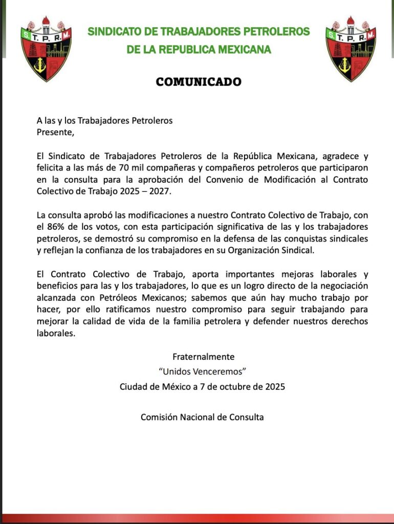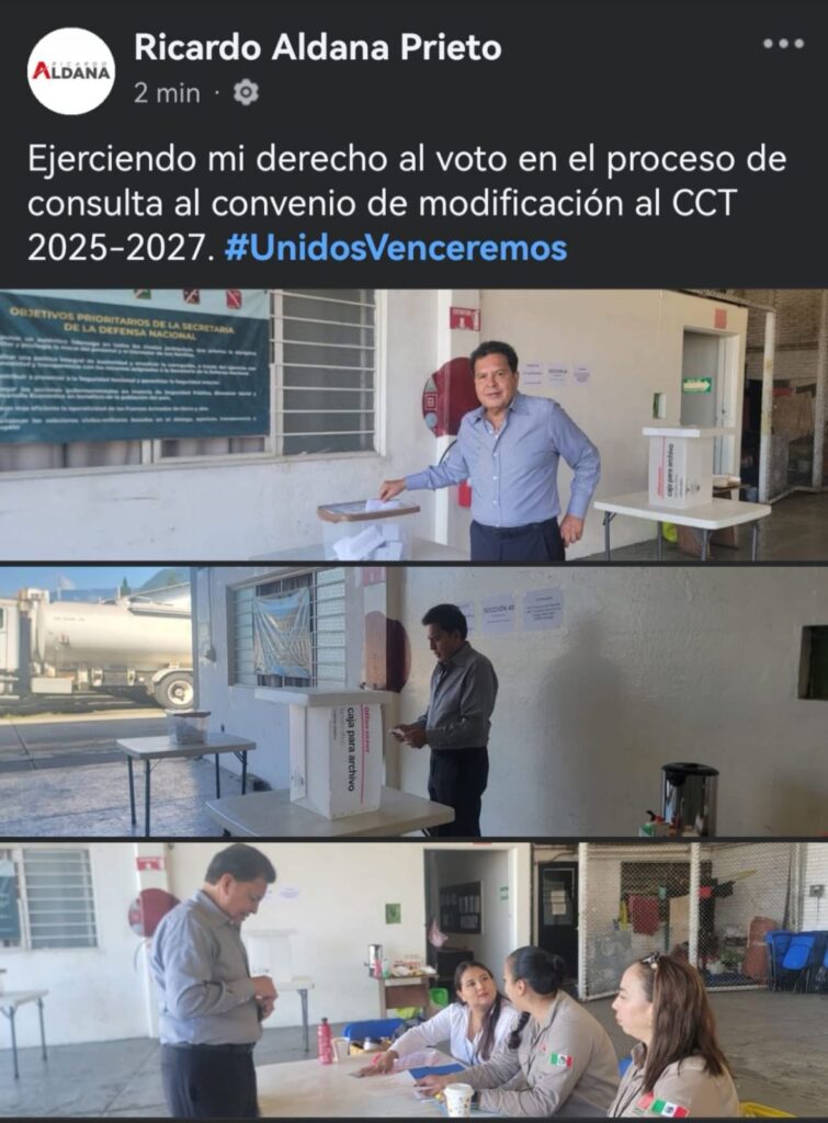 Denuncia al 9933989844… 🚩⚠️‼️👨‍🏭 ¡Gana Coacción en Consulta CCT 2025-2027 STPRM del Delfín ALDANA!; a pesar de los pesares, nuevamente la cúpula del STPRM del Delfín de Deschamps, Ricardo Aldana Prieto, le pasa la aplanadora a la disidencia de este sindicato petrolero en la consulta del sí o no al Contrato Colectivo de Trabajo (CCT) 2025-2027, que fue aprobado con todo y Anexo 16 en perjuicio de los trabajadores este pasado 6 de octubre; con pírricos beneficios para sus agremiados, inclusive menos que otras organizaciones sindicales el aumento al salario quedó por debajo del 5%; los incumplimientos y violaciones al CCTV seguirán y en algunos casos peor como el servicio médico donde preparan una reducción al cuadro de medicamentos de 200 productos, entre estos los oncológicos; sobre la consulta, ni qué decir, plagada de coacción al voto en 35 de las 36 secciones, donde quedó clara la ruptura con Los Chepes (Pilar y Zamudio) de la Sección 44 STPRM que se pronunciaron abiertamente para el voto en contra al CCT propuesto; ejercicio -como de costumbre- en que el Comité Ejecutivo General (CEG) jugó de juez y parte en la consulta de cabo a rabo (como boletas sin número de folio), con el aval y complicidad de las autoridades laborales, dando como resultado oficial un total de 70,710 votos emitidos de un universo de 89,822 trabajadores con derecho a votar; de los que 60,989 trabajadores votaron que sí al nuevo CCT y solo 9,024 en contra (a eso quedó reducida la disidencia sindical tras el triunfo del Delfín, a quien por cierto le recriminaron su voto ya que es régimen de confianza Pemex con nivel ), con 70,013 votos efectivos (89%) y 697 votos nulos; y -por último- 19,112 boletas sobrantes (un buen de desánimo entre los agremiados) que no hubieran hecho la diferencia; queda como anécdota el jueves pasado -previo a la consulta- en la refinería Miguel Hidalgo de Tula de Allende, Hgo, el reclamo a Rigoberto Ramírez Sánchez, cacique secretario general de la Sección 35 STPRM, de trabajadores del Departamento de Pailería-Soldadura, de los Departamentos de Mantenimiento de Talleres Generales, cuando llegaron funcionarios sindicales a buscar las firmas para la asamblea-consulta del lunes pasado, cuando le cuestionaron la revisión y jubilación digna, además que si a su hijo y familiares los metió al Gobierno de Atitalaquia como regidor de @PartidoMorenaMx al igual que a su sobrina en el Gobierno de Tula igual por Morena; atención @Claudiashein @MarcelaVilleg15 @SENER_mx @FGRmexico @LuzElena_GE @ASF_Mexico @PabloGomez1968 @SCJN @STPS_mx @Tu_IMSS @SEMARNAT_mx @agencia_asea @CENAGAS_mx @IMPetroleo @SATMX @Hacienda_Mexico @BuenGobierno_mx #RaquelBuenrostro #OIC #UIF….Zas!!!