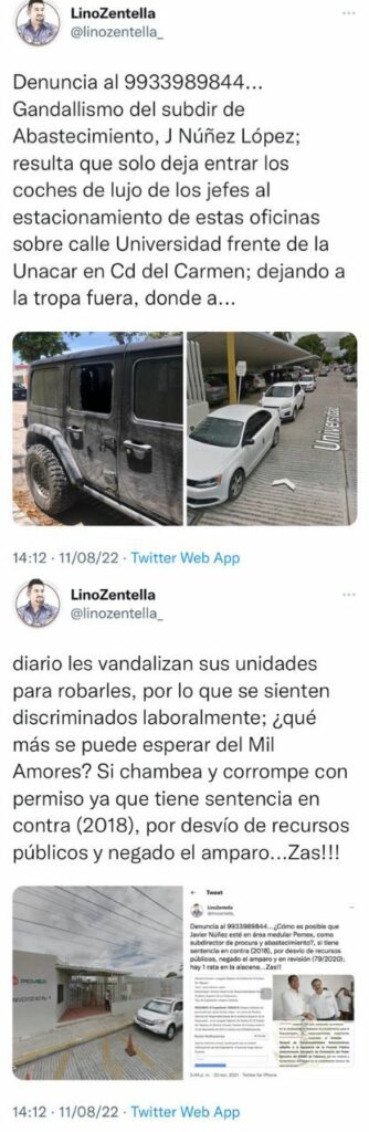 Denuncia al 9933989844… Gandallismo del subdir de Abastecimiento, J Núñez López; resulta que solo deja entrar los coches de lujo de los jefes al estacionamiento de estas oficinas sobre calle Universidad frente de la Unacar en Cd del Carmen; dejando a la tropa fuera, donde a diario les vandalizan sus unidades para robarles, por lo que se sienten discriminados laboralmente; ¿qué más se puede esperar del Mil Amores? Si chambea y corrompe con permiso ya que tiene sentencia en contra (2018), por desvío de recursos públicos y negado el amparo…Zas!!!