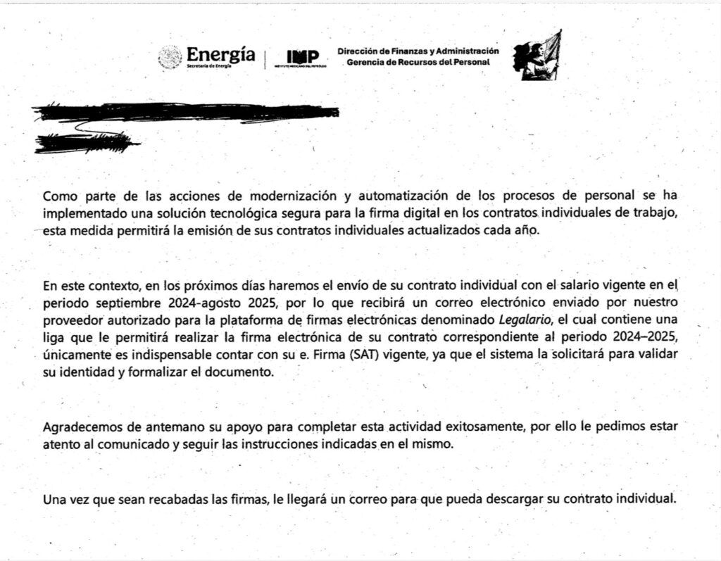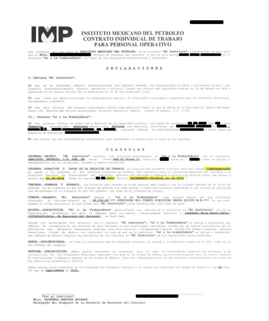 Denuncia al 9933989844… 🚩⚠️ ¡IMP: Promueven contratos individuales con tiempo determinado a sindicalizados! Nerviosismo entre los trabajadores sindicalizados y no sindicalizados del Instituto Mexicano del Petróleo (IMP) de Elizabeth Mar Juárez, quien les pretende jugar chueco al coaccionarlos a firmar contratos individuales por tiempo determinado cada año a partir del miércoles pasado en contubernio con Marco Israel Soto Angulo, secretario general del Sindicato Nacional de Trabajadores del Instituto Mexicano del Petróleo (SNTIMP). Según ellos ponen “tiempo indeterminado con vigencia” como se aprecia en los avisos del “contrato nuevo” con el supuesto de ir “moviendo los salarios”. Para esto enviaron un correo a los interesados en donde se informa que el Contrato Individual de Trabajo deriva del compromiso asumido en la negociación salarial correspondiente al año 2022. En 2023 se solicitó no suscribirlo en atención al criterio emitido por la Secretaría de Hacienda y Crédito Público (SHCP) relativo a la imposición del tope de incremento salarial de 180.00 pesos que se recuperó en el año 2023 y que fue validado en la consulta del mismo año por los trabajadores en presencia del Centro Federal de Conciliación y Registro Laboral. Con motivo de la publicación de la Gerencia de Relaciones Laborales del día 25 del presente mes, se llevó a cabo una reunión de trabajo a nivel nacional, en la cual se acordó de manera bilateral precisar el contenido del contrato individual, particularmente en su cláusula segunda, en los siguientes términos. Vigencia: El contrato deberá establecerse por tiempo indeterminado, conforme a lo previsto en la Ley Federal del Trabajo y en apego a la cláusula 12 del CCT vigente. Actualización salarial: Sus efectos se vinculan a la negociación salarial anual, por lo que podrá actualizarse cada año exclusivamente para reflejar el salario básico vigente conforme al CCT (Anexo I), sin afectar derechos adquiridos. Antigüedad: La fecha de ingreso deberá coincidir con la registrada en el sistema SINAVID del Instituto de Seguridad y Servicios Sociales de los Trabajadores del Estado, garantizando el reconocimiento pleno de la antigüedad. Se precisa que los derechos laborales adquiridos son irrenunciables, por lo que ningún instrumento podrá implicar su menoscabo. Asimismo, la implementación de la firma electrónica (e-firma) tiene como finalidad agilizar el proceso de formalización y entrega anual del contrato individual, brindando mayor certeza y eficiencia administrativa. Correo que finaliza con la leyenda de que “el SNTIMP refrenda su compromiso de velar permanentemente por la defensa y protección de los derechos de todas y todos los trabajadores”, adjuntándose un ejemplo del contrato individual como referencia, signado por Marco Israel Soto Angulo. Sin embargo, todo esto se contradice con el primer correo de Recursos Humanos ya que los contratos actuales son por tiempo indeterminado con vigencia anual. El asunto es que los trabajadores ya no confían ya que temen que los hagan firmar como cuando los hicieron moverse a cuentas individuales en el sexenio de @FelipeCalderon . Atención @Claudiashein @MarcelaVilleg15 @CNE_Mex @SENER_mx @GobiernoMX @FGRmexico @LuzElena_GE @ASF_Mexico  @SCJN @STPS_mx @Tu_IMSS @SEMARNAT_mx @agencia_asea @CENAGAS_mx @IMPetroleo @SATMX @Hacienda_Mexico @BuenGobierno_mx @Centrofcrl #OIC #UIF #OmarReyesColmenares …Zas!!!