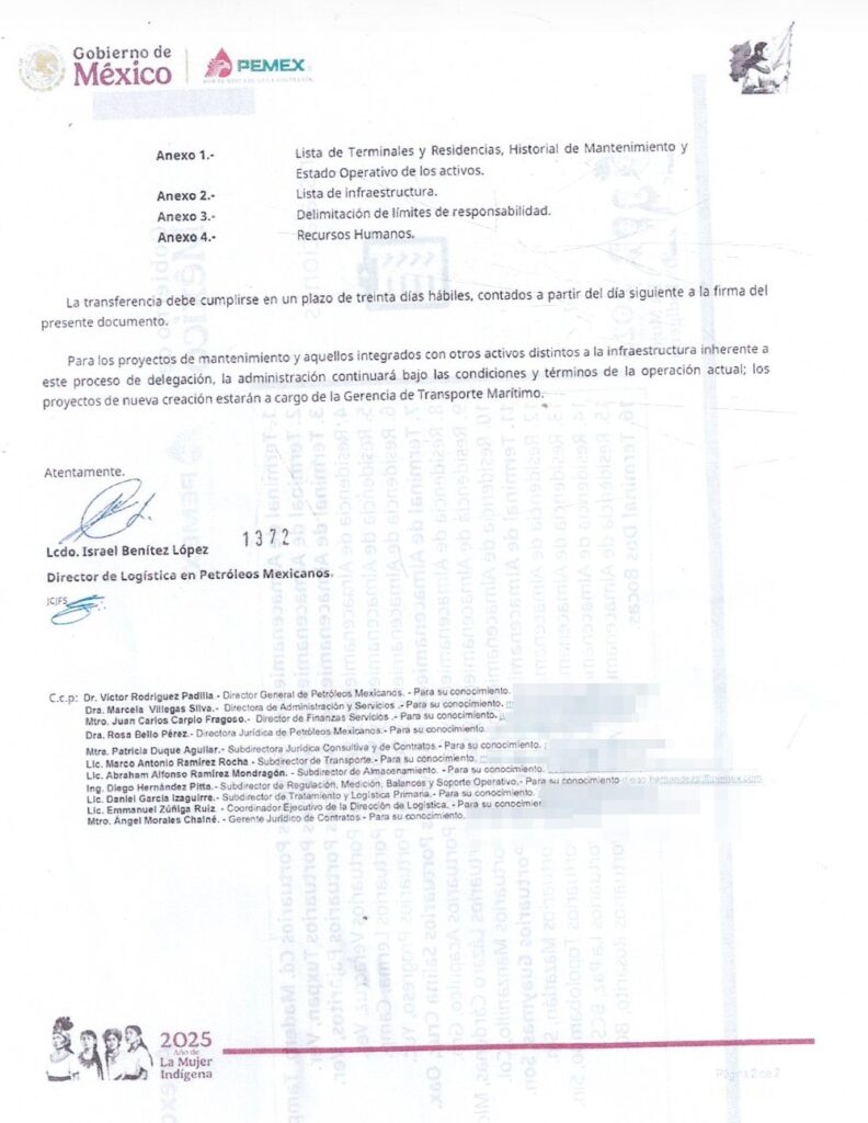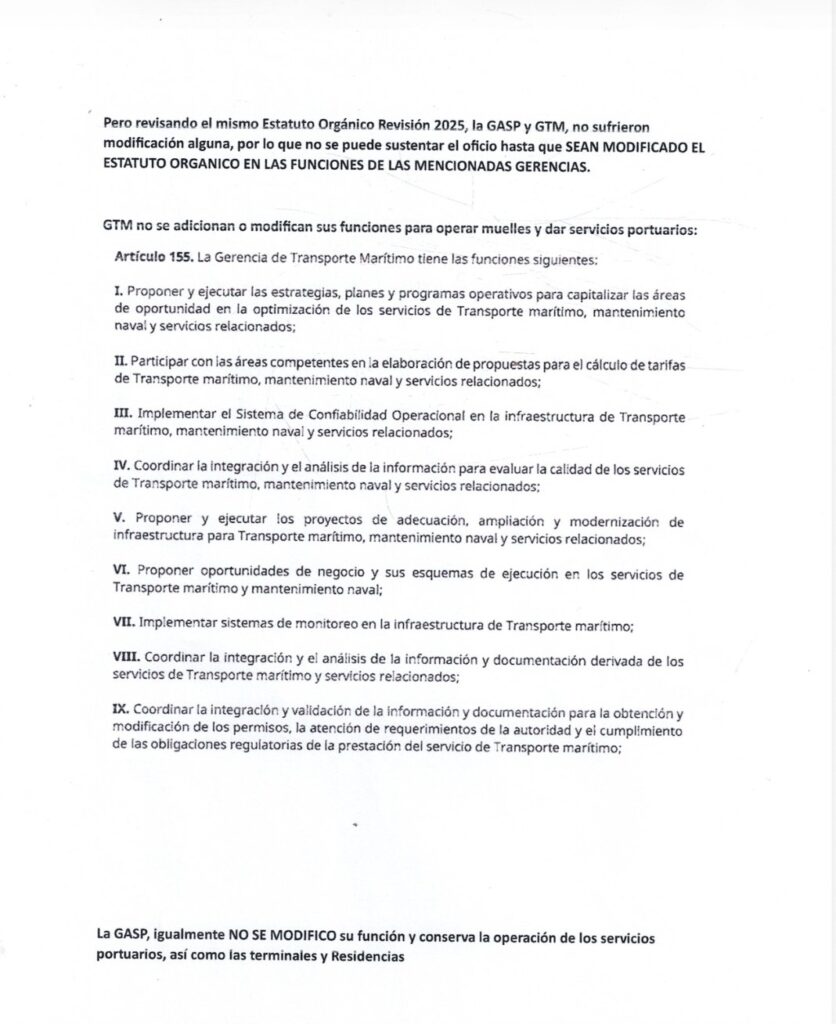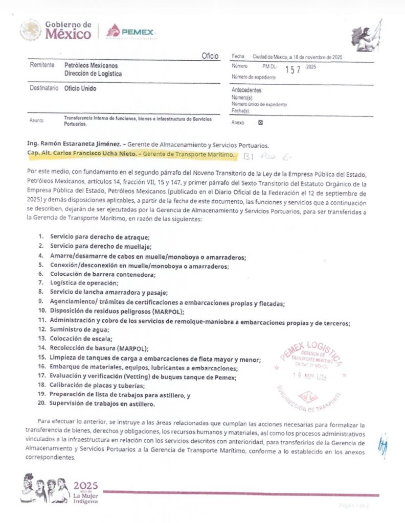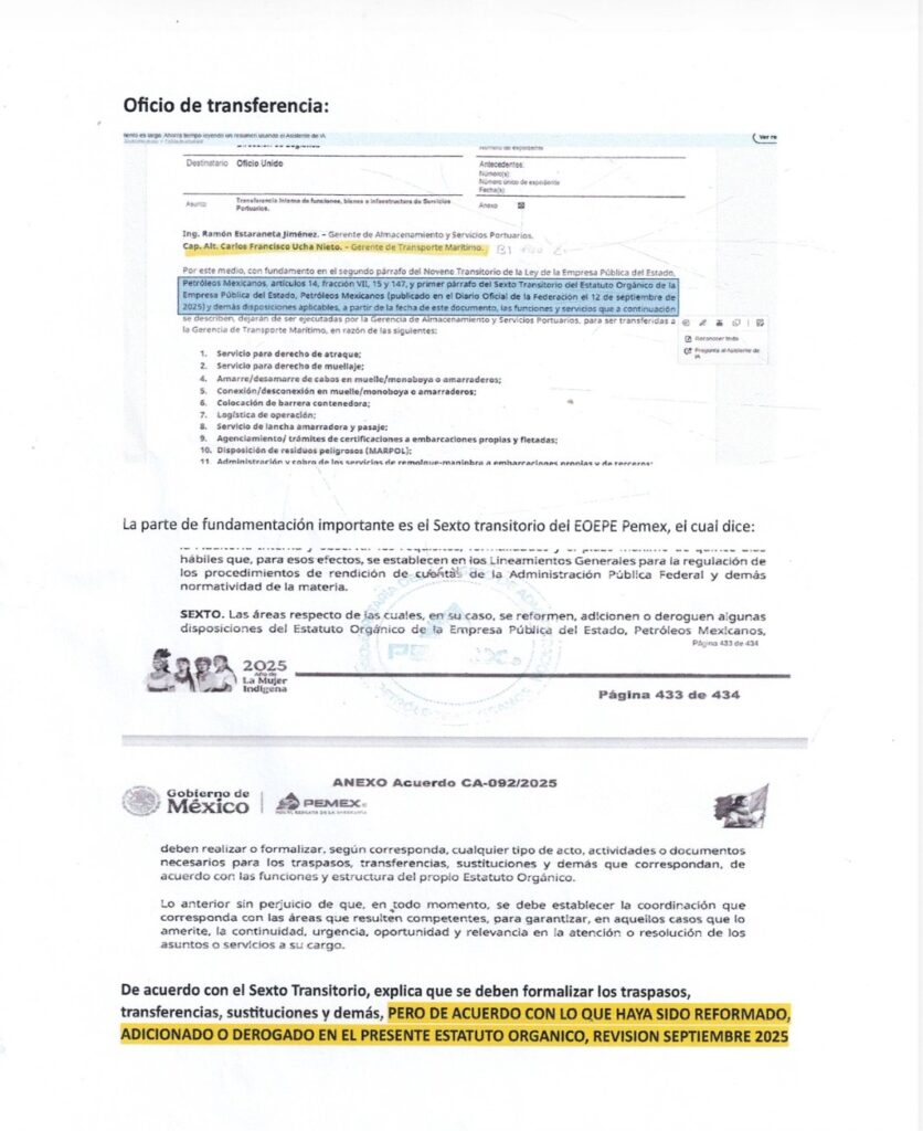 Denuncia al 9933989844… 🚩⚠️⚓️‼️¡Indebida transferencia de servicios entre Gerencias GASP-GTM en Pemex Logística; golpe a trabajadores portuarios!; duro e indebido descontón a los trabajadores en @Pemex ya que mediante el oficio PM-DL-157-2025 del pasado 18 de noviembre del presente año la Dirección de Logística y Salvaguarda Estratégica (DLSE) de Israel Benítez López, mediante el asunto: Transferencia Interna de funciones, bienes e infaestructura de Servicios Portuarios, cambió -por sus tanates- funciones y servicios de la Gerencia de Almacenamiento y Servicios Portuarios (GASP) de Ramón Estaraneta Jiménez para ser transferidos a la Gerencia de Transporte Marítimo (GTM) de Carios Francisco Ucha Nieto; el asunto es que los afectados aseguran se violentaron sus derechos laborales pues para que sea plausible hay que gestionar modificaciones de acuerdo a los estatutos orgánicos que los rigen y “ni el Consejo de Administración de @Pemex (CAPEMEX) está enterado de esta transferencia de funciones, porque se vería reflejado en el Diario Oficial de la Federación (DOF), lo que no ha ocurrido ya que es anómalo, por lo que harán una denuncia ante el Órgano Interno de Control (OIC)”; estos servicios son: 1.- Servicio para derecho de atraque; 2.- Servicio para derecho de muellaje; 3.- Amarre/desamarre de cabos en muelle/monoboya o amarraderos; 4.- Conexión/desconexión en muelle/monoboya o amarraderos; 5.- Colocación de barrera contenedora; 6.- Logística de operación; 7.- Servicio de lancha amarradora y pasaje; 8.- Agenciamiento/ trámites de certificaciones a embarcaciones propias y fletadas; 9.- Disposición de residuos peligrosos (MARPOL); 10.- Administración y cobro de los servicios de remolque-maniobra a embarcaciones propias y de terceros; 11.- Suministro de agua; 12.- Colocación de escala; 13.- Recolección de basura (MARPOL); 14.- Limpieza de tanques de carga a embarcaciones de flota mayor y menor; 15.- Embarque de materiales, equipos, lubricantes a embarcaciones; 16.- Evaluación y verificación (Vetting) de buques tanque de @Pemex ; 17.- Calibración de placas y tuberías; 18.- Preparación de lista de trabajos para astillero, y 19.- Supervisión de trabajos en astillero, para los que se instruye en el oficio citado cumplan las acciones necesarias para formalizar la transferencia de bienes, derechos y obligaciones, los recursos humanos y materiales, así como los procesos administrativos vinculados a la infraestructura en relación con los servicios descritos con anterioridad para transferirlos, acciones que dejan en una situación incierta a los trabajadores de las Terminales y Residencias de Almacenamiento y Servicios Portuarios (TASP y RASP): 1.- TASP Ciudad Madero, Tamaulipas; 2.- TASP Tuxpan, Veracruz; 3.- TASP Pajaritos, Veracruz; 4.- RASP Veracruz, Veracruz; 5.- RASP Lerma, Campeche; 6.- RASP Progreso, Yucatán; 7.- TASP Salina Cruz, Oaxaca; 8.- RASP Acapulco, Guerrero; 9.- RASP Lázaro Cárdenas, Michoacán; 10.- RASP Manzanillo, Colima; 11.- TASP Guaymas, Sonora; 12.- RASP Mazatlán, Sinaloa; 13.- RASP Topolobampo, Sinaloa; 14.- RASP La Paz, Baja California Sur; 15.- RASP Rosarito, Baja California Norte; y 16 Terminal Marítima Dos Bocas, Tabasco; prueba de la anomalía en el oficio 157 es que se cita: “con fundamento en el segundo párrafo del Noveno Transitorio de la Ley de la Empresa Pública del Estado, Petróleos Mexicanos, artículos 14, fracción VIl, 15 y 147, y primer párrafo del Sexto Transitorio del Estatuto Orgánico de la Empresa Pública del Estado, Petróleos Mexicanos (publicado en el Diario Oficial de la Federación el 12 de septiembre de 2025) y demás disposiciones aplicables, a partir de la fecha de este documento”, pero al revisar el mismo Estatuto Orgánico Revisión 2025, la GASP y GTM, no sufrieron modificación alguna, como se puede aprecias en la documentación anexa en la presente nota, por lo que no se puede sustentar el oficio hasta que sean modificado el estatuto orgánico en las funciones de las mencionadas Gerencias; atención @Claudiashein @MarcelaVilleg15 @CNE_Mex @SENER_mx @GobiernoMX @FGRmexico @LuzElena_GE @ASF_Mexico @SCJN @STPS_mx @Tu_IMSS @SEMARNAT_mx @agencia_asea @CENAGAS_mx @IMPetroleo @SATMX @Hacienda_Mexico @BuenGobierno_mx @Centrofcrl #OIC #UIF #OmarReyesColmenares …Zas!!!
