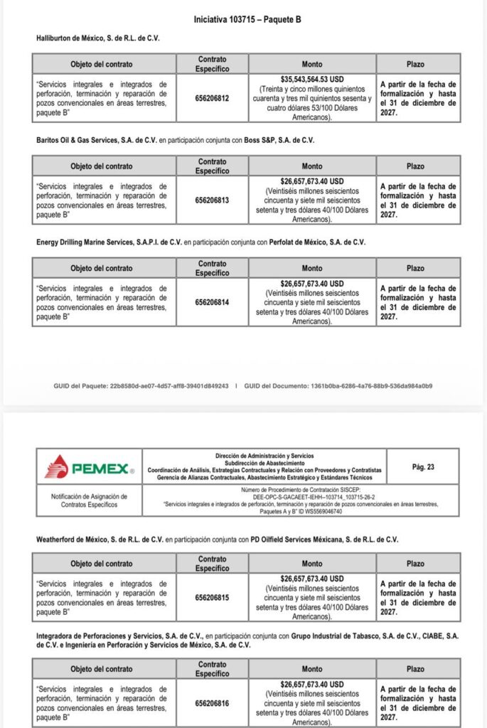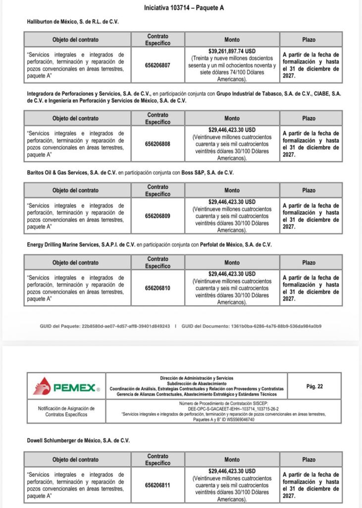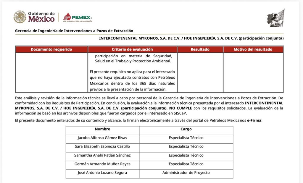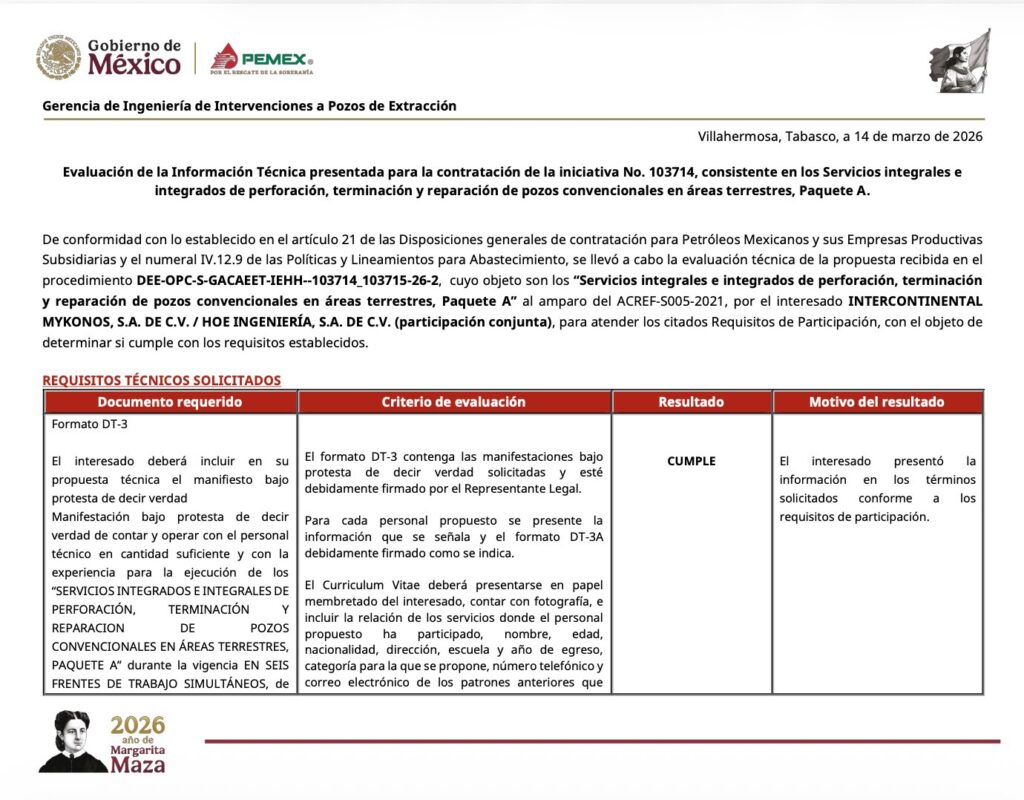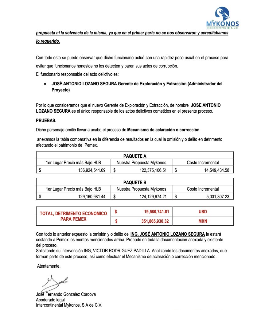 Denuncia al 9933989844… 🚩⚠️‼️¡JOSÉ A LOZANO SEGURA: Corrompe ACREF de Perforación y descarta a MYKONOS con propuesta más económica! Por medio de una misiva, solicitan la intervención de Víctor González Padilla, director general de @Pemex (DG); Marcela Villegas Silva, directora de Administración y Servicios (DAS); Ximena Jacinta García Ramírez, subdirectora de Abastecimiento (SA); Anuar David Conde Hernández, gerente de Alianzas Contractuales, Abastecimiento Estratégico y Estándares Técnicos (GACAEET); Rosa María Gutiérrez Rodríguez, titular del Órgano Interno de Control (OIC); y Carlos Rivera Palacio Than, gestión de Quejas y Denuncias (GQD), por los “delitos” cometidos contra la contratista MYKONOS INTERCONTINENTAL OIL & GAS de Gabriel del Ángel en el procedimiento de contratación para la suscripción de contratos específicos derivados del Acuerdo Referencial Número ACREF-S005-2021, Número DEE-OPC-S-GACAEET-IEHH-103714-103715-26-2 para servicios integrales e integrados de perforación, terminación y reparación de pozos convencionales en áreas terrestres (Paquetes A y B)”. Según el documento, signado por el representante legal José Fernando González Córdova, expone los actos impunidad sobre los puntos clave del resultado de la evaluación técnica que tienen la finalidad de favorecer a empresas con mayor precio ofertado y causar detrimento afectando los intereses financieros y evitando reducir la deuda histórica, al igual que aumentar la eficiencia operativa en este proyecto de @Pemex . Explica que cronológicamente se realizó el proceso DEE-OPC-S-GACAEET-IEHH-103714-103715-25-1, el cual sin motivo alguno se canceló, toda vez que en dicha evaluación comercial, técnica y económica MYKONOS acreditó al 100% con una propuesta técnica y económica que beneficiaba a la paraestatal. Más aún cuando se le solicitó a la contratista y solventó las dudas en la propuesta en la etapa de “Mecanismo de Aclaración o Corrección” de aspectos relacionados con el contenido de las cotizaciones, la cual forma parte de las bases del proceso. Proceso que llevó a cabo el responsable en el área técnica Antonio Enrique Zamarrón Galván conforme a las reglas para la suscripción de contratos específicos derivados del acuerdo referencial número ACREF-S005-2021, quien después fue removido. Posteriormente José Antonio Lozano Segura asumió la Gerencia de Exploración y Extracción y quedó como Administrador del Proyecto, mismo que -como continuidad a este proceso- volvió a solicitar la cotización con el número DEE-OPC-S-GACAEET-IEHH-103714-103715-26-2, con los mismos requisitos de evaluación del primero -mencionado- y en el cual en la etapa de subsanación no se observó nada y el día 17 de marzo de 2026 les enviaron -vía SISCEP- el documento de resultado y asignación de los contratos a las empresas (en evidente dedazo), donde se informó que la propuesta técnica de MYKONOS no cumplió, sin dar los fundamentos del desechamiento y por ende no evaluaron la nueva oferta económica. De igual forma se debió considerar la etapa de “Mecanismo de Aclaración o Corrección” de aspectos relacionados con el contenido de las cotizaciones, tal cual se menciona en la pagina 14 de las Reglas para la Suscripción de Contratos Específicos derivados del Acuerdo Referencial Número ACREF-S005-2021 (versión final) el cual versa: Numeral IV.5 Mecanismo de aclaración o corrección de aspectos relacionados con el contenido de las cotizaciones: La Convocante ( @Pemex ) podrá solicitar aclaraciones o correcciones de aspectos relacionados con el contenido de las cotizaciones, como se explica a continuación: A) La Convocante será el único conducto para solicitar a los Posibles Proveedores que aclaren o corrijan aspectos relacionados con el contenido de sus cotizaciones, incluyendo aquellas que requiera el Administrador del Proyecto (José Antonio Lozano Segura). B) La solicitud que realice la Convocante a los Posibles Proveedores se formulará por escrito y se señalará el mecanismo y plazo correspondiente para efectuar las aclaraciones o correcciones solicitadas. C) Los posibles Proveedores darán respuesta por escrito dentro del plazo que al efecto se establezca en la solicitud, debiendo versar las respuestas estrictamente sobre la aclaración o corrección solicitada. D) Las aclaraciones o correcciones que haga el posible Proveedor no podrán modificar los términos y condiciones esenciales de la cotización, tales como precio, plazo, especificaciones y alcance. Se podrán corregir o aclarar aquellos documentos que formen parte integrante de su cotización y que debido a la forma en que se presenten se requiera información adicional para su adecuado entendimiento y evaluación. Por tal motivo MYKONOS solicitó -vía correo- el día 19 de marzo que le enviaran dichos documentos que anexó a el presente y en los cuales se aprecia que los motivos de desechamiento no afectan en lo más mínimo la propuesta ni la solvencia de la misma, ya que en la primera parte no se “observó” nada y acreditó lo requerido. Según la misiva, con todo esto se puede observar que José Antonio Lozano Segura, a quien califican como “responsable de los actos delictivos en el proceso”, actuó con una rapidez poco usual en el proceso para evitar que funcionarios honestos no los detecten y paren sus actos de corrupción. Otra prueba más -asegura el oficio de la contratista afectada- es que José Antonio Lozano Segura omitió llevar a acabo el proceso de “Mecanismo de Aclaración o Corrección” y anexa la tabla comparativa de las propuestas económicas que se hicieron a @Pemex que muestra la diferencia de resultados en la cual “la omisión y/o delito es en detrimento del patrimonio de la petrolera nacional”. En el Paquete A: El 1 lugar con el precio más bajo (HLB) es de 136,924,541.09 dólares y la propuesta de MYKONOS es de 122,375,106.51 dólares, o sea