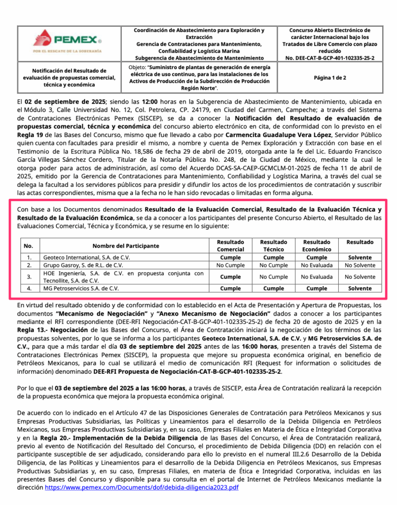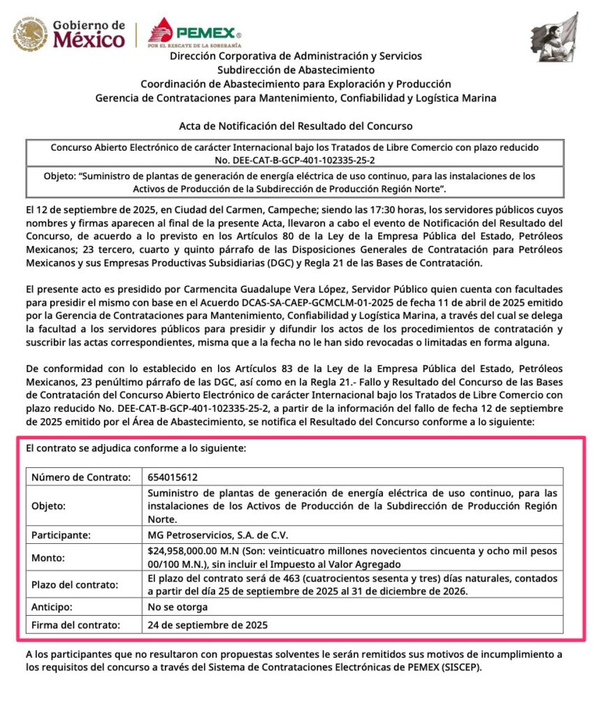 Denuncia al 9933989844…🚩⚠️‼️💵 ¡MG PETROSERVICIOS, opacidad en fallo de $23 MDP; tienen 1.8 MMDP con Pemex; 2022 se catapultaron!; Alejandro Gutiérrez Guerrero y los hermanos Reijer Jan, Jeannet Nicole y Rolando Alberto Maggi Versteeg recibieron su Halloween a través de MG Petroservicios con el contrato el 654015612, entregado el pasado 12 de septiembre, con el fallo irregular de la licitación DEE-CAT-B-GCP-401-102335-25-2 para suministro de plantas de generación de energía eléctrica de uso continuo para las instalaciones de los Activos de Producción de la Subdirección de Producción Región Norte (SPRN ahora SERTN) de Faustino Fuentes Nucamendi por un monto de 24,958,000 pesos y vigente hasta el l 31 de diciembre de 2026; este concurso estuvo mal desde la apertura de propuestas donde @Pemex -como ya es costumbre en este sexenio- ocultó los montos que se ofertaron en la apertura de propuestas no sólo de MG, sino de los otros participantes; se mantuvieron en secreto las cifras presentadas por Geoteco International (que sí pasó todas las evaluaciones), Grupo Gasroy (que no cumplió en lo técnico y comercial) y HOE Ingeniería/Tecnollite (que no cumplió en lo técnico); conforme a las bases de datos de contratos de @Pemex , MG de Alejandro y los hermanos Maggi Versteeg crecieron desmedidamente con 16 gigantescos contratos -incluyendo el actual- con valor de 1,869,231,739.33 pesos (EPN 2, AMLO 10 y Sheinbaum 3); en 2018 fueron: 1.- El contrato 644018802 para reacondicionamiento a motobombas de combustión interna de las instalaciones de explotación del Activo Integral de Producción Bloque N03 por 45,183,632 pesos a un plazo del 25 de junio de 2018 al 31 de mayo de 2022; 2.- El 644018813 para servicios de rehabilitación general a sistemas de enfriamiento en instalaciones de explotación del Activo Integral de Producción Bloque N02 vigente del 8 de agosto de 2018 al 31 de diciembre de 2020 por un monto de 22,388,589 pesos; en 2022 fueron 3.- El 648232834 para servicio integral de mantenimiento a motores de combustión interna y equipos auxiliares en las instalaciones marinas de @Pemex Exploración y Producción (PEP ahora DEE) de Ángel Cid Munguía (mantenimiento para motores de combustión interna marca MTU-Detroit Diésel y generadores marca Marathon Electric, Magnamax y Baylor) vigentes del 10 de abril de 2022 al 31 de diciembre de 2024 por 81,250,000 pesos; 4.- El 648232833 para servicio integral de mantenimiento a motores de combustión interna y equipos auxiliares en las instalaciones marinas de PEP ahora DEE (mantenimiento para motogeneradores marca Cartepillar) a un plazo del 10 de abril de 2022 al 31 de diciembre de 2024 por 81,250,000 pesos; 5.- El 644012602 para suministro de accesorios y materiales para bombas hidráulicas del Activo de Producción Poza Rica-Altamira (APPRA ahora AEPRA) de José Adolfo Castillo de la Vega, a un plazo del 27 de septiembre de 2022 hasta el 31 de diciembre de 2023 por 10,001,975.66 pesos; 6.- El 5400033795 para conservación de equipo dinámico para manejo de producción en la GOTLP Norte, vigente del 28 de septiembre de 2022 al 31 de diciembre de 2024 por 195,522,311.1 pesos; en 2023 fueron: 7.- El 644013832 para mantenimiento correctivo a los sistemas de redes contra incendio del Activo del APPRA vigente desde el 6 de agosto de 2023 hasta el 31 de diciembre de 2025 por 19,620,545.32 pesos; 8.- El 645013847 para servicio de rehabilitación a moto bombas principales de envío de crudo, trasiegos y agua congénita de las instalaciones de la Subdirección de Producción Región Sur (SPRS ahora SERTS) de Marcos Torres Fuentes vigente del 12 de mayo de 2023 al 31 de diciembre de 2025 al 197,792,115.3 pesos; 9.- El 644013815 para rehabilitación general a sistemas de enfriamiento en instalaciones de explotación de los Activos de la SPRN ahora SERTN, vigente desde el 16 de marzo de 2023 al 31 de diciembre de 2024 por 64,298,364.08 pesos; 10.- El 644013804 para reacondicionamiento y suministro de refacciones para vasijas electrostáticas, equipos de deshidratación y endulzamiento del Activo de Producción Veracruz (APV ahora AEV) de Luis Fernando Aguilera Naveja vigente desde el 2 de septiembre de 2023 al 31 de diciembre de 2024 por 33,997,877.92 pesos; en 2024 y 2025: 11.- El 644014607 para el suministro de refacciones para vasijas electrostáticas, equipos de deshidratación y endulzamiento del APV ahora AEV por 17,212,612.63 pesos vigente desde el 7 de octubre de 2024 hasta el 30 de junio de 2026; 12.- El 648234820 para rehabilitación y/o mantenimiento a sistemas eléctricos y equipos electromecánicos de PEP ahora DEE, vigente del 14 de octubre de 2024 hasta el 30 de noviembre de 2027 por 83,934,354 pesos; 13.- El 648234812 en propuesta conjunta con Energy & Technology Solutions, otra empresa representada por Alejandro, para ejecutar el servicio integral de mantenimiento a motores de combustión interna y equipos auxiliares en las instalaciones marinas de PEP ahora DEE (motores marca MTU-Diesel y generadores marca Marathon Electric, Magnamax y Baylor) por un monto de 110,999,795 pesos vigente desde el 13 de agosto de 2024 hasta el 31 de diciembre de 2027; 14.- El 655025801 entregado el 24 de marzo de 2025 y vigente hasta el 31 de diciembre de 2027 para realizar la rehabilitación de subestaciones eléctricas, líneas, circuitos y equipos eléctricos de transmisión y distribución en alta, media y baja tensión y alumbrado en general de las instalaciones terrestres de los Activos de Producción de PEP ahora DEE por un monto de 606,195,904.79 pesos; y 15.- El 655015817 para el servicio de rehabilitación a motobombas principales de envío de crudo, trasiegos y agua congénita de las instalaciones de la SPRS ahora SERTS vigente desde el 22 de mayo de 2025 hasta el 31 de diciembre de 2026 por un monto de 299,583,662.53 pesos; atención @Claudiashein @MarcelaVilleg15 @CNE_Mex @SENER_mx @GobiernoMX @FGRmexico @LuzElena_GE