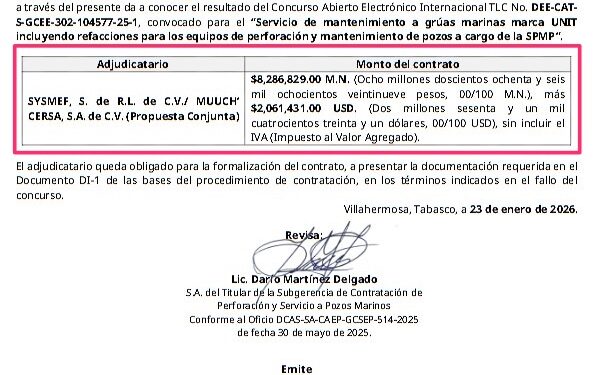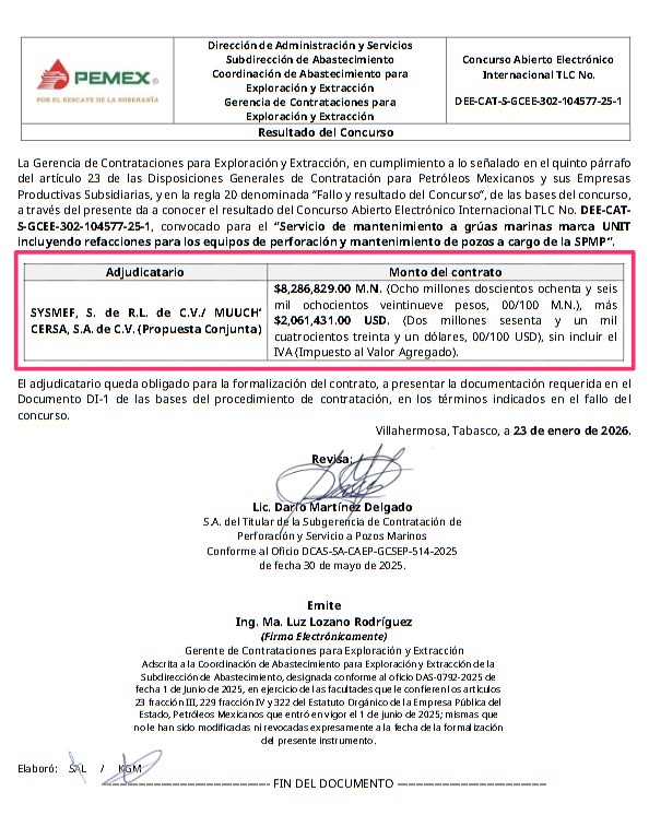 Denuncia al 9933989844… 🚩⚠️ ¡Micro empresa SYSMEF/MUUCH’CERSA gana contrato Pemex por 44 MDP!; SYSMEF, a nombre de Erasmo Fernández Guardado, que aparece con estratificación de ¡¡¡micro-empresa!!! en la Plataforma Nacional de Transparencia (PNT), @Pemex le adjudicó el 23 de enero pasado el fallo de la licitación DEE-CAT-S-GCEE (todavía con Lucy Lozano Rodríguez) 100-102903-25-1 para mantenimiento a grúas marinas marca UNIT incluyendo refacciones para los equipos de perforación y mantenimiento de pozos a cargo de la Subdirección de Perforación y Mantenimiento a Pozos (SPMP); contrato que ejecutará en propuesta conjunta con MUUCH’CERSA por un monto en moneda nacional de 8,286,829 pesos + 2,061,431 dólares que suman 44,583,917.87 pesos aproximadamente. Este contrato está estipulado en las bases de contratación que estará vigente hasta el 31 de diciembre de 2028, firmado por los funcionarios Darío Martínez Delgado, SAP del Titular de la Subgerencia de Contratación de Perforación y Servicio a Pozos Marinos, y Lucy Lozano Rodríguez, entonces gerente de Contrataciones para Exploracion y Extraccion. En la primera junta de aclaraciones CEDISUR que formuló 7 preguntas, en una pidió a @Pemex que de ganar, para el cargo del Responsable de la Seguridad, Salud en el Trabajo y Protección Ambiental en el contrato se aceptara personal con educación superior titulado en ingeniería industrial o ambiental, pero @Pemex rechazó la solicitud e insistió que el personal para ese puesto debe contar con licenciatura en alguna de las ingenierías como son petrolera, petroquímica, química, petróleo y gas o sólo en petróleo. Aunque habían mostrado interés por participar incluso hicieron cuestionamientos a @Pemex , CEDISUR de los hermanos Arrocha Alarcón, y CICSA de Andrés García Castillo, declinaron y dejaron en el concurso sólo a Corporación ITAIPU de Venis Padilla Chan y Luis Fernando González Gutiérrez “El Vampiro Morferatu”, a pesar de que este último fue representante de una compañía gringa y lo metieron al bote por meterle la mano a la caja, o sea con antecedentes penales; además, de la micro-empresa SYSMEF de Erasmo Fernández Guardado. Conforme los datos de la PNT, la micro-empresa SYSMEF tiene un registro en el padrón de proveedores de la Comisión Federal de Electricidad (CFE) en Ciudad del Carmen, Camp, en pleno centro de la isla, es una calle donde no hay instalaciones ni talleres industriales, en su mayoría casas hay viejas y negocios de comida. Por su parte MUUCH’CERSA, no cuenta con ningún registro público previo. atención @Claudiashein @MarcelaVilleg15 @CNE_Mex @SENER_mx @GobiernoMX @FGRmexico @LuzElena_GE @ASF_Mexico @SCJN @STPS_mx @Tu_IMSS @SEMARNAT_mx @agencia_asea @CENAGAS_mx @IMPetroleo @SATMX @Hacienda_Mexico @BuenGobierno_mx @Centrofcrl #OIC #UIF #OmarReyesColmenares …Zas!!!