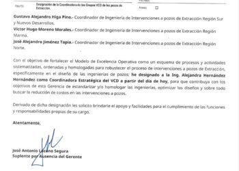 Mediante el oficio número PEP-DG-138-2017, el director general de PEMEX Exploración y Producción, CIRCUNCISIÓN HINOJOSA PUEBLA, notifica a PLÁCIDO GERARDO REYES REZA, subdirector de Producción Bloques Sur; a JOSÉ LUIS FONG AGUILAR “EL CHINO COCHINO”, subdirector de Producción Bloques Norte; a LEONARDO AGUILERA GÓMEZ, subdirector de Aseguramiento Operativo; a JORGE MORALES, subdirector de Producción Bloques Aguas Someras AS02; y a RAFAEL PÉREZ HERRERA, subdirector de Producción de Bloques Aguas Someras AS01; la transferencia de los contratos relacionados con el proceso de intervenciones a pozos a la Subdirección de Servicios a la Explotación de PEP…