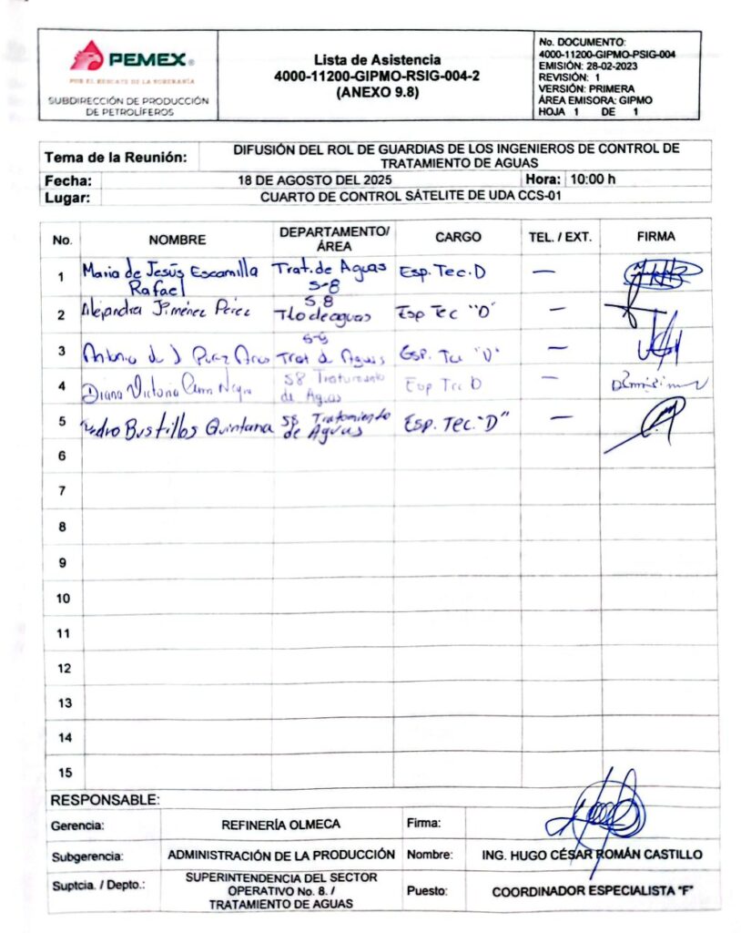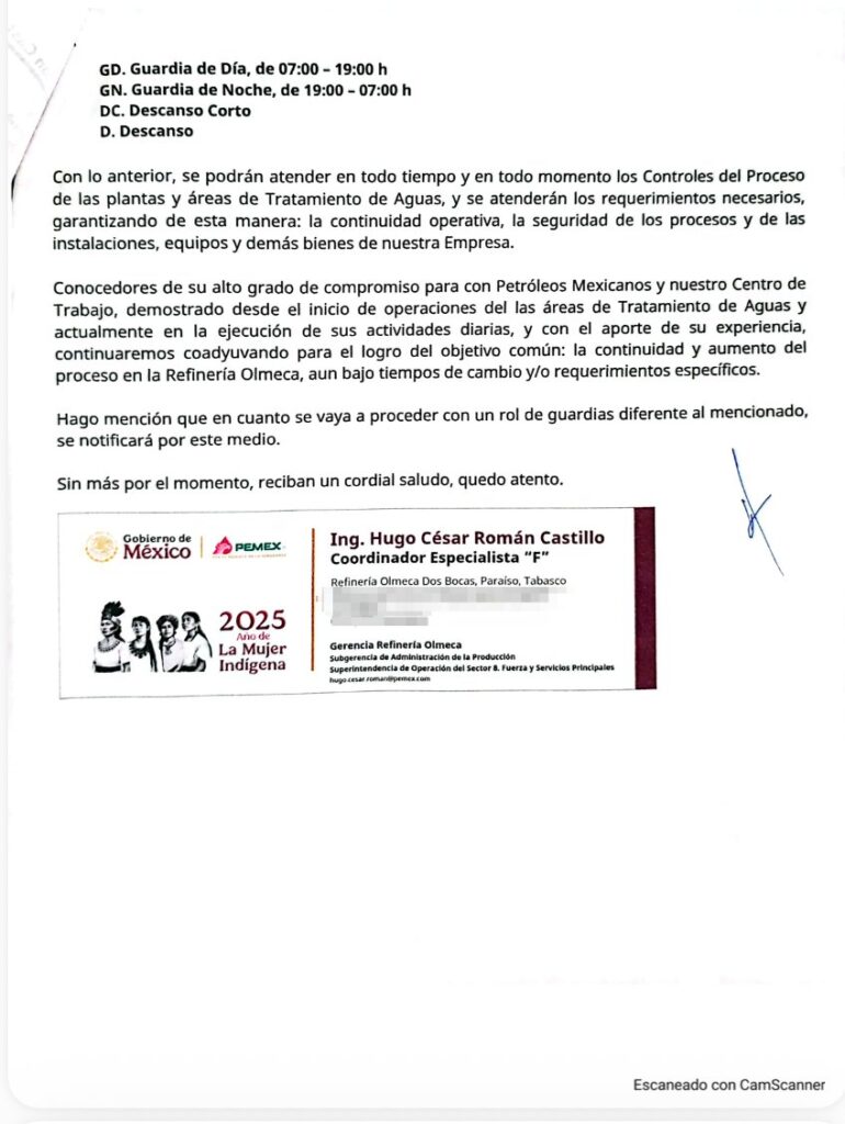 Denuncia al 9933989844… 🚩⚠️👨‍🏭🏭 ¡Negrea ROMÁN CASTILLO en Tratamiento de Aguas de la Olmeca por beneficiar a incondicional!; en la refinería Olmeca, Paraíso, Tab, Hugo César Román Castillo, líder de Arranque Pretratamiento de Aguas y UDA S, N-35 y coordinador especialista F, por andar atrás del gerente Julio César Aguilar Benítez, llevándole el cafecito diario, le dejó el encargo de tratamiento de aguas en el Sector 8 de Fuerza y Servicios Principales a Roberto García Ramos, líder de Arranque Planta Cogeneración y Servicios Sector 8, desde 2024 misma fecha en que colocó a su incondicional Victoria Cerón, N-33, ingeniero de control del mismo tratamiento de aguas, en un rol especial de diario, sacándola de los turnos, con el pretexto de apoyarlo con las actividades administrativas, por lo que hasta la fecha 6 ingenieros continúan laborando 12 horas 3 días de día y 3 de noche, cubriendo el rol de la ingeniera en cuestión en un claro conflicto de intereses, ya que son pareja en línea de mando directa, además de las amigas de ambos, María Escamilla, N-33, quien está de jornada diaria, entrando a las 8:00 am, situación desde hace más de un año en la que los líderes se hacen de la vista gorda por ser protegido del gerente, mientras tanto los otros ingenieros sufren el maltrato y acoso de Hugo César Román Castillo porque no quiere mandar a su incondicional a los turnos; se anexa correo donde Hugo César Román Castillo acosó a los demás ingenieros, debido a que pidieron turnos de 8 horas en su rol normal como todos los demás sectores de la refinería, como en el área de Cogeneración del mismo Sector 8 que laboran 8 horas; atención @Claudiashein @MarcelaVilleg15 @SENER_mx @FGRmexico @LuzElena_GE @ASF_Mexico @PabloGomez1968 @SCJN @STPS_mx @Tu_IMSS @SEMARNAT_mx @agencia_asea @CENAGAS_mx @IMPetroleo @SATMX @Hacienda_Mexico @BuenGobierno_mx #RaquelBuenrostro #OIC #UIF….Zas!!!