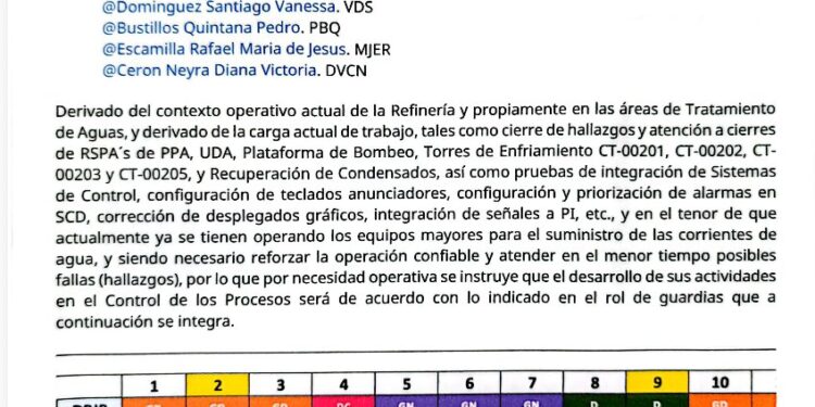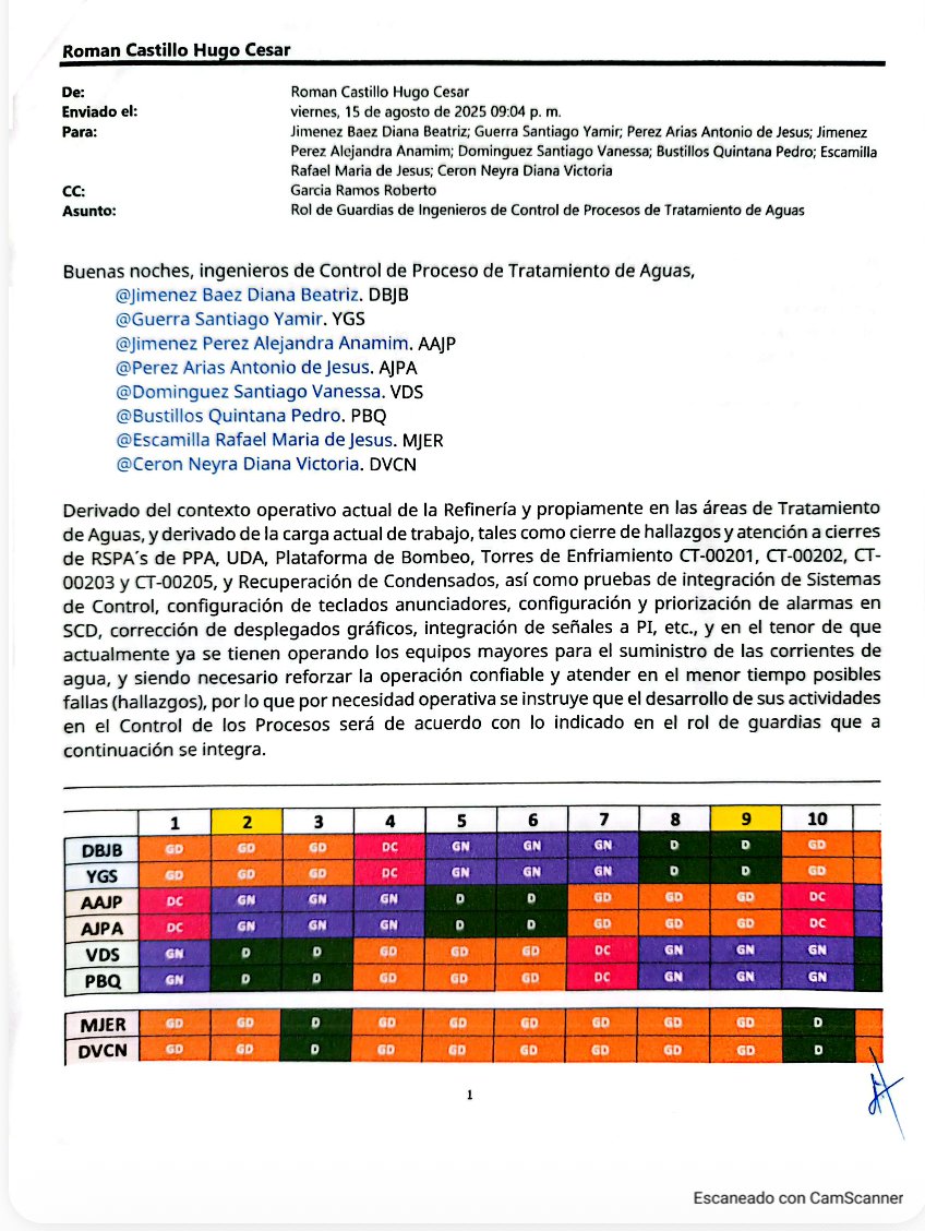 Denuncia al 9933989844… 🚩⚠️👨‍🏭🏭 ¡Negrea ROMÁN CASTILLO en Tratamiento de Aguas de la Olmeca por beneficiar a incondicional!; en la refinería Olmeca, Paraíso, Tab, Hugo César Román Castillo, líder de Arranque Pretratamiento de Aguas y UDA S, N-35 y coordinador especialista F, por andar atrás del gerente Julio César Aguilar Benítez, llevándole el cafecito diario, le dejó el encargo de tratamiento de aguas en el Sector 8 de Fuerza y Servicios Principales a Roberto García Ramos, líder de Arranque Planta Cogeneración y Servicios Sector 8, desde 2024 misma fecha en que colocó a su incondicional Victoria Cerón, N-33, ingeniero de control del mismo tratamiento de aguas, en un rol especial de diario, sacándola de los turnos, con el pretexto de apoyarlo con las actividades administrativas, por lo que hasta la fecha 6 ingenieros continúan laborando 12 horas 3 días de día y 3 de noche, cubriendo el rol de la ingeniera en cuestión en un claro conflicto de intereses, ya que son pareja en línea de mando directa, además de las amigas de ambos, María Escamilla, N-33, quien está de jornada diaria, entrando a las 8:00 am, situación desde hace más de un año en la que los líderes se hacen de la vista gorda por ser protegido del gerente, mientras tanto los otros ingenieros sufren el maltrato y acoso de Hugo César Román Castillo porque no quiere mandar a su incondicional a los turnos; se anexa correo donde Hugo César Román Castillo acosó a los demás ingenieros, debido a que pidieron turnos de 8 horas en su rol normal como todos los demás sectores de la refinería, como en el área de Cogeneración del mismo Sector 8 que laboran 8 horas; atención @Claudiashein @MarcelaVilleg15 @SENER_mx @FGRmexico @LuzElena_GE @ASF_Mexico @PabloGomez1968 @SCJN @STPS_mx @Tu_IMSS @SEMARNAT_mx @agencia_asea @CENAGAS_mx @IMPetroleo @SATMX @Hacienda_Mexico @BuenGobierno_mx #RaquelBuenrostro #OIC #UIF….Zas!!!