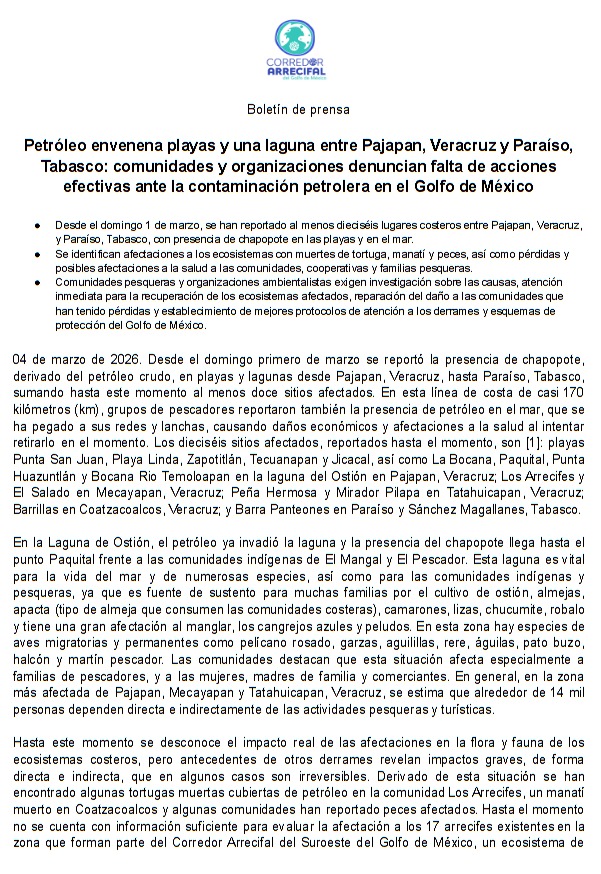 Denuncia al 9933989844…🚩⚠️‼️¡Olas de crudo en Veracruz y Tabasco causan mortandad; posible origen del derrame en Sonda de Campeche!; derrame de crudo con posible causa mar adentro frente a las costas de Campeche ha matado manatíes, tortugas y peces en 16 ubicaciones sobre las costas entre Pajapan, Veracruz, y Paraíso, Tabasco; 53 organizaciones civiles y comunidades denuncian serias afectaciones no sólo ambientales sino también económicas: En Veracruz 14 mil personas que dependen de pesca y turismo fueron afectadas en Pajapan, Mecayapan y Tatahuicapan. Mediante un comunicado 53 organizaciones civiles y comunidades encabezadas por la AC Corredor Arrecifal el Golfo de México, denunciaron un derrame de crudo -con posible origen frente a las costas de Campeche- que apareció desde el 1 de marzo en el mar sobre al menos 16 ubicaciones en las costas entre Pajapan, Veracruz, y Paraíso, Tabasco; tras la llegada de hidrocarburos se registraron muertes de ejemplares de tortuga, manatí y peces, así como posibles afectaciones a la salud a las comunidades, cooperativas y familias pesqueras. La afectación se extiende por más de 170 kilómetros de línea costera. Grupos de pescadores reportaron también la presencia de petróleo en el mar que se ha pegado a sus redes y lanchas, causando daños económicos y afectaciones a la salud al intentar retirarlo en el momento. En Veracruz, más de 14 mil personas que dependen de pesca y turismo fueron afectadas en Pajapan, Mecayapan y Tatahuicapan. Los sitios afectados son hasta el momento playas Punta San Juan, Playa Linda, Zapotitlán, Tecuanapan y Jicacal, así como La Bocana, Paquital, Punta Huazuntlán y Bocana Rio Temoloapan en la laguna del Ostión en Pajapan, Veracruz; Los Arrecifes y El Salado en Mecayapan, Veracruz; Peña Hermosa y Mirador Pilapa en Tatahuicapan, Veracruz; Barrillas en Coatzacoalcos, Veracruz; y Barra Panteones en Paraíso y Sánchez Magallanes, Tabasco. El petróleo -reportan- ya invadió toda la Laguna de Ostión (Veracruz) y la presencia del chapopote llega hasta el punto Paquital frente a las comunidades indígenas de El Mangal y El Pescador. En general, en la zona más afectada de Pajapan, Mecayapan y Tatahuicapan, Veracruz, se estima que alrededor de 14 mil personas dependen directa e indirectamente de las actividades pesqueras y turísticas, reporta el comunicado. Derivado de esta situación -explica la organización- se han encontrado algunas tortugas muertas cubiertas de petróleo en la comunidad Los Arrecifes, un manatí muerto en Coatzacoalcos y algunas comunidades han reportado peces afectados. Sin embargo, aunque este problema trascendió a todo el país por diferentes medios de comunicación, @Pemex se deslinda de responsabilidad. En su comunicado del 2 de marzo, @Pemex descartó “alguna fuga o derrame petrolero en las playas del sur de Veracruz, tras haber realizado inspecciones técnicas en sus instalaciones”. Sin embargo -subraya la queja de las organizaciones- investigadores han detectado con imágenes satelitales del 20 de febrero de este año, una mancha de petróleo de 37 km mar adentro frente a Campeche, que parece estar relacionada con infraestructura petrolera, además de una posible dispersión de hidrocarburos hacia Tabasco y Veracruz. atención @Claudiashein @MarcelaVilleg15 @CNE_Mex @SENER_mx @GobiernoMX @FGRmexico @LuzElena_GE @ASF_Mexico @SCJN @STPS_mx @Tu_IMSS @SEMARNAT_mx @agencia_asea @CENAGAS_mx @IMPetroleo @SATMX @Hacienda_Mexico @BuenGobierno_mx @Centrofcrl #OIC #UIF #OmarReyesColmenares …Zas!!!