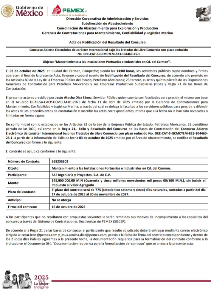 Denuncia al 9933989844… 🚩⚠️‼️ ¡Otro contrato de $45 MDP/Pemex al corrupto FAE/ALVARADO, dedo chiquito de ALITO!; mientras en Ciudad del Carmen, Camp, cierran comercios por la crisis económica y le deben una lanota a los proveedores de @Pemex , la empresa FAE Ingeniería y Proyectos del ganadero (que están de moda), José Alejandro Fuentes Alvarado, quien se ostenta también como presidente de la Coparmex en Campeche @CentroEmpreCamp , recibió el contrato 658235802 de la petrolera nacional como resultado fallo de la irregular licitación DEE-CAT-S-GCMCYLM (María Isabel Segovia Magaña) 823-104460-25-1 para mantenimiento a las instalaciones portuarias e industriales en la Isla por 45,900,000 pesos vigente por 775 contados a partir del día 17 de octubre de 2025 al 30 de noviembre de 2027 con lo que suma 4 contratos con la 4T; con este último contrato, Fuentes Alvarado ya aseguró la papa lo que resta del sexenio de @LaydaSansores , gobernadora de Campeche @UCSCampeche , con quien ahora presume lealtad, pero es el dedo chiquito de Alejandro Moreno Cárdenas @alitomorenoc , dirigente del PRI nacional @PRI_Nacional , quien lo fondeó y ahora es antagonista político de Layda; la licitación donde beneficiaron a FAE Ingeniería y Proyectos, que tuvo por muchos años a nombre de su secretaria, estuvo amañada desde la apertura de propuestas donde @Pemex mantuvo ocultos los montos económicos de todas las ofertas que recibió tanto de la empresa de Alvarado como de Firewall Technologies en propuesta conjunta con Downstream Controls y Ares Control; de Helthom Ingeniería y Construcción; de HOE Ingeniería; y de Prutech Management Consulting, lo que resulta en corrupción; Alvarado deberá realizar con su empresa actividades de desmantelamientos, demoliciones, sustitución de estructuras metálicas, albañilería, pinturas y recubrimientos, aluminio, herrería, carpintería, techumbres, rotulación y señalización de seguridad, instalación hidráulica y sanitaria, instalación eléctrica, electromecánica y la instalación de detectores de humo y extintores; estas actividades estarán en armonía con los trabajos de dragado realizado por el Administración Portuaria Integral Campeche @apicampeche con maquinaria donada por @Pemex al Gobierno del Estado de Campeche, en el canal de acceso al puerto del Carmen y con las que Alvarado podrá presumir alianza ante la opinión pública e influyentismo contractual; Fuentes Alvarado, a quién @Pemex sí le paga todas sus facturas, tiene vigente el contrato 648233827 con FAE Ingeniería y Proyectos, para mantenimiento a infraestructura civil y obras complementarias en instalaciones de los Activos de Producción de @Pemex Exploración y Producción (PEP ahora DEE) firmado el 22 de diciembre de 2023 y que finaliza el 31 de diciembre de 2025 por un monto de 71,098,635.33 pesos; con su otra empresa, Detectores y Controladores del Golfo, le dieron el contrato 640853800 para habilitación de drenado automático de tanques de almacenamiento y deshidratación por 576,401,127.5 pesos firmado el 25 de enero de 2023 y concluido el 7 de diciembre de 2024; y en simultáneo los contratos 648813861 y 648813860, uno por 303,935,730.3 pesos y el otro por 27,823,666.38 pesos respectivamente, ambos para rehabilitación de equipos rotativos y sistemas auxiliares instalados en los centros de proceso y plataformas satélites de los Activos de Producción de la Región Marina Noreste (RMNE ahora AERMNE) de José Luis Guzmán Almazo, signados los dos mañosamente, un viernes, en vacaciones y temporada decembrina, el 29 de diciembre de 2023, a solo unas horas de terminar el año, con fecha de término el 31 de diciembre de 2024; lo peor es que FAE también construye calles en municipios de Campeche como en Calakmul, donde le dieron un contrato por 1,250,000 pesos para pavimentación el 5 de octubre de 2022; ese mismo año en Escárcega también aparece en los registros de la cuenta pública de ese municipio la asignación a FAE del contrato 22/9097 por pavimentación de calles por un monto de 2,848,719.22 pesos; y en Hopelchen hay registro de un acta de finiquito fechada el 9 de septiembre de 2022 de una obra de pavimentación también asignada a FAE por 998,397 pesos; en 2018 estallaron señalamientos de constructores campechanos que denunciaron que Fuentes Alvarado los subcontrató para que construyeran obras complementarias de la remodelación del acueducto Hobomó en Campeche, contrato que le asignaron a él y que tras la conclusión de los trabajos por los constructores, no les pagó ni un peso de la bolsa de 600 millones de pesos que le asignaron desde el gobierno de Alejandro Moreno Cárdenas cuando fue el gobernador de Campeche; atención @Claudiashein @MarcelaVilleg15 @CNE_Mex @SENER_mx @GobiernoMX @FGRmexico @LuzElena_GE @ASF_Mexico @SCJN @STPS_mx @Tu_IMSS @SEMARNAT_mx @agencia_asea @CENAGAS_mx @IMPetroleo @SATMX @Hacienda_Mexico @BuenGobierno_mx @Centrofcrl #OIC #UIF #OmarReyesColmenares …Zas!!!