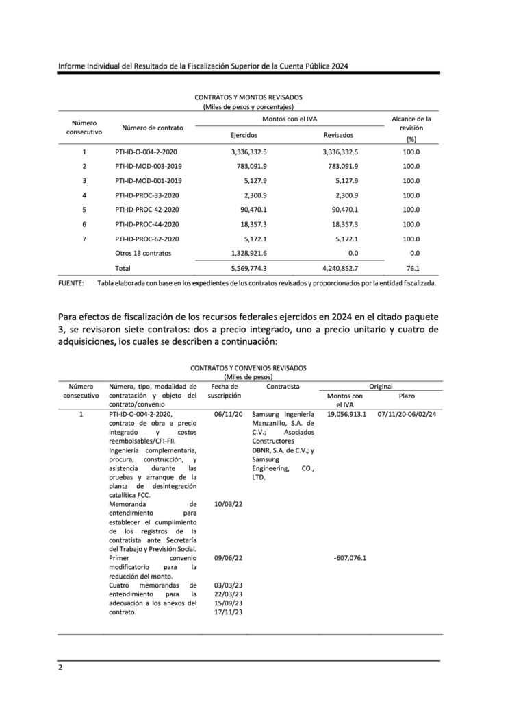 Denuncia al 9933989844… 🚩⚠️🏭‼️¡PAQUETE 3 REFINERÍA OLMECA: Desfase presupuestal de 5,569 MDP; 43,372 MDP en todo el complejo, detectó ASF 2024! En la ronda de 31 auditorías a la cuenta pública de @Pemex en el ejercicio del año 2024, la Auditoría Superior de la Federación (ASF), que ahora dirige Aureliano Hernández Palacios Cardel, detectó deficiencias, pagos indebidos y posibles responsabilidades administrativas en el desarrollo del Paquete 3 de la nueva refinería en Dos Bocas, Tabasco, operado por @Pemex, de acuerdo con la revisión de la Cuenta Pública 2024. Aunque en términos generales se cumplió con la normativa, el órgano fiscalizador documentó irregularidades específicas en contratos, manejo de recursos y controles internos. La auditoría revisó un universo de 5 mil 569 millones 774 mil pesos, de los cuales analizó una muestra de 4 mil 240 millones 852 mil pesos, equivalente al 76.1% del total ejercido en siete contratos clave del proyecto. Estos contratos abarcan obras, suministros e instalaciones vinculadas a plantas estratégicas como la de desintegración catalítica, alquilación e isomerización. Entre los contratos más relevantes se encuentra el PTI-ID-O-004-2-2020, adjudicado a SAMSUNG Ingeniería Manzanillo, Asociados Constructores DBNR y SAMSUNG Engineering, con un monto modificado de 19 mil 646 millones de pesos. De este total, 3 mil 336 millones fueron ejercidos en 2024. También destaca el contrato PTI-ID-MOD-003-2019, con UOP LLC e ICA Fluor, cuyo monto modificado ascendió a 17 mil 82 millones de pesos, de los cuales 783 millones correspondieron al ejercicio fiscal revisado. La ASF documentó múltiples convenios modificatorios en prácticamente todos los contratos analizados, que implicaron ampliaciones de monto y plazo, reducciones parciales y ajustes técnicos. Por ejemplo, el contrato principal de obra acumuló al menos cinco convenios modificatorios que incrementaron el monto en más de mil millones de pesos y extendieron su ejecución hasta diciembre de 2024. El hallazgo más relevante corresponde al contrato PTI-ID-PROC-42-2020, relacionado con la adquisición del soplador de aire principal. La ASF detectó un pago en exceso por 21 millones 109 mil pesos por servicios de reparación de una turbina que aún se encontraba bajo garantía vigente. De acuerdo con el informe, la turbina sufrió daños por una falla atribuida a la obstrucción de líneas de drenaje, provocada por la instalación de “juntas ciegas”. A pesar de que esta condición anulaba la responsabilidad del proveedor, @Pemex autorizó el pago de la reparación con recursos públicos, sin determinar quién fue responsable de la modificación que originó el daño. La ASF concluyó que no debió realizarse dicho pago, ya que la garantía cubría defectos y vicios ocultos hasta octubre de 2024. Esta omisión derivó en un uso indebido de recursos y en la pérdida de cobertura contractual. Por estos hechos, la auditoría promovió una Responsabilidad Administrativa Sancionatoria contra servidores públicos de @Pemex que autorizaron la intervención de la turbina, sin justificar la cancelación de la garantía. La investigación deberá determinar las responsabilidades individuales y, en su caso, aplicar sanciones conforme a la normativa vigente. En materia presupuestal, la ASF constató un desfase significativo entre lo aprobado y lo ejercido. Mientras que el Presupuesto de Egresos de la Federación 2024 contempló 2 mil 752 millones de pesos para @Pemex Transformación Industrial, el gasto reportado ascendió a más de 46 mil 124 millones de pesos. De estos recursos, 42 mil 696 millones fueron transferidos a PTI Infraestructura de Desarrollo para capitalizar el proyecto de Dos Bocas, incluyendo los 5 mil 569 millones ejercidos en los contratos del Paquete 3. Cabe señalar que muchas de estas ampliaciones millonarias se dieron después de la inauguración -el 1 de julio de 2022- de la refinería Olmeca para conmemorar “el fin de la etapa constructiva”. Sin embargo, el arranque formal de operaciones y producción de combustibles ocurrió más de dos años después, iniciando el procesamiento de carga el 29 de junio de 2024 y formalmente el 3 de agosto de 2024. Atención @Claudiashein @MarcelaVilleg15 @CNE_Mex @SENER_mx @GobiernoMX @FGRmexico @LuzElena_GE @ASF_Mexico @SCJN @STPS_mx @Tu_IMSS @SEMARNAT_mx @agencia_asea @CENAGAS_mx @IMPetroleo @SATMX @Hacienda_Mexico @BuenGobierno_mx @Centrofcrl @SEMAR_mx @PROFEPA_Mx @Mx_Diputados @senadomexicano #OIC #UIF #OmarReyesColmenares….Zas!!!