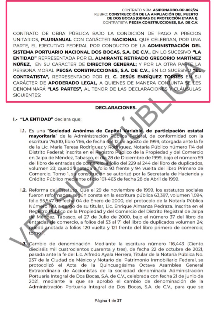 Denuncia al 9933989844…🚩⚠️‼️ ¡PEGSA, 10,327 MDP para escolleras TMDB; no paga a trabajadores!; mientras el Sindicato Nacional Andrés Quintana Roo de Trabajadores y Empleados de la República Mexicana emplazó a huelga a Pegsa Construcción @pegsaconstrucciones de Francisco Javier Ochoa Peral y Omar de Jesús Anitua Valdovinos para el 8 de diciembre tras negarse a corregir hostigamientos y precarias condiciones salariales y laborales; esta empresa acumula 2 contratos por 10,327,451,989 pesos para la ampliación del construcción de escolleras en la Terminal Marítima Dos Bocas (TMDB), Paraíso, Tabasco, donde se encuentran instalaciones de @Pemex , por Adjudicación Directa de la Administración del Sistema Portuario Nacional Dos Bocas (Asipona Dos Bocas) controlado por la @SEMAR_mx , que debe terminar-entregar mañana 3 de diciembre 2025, lo que no sucederá; según los trabajadores hoy sería la conciliación entre Sindicato y representantes de la empresa en la CDMX; el contrato ASIPONADBO-OP-002/24 fue asignado en la Semar por Adjudicación Directa a Pegsa para la construcción de la ampliación del Puerto de Dos Bocas (obras de protección etapa 1) por un monto de 1,085,063,989.18 a un plazo de 540 días naturales, vigente desde el 12 de junio de 2024 al 3 de diciembre de 2025; sin embargo, en un anuncio en medios nacionales en septiembre de este año, la Semar inyectó más de 9,000 millones de pesos más a este proyecto para Pegsa en otro contrato ASIPONADBO-OP-004/25 y amplió el plazo de entrega hasta el 31 de diciembre de 2029; mientras los trabajadores de TMDB piden lo justo: horas extras pagadas, días de descanso y festivos, así como dotación de equipos de protección para desempeñar sus actividades, Pegsa desde el año pasado se embolsó 48,828,544.52 pesos cobrados del contrato DAF/OP/001/2025 con la Semar que ejecutó del 14 de enero al 21 de marzo de 2025 para la modernización a la infraestructura de la Escuela Náutica Mercante Cap. Alt. Fernando Silíceo y Torres; la situación con el sindicato se agravó estos días cuando Pegsa Construcciones se negó a firmar el Contrato Colectivo de Trabajo (CCT), a pesar que el Centro Federal de Conciliación y Registro Federal les expidió la Constancia de Representatividad; sobre esto, José Alberto Carrión Ruíz, secretario general del Comité Directivo Nacional, dijo que la empresa ha llegado a prohibir la comunicación de los más de 80 trabajadores de la obra con él, bajo amenaza de despido; el líder sindical denunció que volqueteros y proveedores de bancos de material que suministran las piedras necesarias para la obra, reciben pagos en efectivo y Pegsa no cubre el IVA lo que “constituye un delito fiscal”; este 2 de diciembre Carrión Ruíz fue convocado a una conciliación con Pegsa Construcciones en la Ciudad de México, que de no llegar a un acuerdo, el sindicato colocará las banderas roja y negra en la obra marcando el inicio de la huelga; en 2020, Pegsa fue señalada por la Auditoría Superior de la Federación (ASF) por incurrir en irregularidades, como aceptar pagos en exceso en obras contratadas por la Secretaría de Comunicaciones y Transportes (SCT ahora @SICTmx ) para ampliar la carretera Coatzacoalcos-Tuxtla Gutiérrez, en Veracruz (auditoría 2019-0-09100-22-0288-2020); también por simular competencia en el concurso de licitación para remodelar el estadio Luis Pirata Fuente, en 2022, cuando participó contra otra empresa que se encontraba vinculada por un socio en común, de acuerdo con la auditoría 2022-A-30000-1922-2023; atención @Claudiashein @MarcelaVilleg15 @CNE_Mex @SENER_mx @GobiernoMX @FGRmexico @LuzElena_GE @ASF_Mexico  @SCJN @STPS_mx @Tu_IMSS @SEMARNAT_mx @agencia_asea @CENAGAS_mx @IMPetroleo @SATMX @Hacienda_Mexico @BuenGobierno_mx @Centrofcrl #OIC #UIF #OmarReyesColmenares …Zas!!!