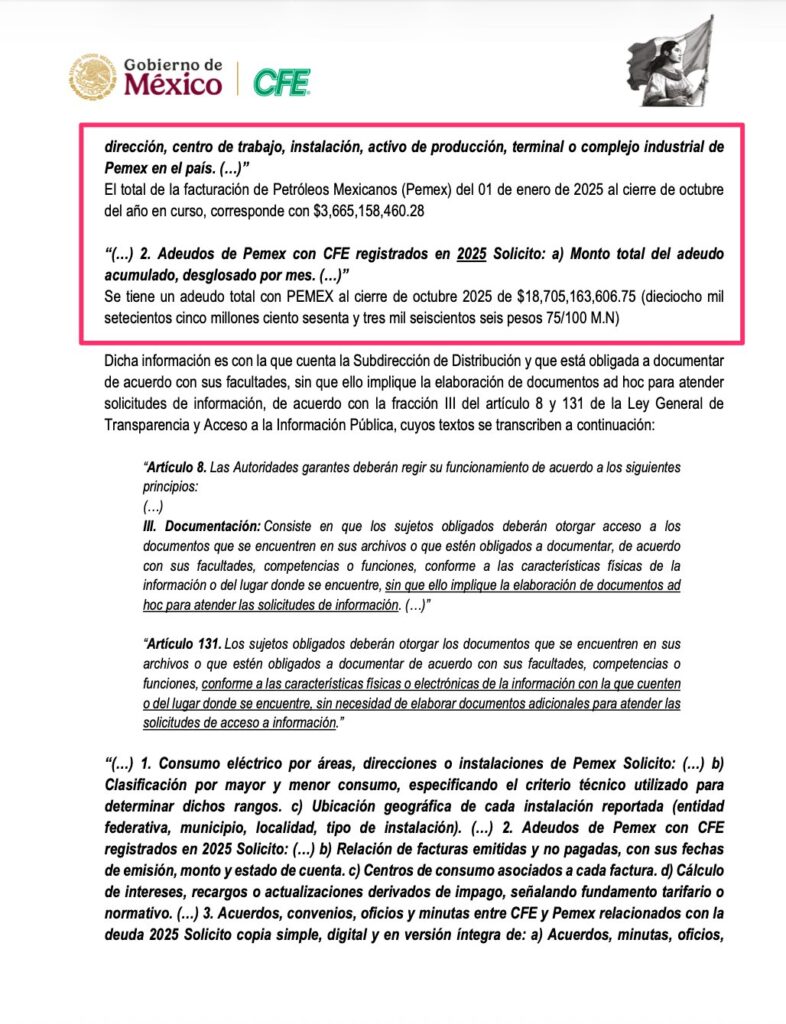 Denuncia al 9933989844… 🚩⚠️💸 ¡Pemex debe 18,705 MDP a la CFE!; unos 3,665 MDP solo de enero a octubre 2025. Una solicitud de acceso a la información dirigida a la Comisión Federal de Electricidad ( @CFEmx ) reveló vacíos documentales relevantes sobre el consumo eléctrico de @Pemex , así como cifras concretas sobre su facturación y adeudos acumulados durante 2025. La petición, identificada con el folio 340007700143425, buscaba conocer de manera detallada el consumo de energía eléctrica de @Pemex por instalaciones, áreas y centros de trabajo, así como el monto facturado, los adeudos registrados con la CFE, los acuerdos de pago existentes y las posibles sanciones derivadas del incumplimiento. Tras realizar una revisión en sus archivos y sistemas, la Dirección de Operación de la CFE, a través de la Subdirección de Distribución, informó que no cuenta con información documentada sobre el consumo eléctrico de @Pemex desglosado por áreas, direcciones, activos de producción, terminales o complejos industriales, ni expresado en kilowatts hora. De acuerdo con el análisis institucional, dicha información no obra en sus archivos y su inexistencia se sustenta en que la CFE no tiene obligación normativa de generar ese nivel de desagregación, por lo que no procede elaborar documentos específicos para atender la solicitud. A pesar de la inexistencia del detalle operativo solicitado, la CFE sí reportó cifras globales de facturación. Entre el 1 de enero de 2025 y el cierre de octubre del mismo año, la facturación total emitida a @Pemex por consumo eléctrico ascendió a 3,665,158,460.28 pesos. Esta cifra representa el monto acumulado facturado durante ese periodo, sin desglose por instalación, ubicación geográfica o nivel de consumo. En cuanto a los adeudos, la Subdirección de Distribución informó que, al cierre de octubre de 2025, @Pemex mantenía un adeudo total con la CFE por 18,705,163,606.75 pesos. La dependencia aclaró que esta es la información financiera con la que cuenta y que está obligada a documentar conforme a sus atribuciones, sin que ello implique detallar el adeudo por mes, por factura o por centro de consumo, como fue solicitado originalmente. La CFE también señaló que no dispone de documentación relacionada con la clasificación de instalaciones de @Pemex por mayor o menor consumo eléctrico, ni con la ubicación geográfica específica de los centros de carga asociados. Tampoco cuenta con registros documentales sobre facturas individuales no pagadas, fechas de emisión, estados de cuenta, cálculo de intereses, recargos o actualizaciones por impago, ni con información sobre acuerdos, convenios, reestructuras de deuda, minutas u oficios derivados de negociaciones entre ambas empresas durante 2025. De igual forma, la Empresa Productiva del Estado (EPE) indicó que no posee documentación que dé cuenta de sanciones, penalizaciones, restricciones de servicio u otras medidas aplicadas a @Pemex por retrasos o incumplimientos en el pago del servicio eléctrico durante el año en curso. Según su análisis jurídico-administrativo, la inexistencia de esta información se explica por la ausencia de obligación normativa para generar o concentrar dichos registros en los términos solicitados. La respuesta institucional subrayó que, conforme a la Ley General de Transparencia y Acceso a la Información Pública, los sujetos obligados deben entregar únicamente la información que obre en sus archivos o que estén legalmente obligados a documentar. En ese marco, reiteró que no procede la elaboración de documentos ad hoc para atender solicitudes de acceso a la información, aun cuando se trate de datos de carácter financiero u operativo vinculados al ejercicio de recursos públicos. atención @Claudiashein @MarcelaVilleg15 @CNE_Mex @SENER_mx @GobiernoMX @FGRmexico @LuzElena_GE @ASF_Mexico  @SCJN @STPS_mx @Tu_IMSS @SEMARNAT_mx @agencia_asea @CENAGAS_mx @IMPetroleo @SATMX @Hacienda_Mexico @BuenGobierno_mx @Centrofcrl #OIC #UIF #OmarReyesColmenares …Zas!!!