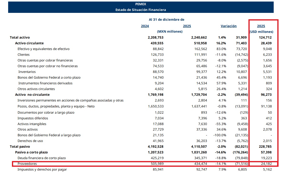 Denuncia al 9933989844… 🚩⚠️💸‼️¡Pemex debe 434,474 MDP a proveedores al cierre de 2025, revelan!; el especialista financiero @GMonroyEnergy publicó el estado de situación financiera de @Pemex al cierre de 2025 donde se contrastan las cifras con el año anterior 2024. Según los cifras, @Pemex debe 434,474 MDP al cierre de 2025, o sea -14.1% menos comparado con el cierre de 2024 cuando la deuda llegó a 505,989 MDP, lo que representa una variación de -71,516 MDP, que es lo que habría pagado durante ese año a las compañías que prestan servicios a la petrolera nacional a las que todavía se les debe mucho dinero. Asimismo la paraestatal revela pasivos totales por 4,110,507 billones de pesos al cierre de 2025 que comparado con el pasivo de 4,192,528 billones de pesos al cierre de 2024, hay una variación de -2.0% o sea unos 82,021 MDP. En este pasivo total están contenidos los pasivos de corto plazo: si sumamos la deuda de proveedores + deuda financiera de corto plazo + impuestos y derechos por pagar. atención @Claudiashein @MarcelaVilleg15 @CNE_Mex @SENER_mx @GobiernoMX @FGRmexico @LuzElena_GE @ASF_Mexico @SCJN @STPS_mx @Tu_IMSS @SEMARNAT_mx @agencia_asea @CENAGAS_mx @IMPetroleo @SATMX @Hacienda_Mexico @BuenGobierno_mx @Centrofcrl #OIC #UIF #OmarReyesColmenares …Zas!!!