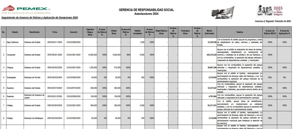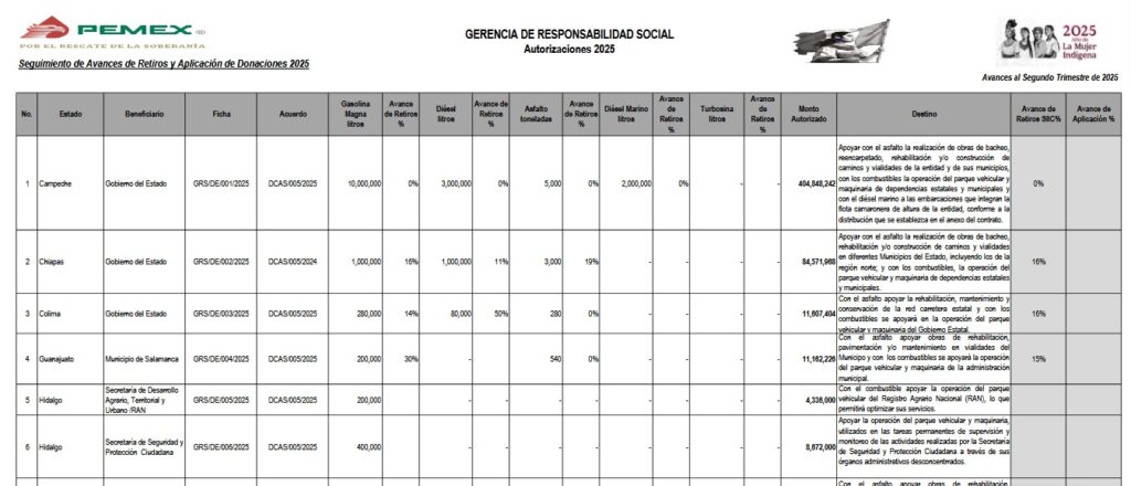 Denuncia al 9933989844… 🚩⚠️💸❗️¡Pemex: Dona 4,021 MDP en gasolinas y asfalto a 24 estados; Campeche, Tabasco y Veracruz acaparan 60.58%! Durante 2023, 2024 y el primer semestre de 2025 @Pemex ha donado más de 4,021 MDP en asfalto, diésel, diésel marino y gasolina a 24 estados de la república, de los que Campeche, Tabasco y Veracruz concentran el 60.58% de estos recursos. Conforme a los datos publicados de la Gerencia de Responsabilidad Social (GRS) de @Pemex , que encabeza César Raúl Ojeda Zubieta, durante 2023, 2024 y el primer semestre de 2025 se asignaron como donaciones en especie a 24 estados del país 11,100,000 litros de diesel marino -supuestamente para apoyar al sector pesquero-, 80,353,891 litros de gasolina, 33,781,950 litros de diesel y 131,880 toneladas asfalto que según @Pemex equivalen a 4,021,334,589 pesos. Por año: En 2023, @Pemex entregó 12,361,950 litros de gasolina, 12,361,950 litros de diésel, 7,860,000 litros de diésel marino (dirigido supuestamente para los pescadores de Campeche, Oaxaca y Quintana Roo), 29,786,257 litros de gasolina y 54,140 toneladas de asfalto con un valor de 1,625,984,072 pesos. En 2024 fueron 660,000 litros de diésel marino (sólo a Oaxaca y Quintana Roo); 27,540,000 litros de gasolina, 12,090,000 litros de diésel y 48,200 toneladas de asfalto con un valor de 1,582,957,331 pesos. En el primer semestre de 2025 -únicos datos disponibles- se donó en especie 2,580,000 litros de diésel marino (sólo Campeche y Oaxaca), 23,027,634 litros de gasolina, 9,330,000 litros de diésel y 29,540 toneladas de asfalto que equivalen a 812,393,186 pesos. A nivel nacional sólo Campeche concentró el 30.24% de todos los recursos por un total de 1,215,870,006 pesos en 30,300 toneladas de asfalto, 6,020,000 litros de diesel marino dirigido a pescadores ribereños -aunque la producción pesquera en este estado cayó 35.1% de 2018 a 2024 según datos oficiales del Anuario Estadístico de Acuacultura y Pesca 2024 publicado por @Conapesca -, 31,857,366 litros de gasolina y 13,240,000 litros de diesel. Le sigue Tabasco que concentra el 17.37% por un monto de 698,675,520 pesos entregado en forma de 19,520,000 litros de gasolina, 3,844,000 litros de diésel y 13,000 toneladas de asfalto. Veracruz concentra el 12.97 % equivalente a 521,687,654 pesos repartidos en 8,250,000 litros de gasolina, 6,321,446 litros de diesel y 27,000 toneladas de asfalto. Estados que no tienen pozos petroleros, ni actividad o instalaciones estratégicas de Pemex como Baja California Norte, Baja California Sur, Colima, Guanajuato, Morelos, Nayarit, Querétaro, Tlaxcala y Yucatán, concentran el 5.70% (229,173,536 pesos) de los 4,021 mil millones de pesos asignados por la Gerencia de Responsabilidad Social en forma de diésel, gasolina y asfalto durante 2023, 2024 y primer semestre de 2025. Atención @Claudiashein @MarcelaVilleg15 @CNE_Mex @SENER_mx @GobiernoMX @FGRmexico @LuzElena_GE @ASF_Mexico  @SCJN @STPS_mx @Tu_IMSS @SEMARNAT_mx @agencia_asea @CENAGAS_mx @IMPetroleo @SATMX @Hacienda_Mexico @BuenGobierno_mx @Centrofcrl #OIC #UIF #OmarReyesColmenares …Zas!!!
