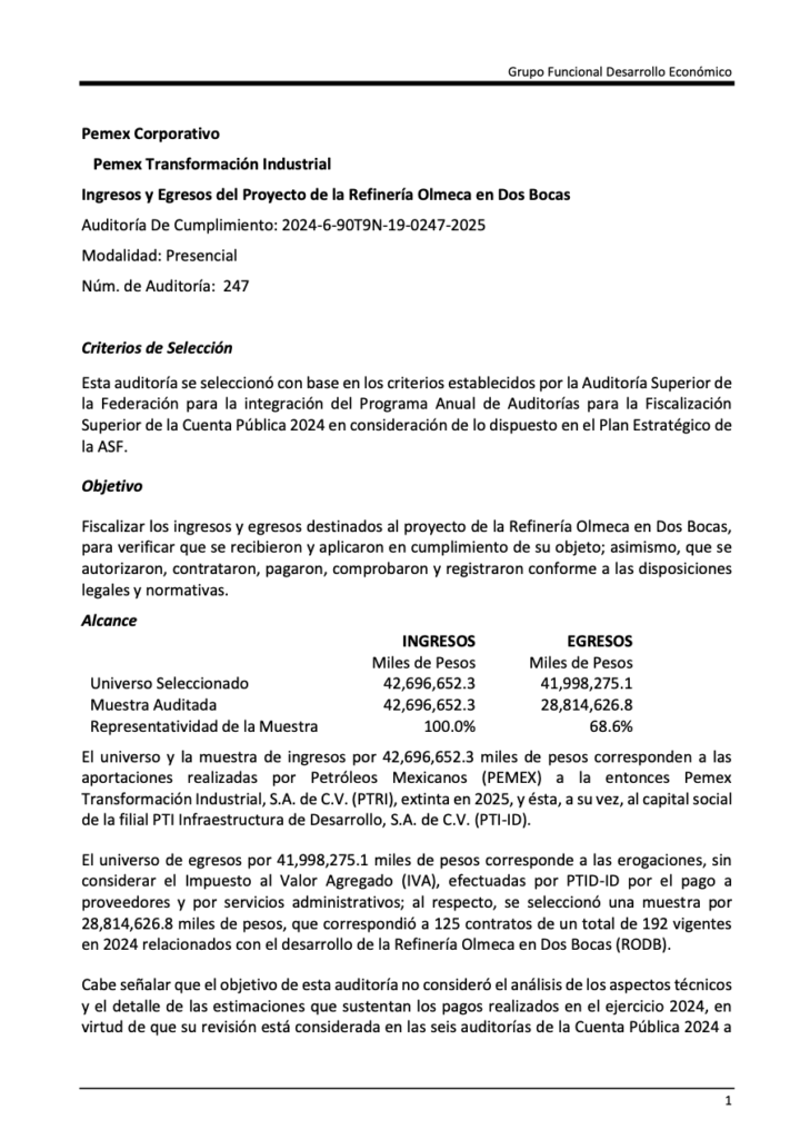 Denuncia al 9933989844… 🚩⚠️‼️¡Pemex inyectó 42,696 MDP a construcción de refinería Olmeca: ASF 2024! En la ronda de 31 auditorías a la cuenta pública de @Pemex en el ejercicio del año 2024, la Auditoría Superior de la Federación (ASF), que ahora dirige Aureliano Hernández Palacios Cardel, revisó los ingresos y egresos destinados al proyecto de la Refinería Olmeca en Dos Bocas, Tabasco, y detectó diversas deficiencias administrativas en los procesos de control, contratación y pago, aunque concluyó, de acuerdo con la Auditoría de Cumplimiento: 2024-6-90T9N-19-0247-2025. Dicha auditoría de cumplimiento número 247, correspondiente a la Cuenta Pública 2024, examinó un universo de ingresos por 42 mil 696 millones 652.3 mil pesos y egresos por 41 mil 998 millones 275.1 mil pesos relacionados con la construcción de la refinería. Del total de egresos se revisó una muestra de 28 mil 814 millones 626.8 mil pesos, equivalente al 68.6 por ciento, vinculada a 125 contratos de un total de 192 vigentes durante 2024. Los ingresos auditados correspondieron a aportaciones realizadas por @Pemex a la entonces @Pemex Transformación Industrial (PTRI), que a su vez capitalizó a su filial PTI Infraestructura de Desarrollo (PTI-ID), responsable de la construcción del proyecto. Durante 2024, @Pemex realizó 17 aportaciones por un monto total de 42 mil 696 millones 652.3 mil pesos. De ese total, seis transferencias se efectuaron en moneda nacional por 15 mil 117 millones 812.4 mil pesos y once en dólares por mil 650 millones 80.9 mil dólares, equivalentes a 27 mil 578 millones 839.9 mil pesos al tipo de cambio correspondiente a cada operación. La ASF también verificó la formalización de 291 instrumentos jurídicos durante 2024, así como la entrega oportuna de 309 garantías relacionadas con cumplimiento contractual, anticipos, calidad de los trabajos y vicios ocultos. Asimismo, revisó procedimientos de contratación vinculados con seis contratos y diez órdenes de suministro derivadas de tres contratos marco, cuyo importe contratado ascendió a 657 millones 753.4 mil pesos, con pagos efectuados por 589 millones 71.9 mil pesos. Dentro de la revisión financiera también se constató la gestión realizada por PTI-ID para recuperar saldos a favor del Impuesto al Valor Agregado, cuyo monto acumulado alcanzó 14 mil 463 millones 214 mil pesos. En el análisis de los controles internos y procesos administrativos, la ASF identificó diversas áreas de mejora. Entre las observaciones detectadas se encontró que algunos instrumentos contractuales no incorporaron aspectos específicos relacionados con el seguimiento de los trabajos, incumplimientos, finiquitos y otros elementos administrativos necesarios para una adecuada supervisión de los contratos. A pesar de las aclaraciones presentadas por la entidad fiscalizada durante la revisión, la observación se mantuvo al considerar que dichas disposiciones continúan sin incluir esos elementos de forma precisa. Asimismo, la auditoría detectó retrasos en el pago de algunas obligaciones contractuales. La auditoría detectó retrasos en 122 contratos de entre 1 y 454 días, además de siete casos específicos en servicios administrativos con retrasos de entre uno y cinco días posteriores al plazo pactado de 20 días posteriores a la recepción de la documentación correspondiente por parte de PTI-ID. En materia de control interno, la ASF también determinó que existen áreas susceptibles de fortalecimiento para mejorar la gestión administrativa y el seguimiento documental de los contratos vinculados con el proyecto. Como resultado de la revisión se emitieron 15 resultados de auditoría. De ellos, 11 no presentaron irregularidades, mientras que los cuatro restantes derivaron en tres recomendaciones dirigidas a fortalecer los controles administrativos, mejorar la integración de los instrumentos jurídicos y robustecer los mecanismos de seguimiento en la gestión contractual del proyecto. La auditoría fue concluida el 27 de enero de 2026 y los resultados fueron comunicados a la entidad fiscalizada para que, en un plazo de 30 días hábiles, presente la información y consideraciones correspondientes. Las recomendaciones emitidas quedarán sujetas al proceso de seguimiento por parte de la ASF, que determinará si las observaciones son solventadas o derivan en acciones adicionales conforme al marco jurídico aplicable. Atención @Claudiashein @MarcelaVilleg15 @CNE_Mex @SENER_mx @GobiernoMX @FGRmexico @LuzElena_GE @ASF_Mexico  @SCJN @STPS_mx @Tu_IMSS @SEMARNAT_mx @agencia_asea @CENAGAS_mx @IMPetroleo @SATMX @Hacienda_Mexico @BuenGobierno_mx @Centrofcrl #OIC #UIF #OmarReyesColmenares …Zas!!!