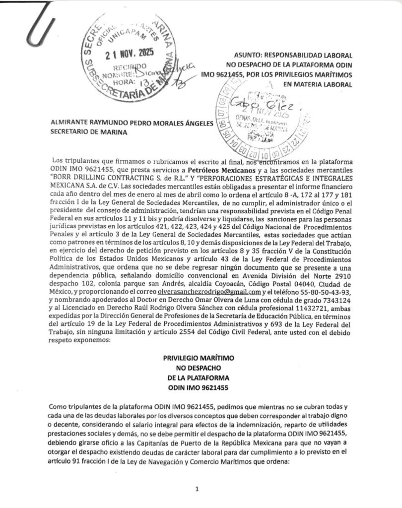 Denuncia al 9933989844… 🚩⚠️🧑‍🏭‼️¡Plataforma ODIN/BORR, exigen no despacho por adeudos a trabajadores!; tripulantes de la plataforma Odin (IMO 9621455) de Borr Drilling, contratada por @Pemex , exigen respeto a sus derechos laborales y el pago de todas las deudas pendientes con los trabajadores y empresas contratistas relacionadas, ya que pretenden sacar el armatoste fuera del país sin cubrir salarios completos, prestaciones, utilidades, indemnizaciones y otros conceptos que por ley les corresponden, por lo que presentaron una solicitud formal ante la Secretaría de Marina una solicitud de “Privilegio Marítimo – no despacho de la plataforma Odin IMO 9621455” (aquí datado), lo que significa que pedimos que la plataforma no pueda ser despachada ni autorizada para operar hasta que las empresas cubran cada una de las deudas laborales que mantienen con la tripulación; solicitud respaldada en en la Ley Federal del Trabajo (LFT) y Ley de Navegación y Comercio Marítimos (Artículo 91 Fracción I), Código Civil Federal, Ley General de Sociedades Mercantiles, Derechos Constitucionales de Petición y Justicia, mediante un documento sellado y recibido por la Secretaría de Marina con fecha 21 de noviembre de 2025, donde se detalla la responsabilidad legal de las empresas involucradas, por lo que hacen un llamado a las autoridades pertinentes;atención @Claudiashein @MarcelaVilleg15 @CNE_Mex @SENER_mx @GobiernoMX @FGRmexico @LuzElena_GE @ASF_Mexico  @SCJN @STPS_mx @Tu_IMSS @SEMARNAT_mx @agencia_asea @CENAGAS_mx @IMPetroleo @SATMX @Hacienda_Mexico @BuenGobierno_mx @Centrofcrl #OIC #UIF #OmarReyesColmenares …Zas!!!