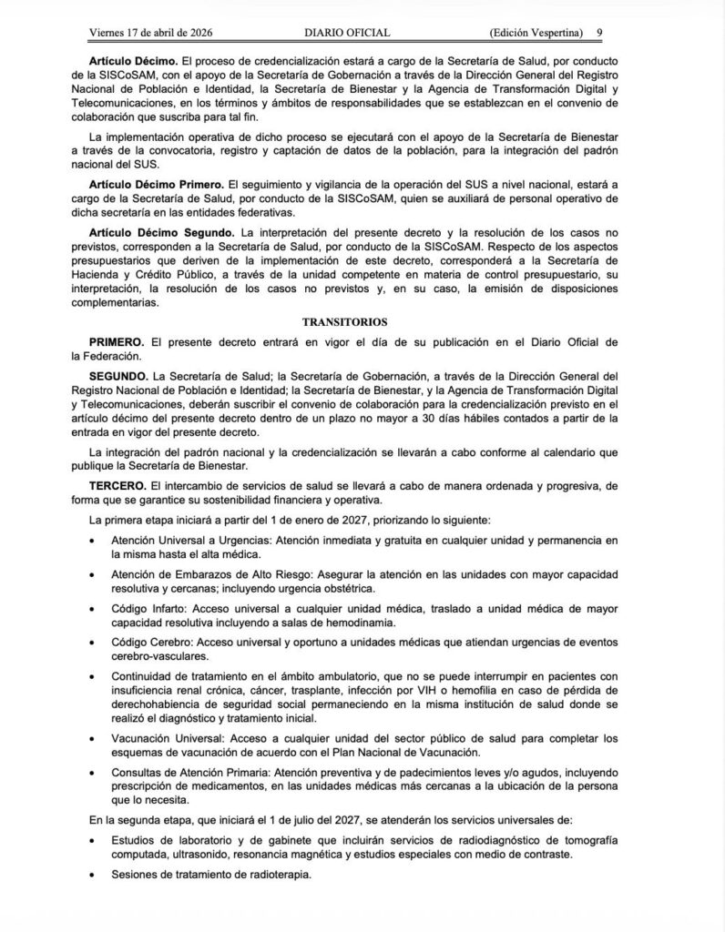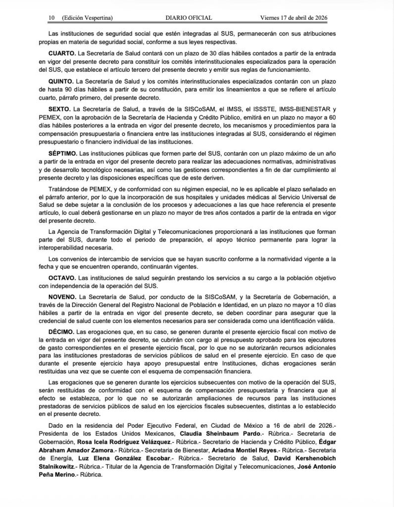 Denuncia al 9933989844… 📷📷📷📷📷¡Por decreto, PEMEX se une al Servicio Universal de Salud (SUS), a pesar del rechazo jurídico! El decreto que crea el Servicio Universal de Salud (SUS), publicado el viernes 17 de abril de 2026, en la edición vespertina del Diario Oficial de la Federación, terminó por formalizar la integración de @Pemex a una red nacional obligatoria de servicios médicos, pese a que, apenas once días antes, la propia Dirección Jurídica de la petrolera nacional advirtió por escrito que esa incorporación es técnicamente inviable y jurídicamente riesgosa. La nueva política de salud se presenta como un paso hacia la universalización del acceso médico, pero arranca con una contradicción de origen, pues el Gobierno Federal ordena sumar los hospitales y unidades médicas de @Pemex al SUS mientras el área legal de la Empresa Productiva del Estado argumenta que su marco jurídico, su régimen laboral y su situación financiera no permiten utilizar su infraestructura como un servicio público general sin modificar a fondo leyes, contratos colectivos y reglas presupuestarias, como lo detalló en el oficio DJ-DGMI-033-2026 la Dirección Jurídica @Pemex , el pasado 6 de abril de 2026, escrito dirigido al subdirector de Servicios de Salud (SSS), Ruy López Ridaura. El decreto, firmado por la presidenta el 16 de abril y vigente desde su publicación el día 17, crea el Servicio Universal de Salud (SUS) como un mecanismo obligatorio de coordinación e integración operativa entre las instituciones federales que prestan servicios médicos y las entidades federativas que decidan adherirse. El artículo primero define al SUS como una red destinada a garantizar el derecho a los servicios de salud del pueblo de México con criterios de acceso universal, progresivo, efectivo, oportuno, continuo, de calidad y sin discriminación, condicionando la participación de cada institución a su capacidad instalada, financiera y presupuestaria. En los fundamentos se apela a la Constitución, a la Ley General de Salud, a la Ley del Seguro Social, a la Ley del ISSSTE, al Plan Nacional de Desarrollo 2025‑2030 y al Programa Sectorial de Salud 2025‑2030, que fijan como objetivos centrales la universalización del acceso y la integración de una red única de servicios. El artículo segundo detalla que la red del SUS estará integrada por la capacidad instalada del IMSS, el ISSSTE, IMSS‑Bienestar, los hospitales y unidades médicas de @Pemex , los Hospitales Federales de Referencia, los Institutos Nacionales de Salud, las unidades a cargo de la Comisión Coordinadora de Institutos Nacionales de Salud y Hospitales de Alta Especialidad (CCINSHAE) y los servicios de salud de los estados que se sumen. Esta red operará mediante intercambio de servicios de salud a partir de un esquema de compensación presupuestaria y financiera: la institución a la que pertenece la persona atendida deberá compensar los gastos de la institución que otorga el servicio, bajo reglas que deberán emitir Salud, Hacienda y los organismos participantes. El decreto subraya que esta coordinación debe darse “sin perjuicio” de la capacidad financiera de cada entidad y sin menoscabo de la calidad de los servicios a su población propia, aunque, en los hechos, obliga a todas a abrir su infraestructura a usuarios ajenos. La Secretaría de Salud, a través de la Subsecretaría de Integración Sectorial y Coordinación de Servicios de Atención Médica (SISCoSAM), queda como autoridad rectora del SUS y presidirá comités interinstitucionales especializados donde participarán representantes del IMSS, ISSSTE, IMSS‑Bienestar, Pemex, los institutos y demás instituciones integradas. Estos comités tendrán facultades para proponer y acordar estrategias, acciones y normativa para la implementación, operación, supervisión y mejora continua del SUS, incluyendo las reglas de acceso, los criterios de intercambio de servicios, la coordinación financiera y la interoperabilidad digital. De esta forma, @Pemex se ve formalmente incorporada a un esquema colegiado donde decisiones sobre el uso de sus hospitales y recursos médicos se tomarán junto al resto del sector salud, bajo conducción de la Secretaría de Salud. Uno de los pilares del nuevo servicio es la creación de una credencial de salud y de un expediente clínico electrónico nacional, asociados a la CURP de cada persona. El decreto ordena integrar un padrón nacional administrado por Salud, con apoyo de la Secretaría de Gobernación mediante el Registro Nacional de Población e Identidad, de la Secretaría de Bienestar y de la Agencia de Transformación Digital y Telecomunicaciones, a fin de credencializar a la población y permitir que, en cualquier unidad de la red, el personal médico tenga acceso en tiempo real al historial clínico del paciente. Se prevé incluso que la credencial tenga dos códigos QR: uno para verificar la adscripción a institución de seguridad social o al SUS, y otro para validar los datos de identidad de la persona. La ruta de implementación será gradual, pero está calendarizada. La primera etapa de intercambio de servicios iniciará el 1 de enero de 2027 e incluirá atención universal a urgencias con permanencia hasta el alta médica, atención de embarazos de alto riesgo, protocolos de “código infarto” y “código cerebro”, continuidad de tratamientos ambulatorios para padecimientos graves como insuficiencia renal crónica, cáncer, trasplantes, VIH o hemofilia en caso de pérdida de derechohabiencia, así como vacunación universal y consultas de atención primaria. Una segunda etapa, a partir del 1 de julio de 2027, incorporará estudios de laboratorio y gabinete de mayor complejidad, incluyendo tomografías computadas, ultrasonido, resonancia magnética y radioterapia, entre otros servicios. En materia financiera, el decreto ordena que las instituciones integradas al SUS presupuesten cada año los r